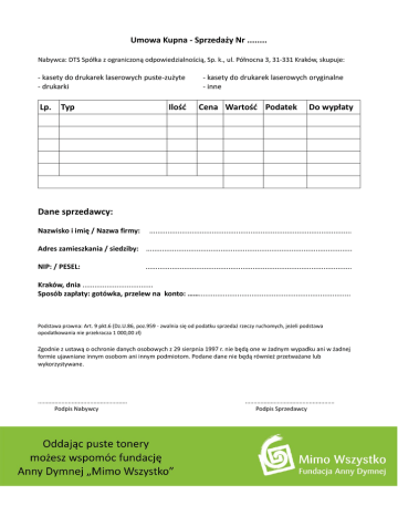 Umowa Kupna - Sprzedaży Nr ........ Nabywca: DTS Spółka z ograniczoną odpowiedzialnością, Sp. k., ul. Północna 3, 31-331 Kraków, skupuje: - kasety do drukarek laserowych puste-zużyte - drukarki Lp. Typ Ilość - kasety do drukarek laserowych oryginalne - inne Cena Wartość Podatek Do wypłaty Dane sprzedawcy: Nazwisko i imię / Nazwa firmy: .................................................................................................... Adres zamieszkania / siedziby: ...................................................................................................... NIP: / PESEL: ...................................................................................................... Kraków, dnia ................................... Sposób zapłaty: gotówka, przelew na konto: ……........................................................................... Podstawa prawna: Art. 9 pkt.6 (Dz.U.86, poz.959 - zwalnia się od podatku sprzedaż rzeczy ruchomych, jeżeli podstawa opodatkowania nie przekracza 1 000,00 zł) Zgodnie z ustawą o ochronie danych osobowych z 29 sierpnia 1997 r. nie będą one w żadnym wypadku ani w żadnej formie ujawniane innym osobom ani innym podmiotom. Podane dane nie będą również przetważane lub wykorzystywane. ..................................................... Podpis Nabywcy ..................................................... Podpis Sprzedawcy Umowa Kupna - Sprzedaży Nr ........ Nabywca: DTS Spółka z ograniczoną odpowiedzialnością, Sp. k., ul. Północna 3, 31-331 Kraków, skupuje: - kasety do drukarek laserowych puste-zużyte - drukarki Lp. Typ Ilość - kasety do drukarek laserowych oryginalne - inne Cena Wartość Podatek Do wypłaty Dane sprzedawcy: Nazwisko i imię / Nazwa firmy: .................................................................................................... Adres zamieszkania / siedziby: ...................................................................................................... NIP: / PESEL: ...................................................................................................... Kraków, dnia ................................... Sposób zapłaty: gotówka, przelew na konto: ……........................................................................... Podstawa prawna: Art. 9 pkt.6 (Dz.U.86, poz.959 - zwalnia się od podatku sprzedaż rzeczy ruchomych, jeżeli podstawa opodatkowania nie przekracza 1 000,00 zł) Zgodnie z ustawą o ochronie danych osobowych z 29 sierpnia 1997 r. nie będą one w żadnym wypadku ani w żadnej formie ujawniane innym osobom ani innym podmiotom. Podane dane nie będą również przetważane lub wykorzystywane. ..................................................... Podpis Nabywcy ..................................................... Podpis Sprzedawcy