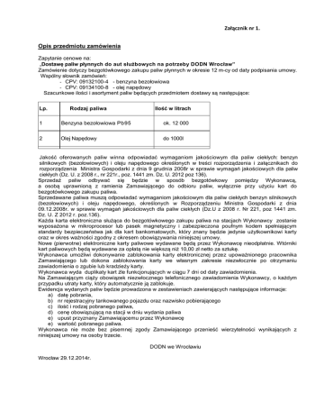 Załącznik nr 1. Opis przedmiotu zamówienia Zapytanie cenowe na: „Dostawę paliw płynnych do aut służbowych na potrzeby DODN Wrocław” Zamówienie dotyczy bezgotówkowego zakupu paliw płynnych w okresie 12 m-cy od daty podpisania umowy. Wspólny słownik zamówień: - CPV: 09132100-4 - benzyna bezołowiowa - CPV: 09134100-8 - olej napędowy Szacunkowe ilości i asortyment paliw będących przedmiotem dostawy są następujące: Lp. Rodzaj paliwa Ilość w litrach 1 Benzyna bezołowiowa Pb95 ok. 12 000 2 Olej Napędowy do 1000l Jakość oferowanych paliw winna odpowiadać wymaganiom jakościowym dla paliw ciekłych: benzyn silnikowych (bezołowiowych) i oleju napędowego określonych w treści rozporządzenia i załącznikach do rozporządzenia Ministra Gospodarki z dnia 9 grudnia 2008r w sprawie wymagań jakościowych dla paliw ciekłych (Dz. U. z 2008 r., nr 221r., poz. 1441 zm. Dz. U. 2012 poz 136). Sprzedaż paliw odbywać się będzie w sposób bezgotówkowy pomiędzy Wykonawcą, a osobą uprawnioną z ramienia Zamawiającego do odbioru paliw, wyłącznie przy użyciu kart do bezgotówkowego zakupu paliwa. Sprzedawane paliwa muszą odpowiadać wymaganiom jakościowym dla paliw ciekłych benzyn silnikowych (bezołowiowych) i oleju napędowego, określonych w Rozporządzeniu Ministra Gospodarki z dnia 09.12.2008r. w sprawie wymagań jakościowych dla paliw ciekłych (Dz.U z 2008 r. Nr 221, poz 1441 zm. Dz. U. Z 2012 r. poz.136). Każda karta elektroniczna służąca do bezgotówkowego zakupu paliwa na stacjach Wykonawcy zostanie wyposażona w mikroprocesor lub pasek magnetyczny i zabezpieczona poufnym kodem spełniającym standardy bezpieczeństwa jak dla kart bankomatowych, który znany będzie jedynie użytkownikowi karty oraz w okres ważności zgodny z okresem obowiązywania niniejszej umowy. Nowe (pierwotne) elektroniczne karty paliwowe wydawane będą przez Wykonawcę nieodpłatnie. Wtórniki kart paliwowych będą wydawane za opłatą nie większą niż 10,00 zł netto za sztukę. Wykonawca umożliwi dokonywanie zablokowania karty elektronicznej przez upoważnionego pracownika Zamawiającego lub dokona zablokowania karty we własnym zakresie niezwłocznie po otrzymaniu zawiadomienia o zgubie lub kradzieży karty. Wykonawca wyda duplikaty kart źle funkcjonujących w ciągu 7 dni od daty zawiadomienia. Na Zamawiającym ciąży obowiązek niezwłocznego telefonicznego zawiadomienia Wykonawcy, o każdym przypadku utraty karty, który automatycznie ją zablokuje. Ewidencja wydanych paliw będzie prowadzona w zestawieniach zawierających następujące informacje: a) datę pobrania, b) nr rejestracyjny tankowanego pojazdu oraz nazwisko pobierającego c) ilość i rodzaj pobranego paliwa, d) cenę obowiązującą na stacji w dniu wydania paliwa e) upust przyznany Zamawiającemu przez Wykonawcę e) wartość pobranego paliwa. Wykonawca nie może bez pisemnej zgody Zamawiającego przenieść wierzytelności wynikających z niniejszej umowy na osoby trzecie. DODN we Wrocławiu Wrocław 29.12.2014r.