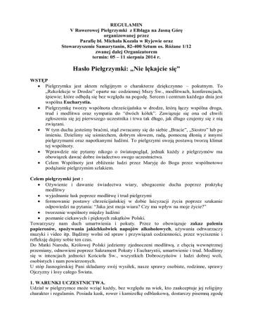 REGULAMIN V Rowerowej Pielgrzymki z Elbląga na Jasną Górę organizowanej przez Parafię bł. Michała Kozala w Ryjewie oraz Stowarzyszenie Samarytanin, 82-400 Sztum os. Różane 1/12 zwanej dalej Organizatorem termin: 05 – 11 sierpnia 2014 r. Hasło Pielgrzymki: „Nie lękajcie się” WSTĘP Pielgrzymka jest aktem religijnym o charakterze dziękczynno – pokutnym. To „Rekolekcje w Drodze” oparte na: codziennej Mszy Św., modlitwach, konferencjach, śpiewie; które odbędą się bez względu na pogodę. Sercem i centrum każdego dnia jest wspólna Eucharystia. Pielgrzymkę tworzy wspólnota chrześcijańska w drodze, którą łączy wspólna droga, trud i modlitwa oraz sympatia do “dwóch kółek”. Zawiązuje się ona od chwili zgłoszenia się jej pierwszego uczestnika i trwa tak długo, jak długo czujemy się z nią związani. W tym duchu jesteśmy braćmi, stąd zwracamy się do siebie „Bracie”, „Siostro” lub po imieniu. Dzielimy się uśmiechem, dobrym słowem, radą, pomocną dłonią z innymi pielgrzymami oraz napotkanymi ludźmi. To pielgrzymi swoją postawą tworzą klimat tej wspólnoty. Wprawdzie nie pytamy nikogo o światopogląd, jednak każdy z pielgrzymów ma obowiązek dawać dobre świadectwo swego uczestnictwa. Celem Wspólnoty jest zbliżenie ludzi przez Maryję do Boga przez wspólnotowe podążanie pielgrzymim szlakiem. Celem pielgrzymki jest : Ożywienie i dawanie świadectwa wiary, ubogacenie ducha poprzez praktykę modlitwy wyjednanie łask poprzez modlitwę i trud pielgrzymi formowanie postawy chrześcijańskiej w dobie laicyzacji życia poprzez szukanie odpowiedzi na pytania: “Jaka jest moja wiara? Czy ma wpływ na moje życie?” tworzenie wspólnoty między ludźmi poznanie ciekawych i pięknych zakątków Polski. Towarzyszy nam duch umartwienia i pokuty. Przez to obowiązuje zakaz palenia papierosów, spożywania jakichkolwiek napojów alkoholowych, używania odtwarzaczy muzyki i video itp. Bądźmy wolni od spraw i przywiązań codzienności, przez wyciszenie i refleksję dajmy sobie ten czas. Do Matki Narodu, Królowej Polski jedziemy zjednoczeni modlitwą, z chęcią wewnętrznej przemiany, odnowieni poprzez Sakrament Pokuty i Eucharystii, umartwienie i trud. Modlimy się w intencjach jedności Kościoła Św., wszystkich Dobroczyńców i ludzi dobrej woli, osobistych i nam powierzonych. U stóp Jasnogórskiej Pani składamy swój wysiłek, nasze sprawy osobiste, rodzinne, sprawy Ojczyzny i losy całego Świata. 1. WARUNKI UCZESTNICTWA. Udział w pielgrzymce może wziąć każdy, bez względu na wiek, kto zaakceptuje jej religijny charakter i regulamin. Posiada kask, rower i kamizelkę odblaskową, dostarczy pisemną zgodę lekarza, dostarczy pisemną zgodę rodziców lub opiekunów, dokona zgłoszenia, zapłaci opłatę pielgrzymkową oraz podporządkuje się poleceniom organizatora. Fizycznie jest przygotowany pokonać dziennie na rowerze ok. 60-70 km. 2. SPOSÓB PIELGRZYMOWANIA. §1. W czasie jazdy każdy z uczestników ma obowiązek mieć założony na głowie kask oraz kamizelkę odblaskową i dbać o bezpieczeństwo swoje i innych. §2. Każdy z uczestników ma obowiązek noszenia identyfikatora na sobie, w widocznym miejscu, gdyż ułatwia to utrzymanie porządku pielgrzymki. §3. Uczestnicy będą się poruszać w grupach do 15 – osobowych, w jednorzędowej lub dwurzędowej kolumnie pod kierownictwem przewodników oraz (prowadzącego, zamykającego), których wyznacza organizator. Dla sprawnego i bezpiecznego przejazdu obowiązuje zbiorowa dyscyplina i bezwzględne posłuszeństwo przewodnikowi grupy, który jest odpowiedzialny za bezpieczeństwo powierzonych mu osób (szczególnie niepełnoletnich). O miejscu i czasie trwania odpoczynku decyduje Organizator pielgrzymki. §4. Istnieje obowiązek poruszania się tylko w grupie, do której został przydzielony. Niedopuszczalne jest samowolne opuszczanie grupy, bez powiadomienia o tym jej przewodnika. Na zmianę grupy należy uzyskać zgodę przewodników grup (zmienianej i tej, do której następuje zamiana). Przejazd odbywać się będzie po drogach publicznych i w ruchu otwartym, dlatego należy bezwzględnie przestrzegać przepisów ruchu drogowego i wskazań służby Pilotażu. §5. Jazda odbywa się w ustalonym przed wyruszeniem na trasę tempie i porządku. Podczas jazdy przewodnik grupy ustala prędkość, sposób podjazdu pod wzniesienia (rozpędzanie się) i zjazdu ze wzniesień (hamowanie). W czasie jazdy odstęp pomiędzy rowerami w grupie powinien być większy niż 1 m. Odległość pomiędzy grupami powinna wynosić 200 m. Podczas jazdy grupa nie wyprzedza innej znajdującej się w ruchu. Całość zamyka samochód Organizatora. §6. W razie awarii roweru należy powiadomić przewodnika grupy i zamykającego o zaistniałej sytuacji, zjechać na pobocze drogi, usunąć awarię i dołączyć do najbliższej grupy jadąc z nią do postoju i tam dopiero dołączyć do swojej grupy powiadamiając o swoim powrocie przewodnika. pielgrzym NIE DOGANIA SWOJEJ GRUPY Jeżeli nie można usunąć awarii doraźnymi środkami to należy zaczekać na zamykający całość samochód Organizatora, który zabierze uszkodzony sprzęt. §7. W przypadku nagłego zatrzymania z powodu wypadku, (karambolu), itp. cała grupa natychmiast opuszcza jezdnię, schodząc na pobocze, skraj drogi lub przyległy wolny teren tak, aby nie tamować ruchu i by inne grupy mogły bezpiecznie przejechać. Udziela pomocy poszkodowanym z zachowaniem warunków bezpieczeństwa. Inne grupy jadą dalej realizując plan dnia. §8. W przypadku wystąpienia jakichkolwiek dolegliwości zdrowotnych na trasie należy o nich bezzwłocznie powiadomić przewodnika grupy. §9. Zabrania się jazdy “bez trzymanki” tj. bez obu rąk na kierownicy. Zabrania się w czasie jazdy używania telefonów komórkowych!!!!. Korzystanie z telefonu komórkowego podczas jazdy łączy się z natychmiastowym wykluczeniem z pielgrzym