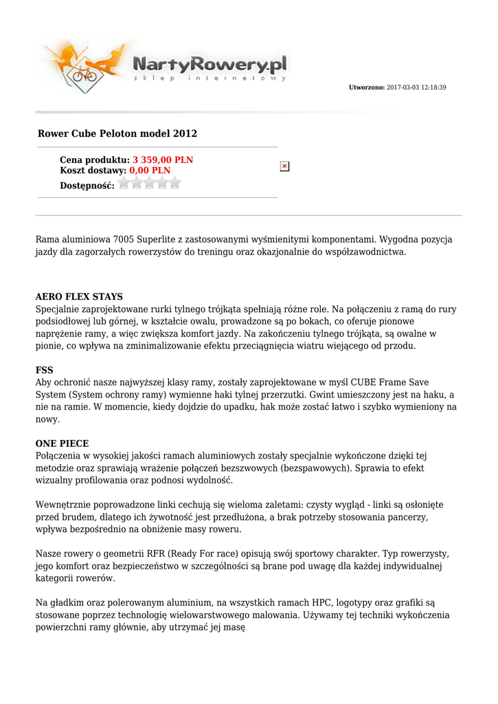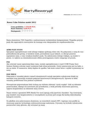 Utworzono: 2017-03-03 12:18:39 Rower Cube Peloton model 2012 Cena produktu: 3 359,00 PLN Koszt dostawy: 0,00 PLN Dostępność: Rama aluminiowa 7005 Superlite z zastosowanymi wyśmienitymi komponentami. Wygodna pozycja jazdy dla zagorzałych rowerzystów do treningu oraz okazjonalnie do współzawodnictwa. AERO FLEX STAYS Specjalnie zaprojektowane rurki tylnego trójkąta spełniają różne role. Na połączeniu z ramą do rury podsiodłowej lub górnej, w kształcie owalu, prowadzone są po bokach, co oferuje pionowe naprężenie ramy, a więc zwiększa komfort jazdy. Na zakończeniu tylnego trójkąta, są owalne w pionie, co wpływa na zminimalizowanie efektu przeciągnięcia wiatru wiejącego od przodu. FSS Aby ochronić nasze najwyższej klasy ramy, zostały zaprojektowane w myśl CUBE Frame Save System (System ochrony ramy) wymienne haki tylnej przerzutki. Gwint umieszczony jest na haku, a nie na ramie. W momencie, kiedy dojdzie do upadku, hak może zostać łatwo i szybko wymieniony na nowy. ONE PIECE Połączenia w wysokiej jakości ramach aluminiowych zostały specjalnie wykończone dzięki tej metodzie oraz sprawiają wrażenie połączeń bezszwowych (bezspawowych). Sprawia to efekt wizualny profilowania oraz podnosi wydolność. Wewnętrznie poprowadzone linki cechują się wieloma zaletami: czysty wygląd - linki są osłonięte przed brudem, dlatego ich żywotność jest przedłużona, a brak potrzeby stosowania pancerzy, wpływa bezpośrednio na obniżenie masy roweru. Nasze rowery o geometrii RFR (Ready For race) opisują swój sportowy charakter. Typ rowerzysty, jego komfort oraz bezpieczeństwo w szczególności są brane pod uwagę dla każdej indywidualnej kategorii rowerów. Na gładkim oraz polerowanym aluminium, na wszystkich ramach HPC, logotypy oraz grafiki są stosowane poprzez technologię wielowarstwowego malowania. Używamy tej techniki wykończenia powierzchni ramy głównie, aby utrzymać jej masę PRZED ZŁOŻENIEM ZAMÓWIENIA PROSIMY O KONTAKT Z OBSŁUGĄ SKLEPU INTERNETOWEGO W CELU POTWIERDZENIA DOSTĘPNOŚCI WYBRANEGO PRZEZ PAŃSTWA ROWERU. Sugerowane rozmiary ram dla rowerów szosowych : Długość nogi Klasyczny Opadający 76 48 - 50 44 83 52 - 54 48 90 56 - 58 52 97 60 - 62 56 Dlaczego warto wybrać sklep NartyRowery.pl ? ● ● ● ● ● ● ● ● ● ● ● ● ● Darmowa Przesyłka Kurierska dla zamówień już od 400 PLN Szybka dostawa w 24h Możliwość zwrotu lub wymiany towaru w ciągu 10 dni od zakupu W naszym sklepie internetowym są tylko aktualnie dostępne produkty (zredukowaliśmy do minimum ryzyko braku dostępności zamówionego towaru) Możliwość negocjacji cen Częste promocje i rabaty ( obniżki cen, rabat na akcesoria, gratisy do rowerów) Fachowe doradztwo Pozytywne opinie w niezależnych serwisach m.in. Opineo, Allegro i porównywarkach cen Możliwość zakupu na raty - obsługujemy systemy Żagiel i Cetelem Sprzedajemy rowery wyregulowane i przesmarowane Do każdego zamówienia otrzymasz paragon lub fakturę stanowiący podstawę gwarancji Szczegółowe informacje o statusie zamówienia i wysyłce na adres e-mail podany w zamówieniu Obsługujemy płatności internetowe i Paypal Dołożono wszelkich starań, aby opisy i zdjęcia produktów były dokładne i aktualne. Specyfikacje i ceny mogą ulec zmianie bez uprzedzenia Płeć Przeznaczenie Męski Szosowy Widelec/ amortyzator CUBE CL Race Carbon, 1_1/8"1_1/2" Manetki Shimano Sora ST-3400, 9-speed Przerzutka przód Shimano Sora FD-3400BL triple, clamp 34.9mm Przerzutka tył Shimano Sora RD-3400GS Kaseta/ wolnobieg Korbowód Pedały Hamulce b.d. Shimano Sora FC3403 50x39x30T, integrated BB brak Shimano Sora BR-3400 Piasta przód Shimano WH-R501 Piasta tył Shimano WH-R501 Obręcze Shimano WH-R501 Szprychy Shimano WH-R501 Kolekcja 2012 Opony Impac RR SV28 Stery FSA Orbit Z-T Eco, semi-intergrated Mostek EASTON EA30 Oversized Kierownica EASTON EA30 Oversized Chwyty CUBE Grip Control Siodło b.d. Sztyca EASTON EA30 31.6mm Waga 9,1 kg Rama Alu Superlite 6061 AMF Double Butted, RFR-Geometry, inner cable routing Hamulce V-Brake Damper - Pegi - Ilość biegów 27 Łańcuch b.d. Gwarancja Adres: http://nartyrowery.pl/ 2 lata (rama i osprzęt) Telefon: 34 365 66 09, 793 61 04 29 Email: [email protected] Gadu-Gadu: Skype: