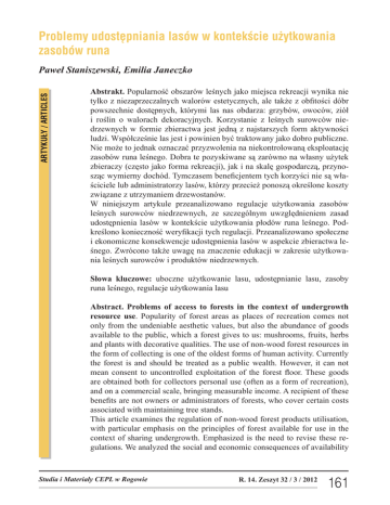 Problemy udostępniania lasów w kontekście użytkowania zasobów runa ARTYKUŁY / ARTICLES Paweł Staniszewski, Emilia Janeczko Abstrakt. Popularność obszarów leśnych jako miejsca rekreacji wynika nie tylko z niezaprzeczalnych walorów estetycznych, ale także z obfitości dóbr powszechnie dostępnych, którymi las nas obdarza: grzybów, owoców, ziół i roślin o walorach dekoracyjnych. Korzystanie z leśnych surowców niedrzewnych w formie zbieractwa jest jedną z najstarszych form aktywności ludzi. Współcześnie las jest i powinien być traktowany jako dobro publiczne. Nie może to jednak oznaczać przyzwolenia na niekontrolowaną eksploatację zasobów runa leśnego. Dobra te pozyskiwane są zarówno na własny użytek zbieraczy (często jako forma rekreacji), jak i na skalę gospodarczą, przynosząc wymierny dochód. Tymczasem beneficjentem tych korzyści nie są właściciele lub administratorzy lasów, którzy przecież ponoszą określone koszty związane z utrzymaniem drzewostanów. W niniejszym artykule przeanalizowano regulacje użytkowania zasobów leśnych surowców niedrzewnych, ze szczególnym uwzględnieniem zasad udostępnienia lasów w kontekście użytkowania płodów runa leśnego. Podkreślono konieczność weryfikacji tych regulacji. Przeanalizowano społeczne i ekonomiczne konsekwencje udostępnienia lasów w aspekcie zbieractwa leśnego. Zwrócono także uwagę na znaczenie edukacji w zakresie użytkowania leśnych surowców i produktów niedrzewnych. Słowa kluczowe: uboczne użytkowanie lasu, udostępnianie lasu, zasoby runa leśnego, regulacje użytkowania lasu Abstract. Problems of access to forests in the context of undergrowth resource use. Popularity of forest areas as places of recreation comes not only from the undeniable aesthetic values, but also the abundance of goods available to the public, which a forest gives to us: mushrooms, fruits, herbs and plants with decorative qualities. The use of non-wood forest resources in the form of collecting is one of the oldest forms of human activity. Currently the forest is and should be treated as a public wealth. However, it can not mean consent to uncontrolled exploitation of the forest floor. These goods are obtained both for collectors personal use (often as a form of recreation), and on a commercial scale, bringing measurable income. A recipient of these benefits are not owners or administrators of forests, who cover certain costs associated with maintaining tree stands. This article examines the regulation of non-wood forest products utilisation, with particular emphasis on the principles of forest available for use in the context of sharing undergrowth. Emphasized is the need to revise these regulations. We analyzed the social and economic consequences of availability Studia i Materiały CEPL w Rogowie R. 14. Zeszyt 32 / 3 / 2012 161 of forest in terms of forest gathering. Also highlighted is the importance of education in the use of forest raw materials and non-wood forest products. Keywords: non-wood forest products, access to forests, forest floor resources, forest use regulations Wstęp W dokumencie Polityka leśna państwa, przyjętym przez Radę Ministrów 22 kwietnia 1997 r., podkreśla się między innymi znaczenie społecznych funkcji lasu, które służą „kształtowaniu korzystnych warunków zdrowotnych i rekreacyjnych dla społeczeństwa, wzbogacają rynek pracy, służą tworzeniu różnorodnych form użytkowania lasu przez społeczność lokalną, (...) służą rozwojowi kultury, oświaty i nauki oraz edukacji ekologicznej społeczeństwa”. Powszechną dostępność obszarów leśnych, zagwarantowaną również w ustawie o lasach, warto przeanalizować w kontekście pozyskiwania leśnych dóbr i pożytków. Pozyskiwanie drewna, głównego surowca pochodzącego z lasów, rządzi się ściśle określonymi prawami i stanowi podstawowy element gospodarki leśnej. Istnieje jednak cała sfera tzw. użytków ubocznych czy też niedrzewnych, która jest szczególnie trudna do uregulowania, ponieważ często przybiera formę niekontrolowanego zbieractwa. Ma ona również ścisłe powiązanie z pełnieniem przez lasy funkcji rekreacyjnych. Uboczne (niedrzewne) użytkowanie lasu – to korzystanie z innych niż drewno dóbr, surowców i produktów leśnych. W Polsce zakres tego pojęcia obejmuje pozyskiwanie: – użytków pochodzenia roślinnego – żywic, gum, kory, listowia, owoców leśnych, ziół leczniczych, roślin przemysłowych, dekoracyjnych itp., – grzybów jadalnych, – użytków pochodzenia zwierzęcego – zwierzyny, skór i innych produktów łowiectwa, ślimaków, produktów pszczelarstwa leśnego, jedwabnictwa itp., – użytków wydobywanych z ziemi (niezależnie od ich pierwotnego pochodzenia) – torfu, piasku, bursztynu i in. (Grochowski 1990). W literaturze europejskiej i światowej wyjątkowo rzadko spotyka się określenie „leśne użytki uboczne”; najpowszechniej stosowanym terminem jest „leśne surowce/produkty niedrzewne”, które najczęściej określa się jako „dobra biologicznego pochodzenia inne niż drewno, pochodzące z lasu, innych terenów zadrzewionych oraz z drzew rosnących poza lasami” (Mantau 2006). W leśnictwie wielofunkcyjnym pojęcie ubocznego użytkowania lasu nabiera jednak znacznie szerszego znaczenia i wykracza poza sferę surowców i produktów. Obejmuje mianowicie szeroko pojęte czerpanie trudnych do waloryzowania korzyści z lasu; ma ścisłe powiązanie z pozaprodukcyjnymi funkcjami lasu: ochronnymi, krajobrazowymi, a przede wszystkim rekreacyjnymi. Należy podkreślić, że w wielu, zwłaszcza rozwiniętych krajach Europy zachodniej, zwraca się uwagę na pewne przewartościowanie: obserwuje się spadek zainteresowania leśnymi surowcami, podkreśla się natomiast wzrastający udział korzyści wynikających z turystycznego i rekreacyjnego użytkowania lasu (Staniszewski 2007a; b). Wracając do dóbr materialnych, w