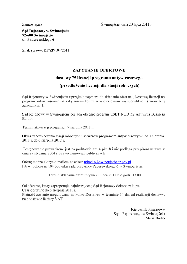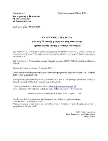 Zamawiający: Świnoujście, dnia 20 lipca 2011 r. Sąd Rejonowy w Świnoujściu 72-600 Świnoujście ul. Paderewskiego 6 Znak sprawy: KF/ZP/104/2011 ZAPYTANIE OFERTOWE dostawę 75 licencji programu antywirusowego (przedłużenie licencji dla stacji roboczych) Sąd Rejonowy w Świnoujściu uprzejmie zaprasza do składania ofert na „Dostawę licencji na program antywirusowy” na załączonym formularzu ofertowym wg specyfikacji stanowiącej załącznik nr 1. Sąd Rejonowy w Świnoujściu posiada obecnie program ESET NOD 32 Antivirus Business Edition. Termin aktywacji programu : 7 sierpnia 2011 r. Okres zabezpieczenia stacji roboczych i serwerów programem antywirusowym: od 7 sierpnia 2011 r. do 6 sierpnia 2012 r. Postępowanie prowadzone jest na podstawie art. 4 pkt. 8 i nie podlega przepisom ustawy z dnia 29 stycznia 2004 r. Prawo zamówień publicznych. Ofertę można złożyć e’mailem na adres: [email protected] lub w pokoju nr 104 budynku sądu przy ulicy Paderewskiego 6 w Świnoujściu. Termin składania ofert upływa 26 lipca 2011 r. o godz. 13.00 Od oferenta, który zaproponuje najniższą cenę Sąd Rejonowy dokona zakupu. Czas dostawy: do 6 sierpnia 2011 r. Płatność zostanie uregulowana na konto Dostawcy w terminie 14 dni od realizacji dostawy, na podstawie faktury VAT. Kierownik Finansowy Sądu Rejonowego w Świnoujściu Maria Bodio