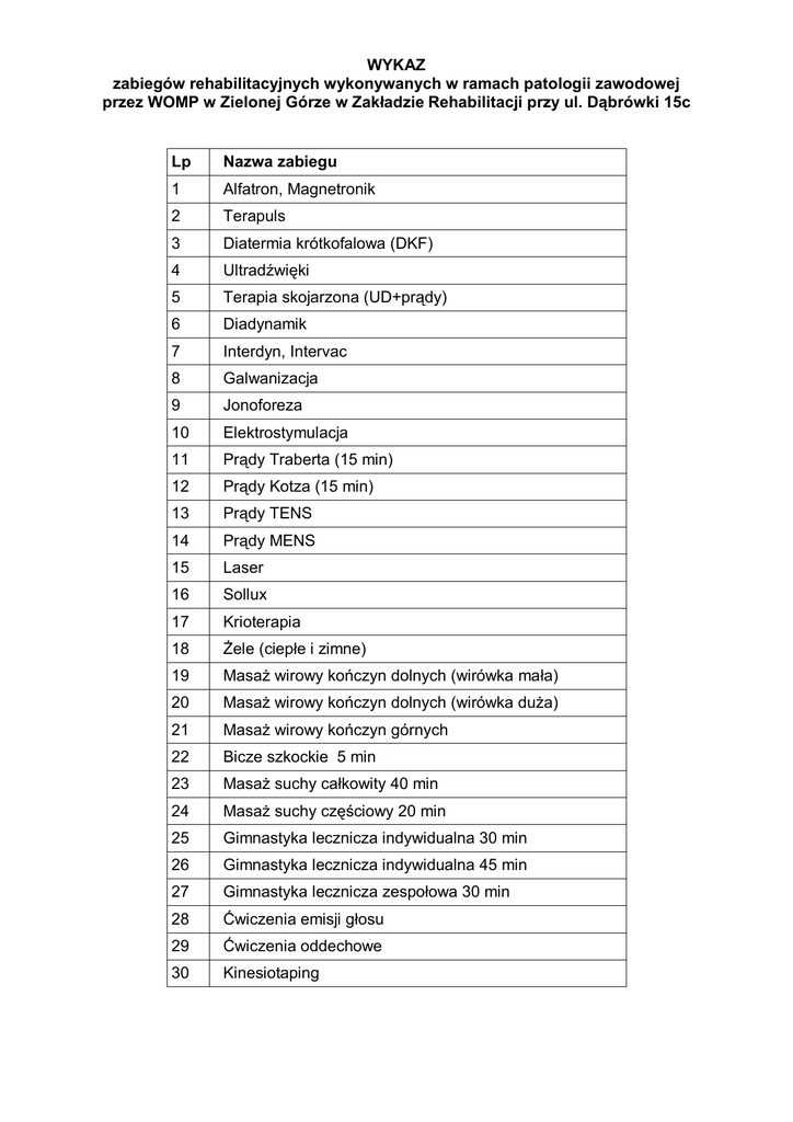 WYKAZ zabiegów rehabilitacyjnych wykonywanych w ramach patologii zawodowej przez WOMP w Zielonej Górze w Zakładzie Rehabilitacji przy ul. Dąbrówki 15c Lp Nazwa zabiegu 1 Alfatron, Magnetronik 2 Terapuls 3 Diatermia krótkofalowa (DKF) 4 Ultradźwięki 5 Terapia skojarzona (UD+prądy) 6 Diadynamik 7 Interdyn, Intervac 8 Galwanizacja 9 Jonoforeza 10 Elektrostymulacja 11 Prądy Traberta (15 min) 12 Prądy Kotza (15 min) 13 Prądy TENS 14 Prądy MENS 15 Laser 16 Sollux 17 Krioterapia 18 Żele (ciepłe i zimne) 19 Masaż wirowy kończyn dolnych (wirówka mała) 20 Masaż wirowy kończyn dolnych (wirówka duża) 21 Masaż wirowy kończyn górnych 22 Bicze szkockie 5 min 23 Masaż suchy całkowity 40 min 24 Masaż suchy częściowy 20 min 25 Gimnastyka lecznicza indywidualna 30 min 26 Gimnastyka lecznicza indywidualna 45 min 27 Gimnastyka lecznicza zespołowa 30 min 28 Ćwiczenia emisji głosu 29 Ćwiczenia oddechowe 30 Kinesiotaping