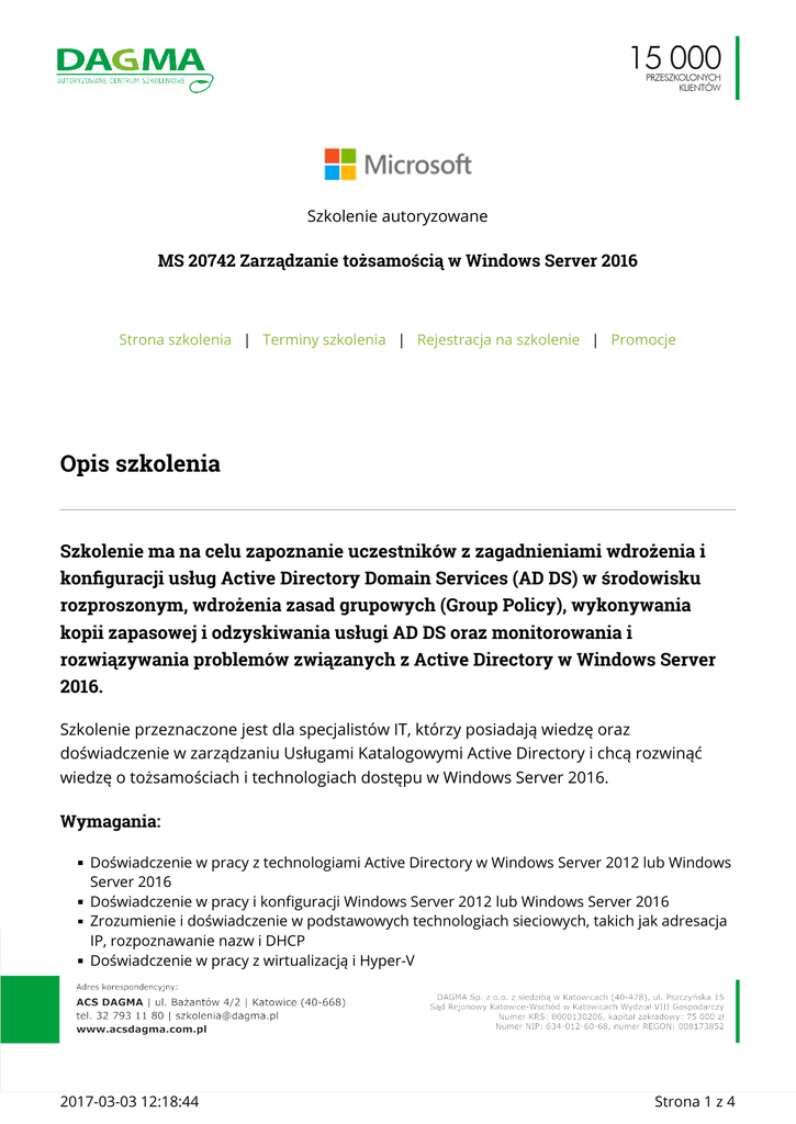 Szkolenie autoryzowane MS 20742 Zarządzanie tożsamością w Windows Server 2016 Strona szkolenia | Terminy szkolenia | Rejestracja na szkolenie | Promocje Opis szkolenia Szkolenie ma na celu zapoznanie uczestników z zagadnieniami wdrożenia i konfiguracji usług Active Directory Domain Services (AD DS) w środowisku rozproszonym, wdrożenia zasad grupowych (Group Policy), wykonywania kopii zapasowej i odzyskiwania usługi AD DS oraz monitorowania i rozwiązywania problemów związanych z Active Directory w Windows Server 2016. Szkolenie przeznaczone jest dla specjalistów IT, którzy posiadają wiedzę oraz doświadczenie w zarządzaniu Usługami Katalogowymi Active Directory i chcą rozwinąć wiedzę o tożsamościach i technologiach dostępu w Windows Server 2016. Wymagania: Doświadczenie w pracy z technologiami Active Directory w Windows Server 2012 lub Windows Server 2016 Doświadczenie w pracy i konfiguracji Windows Server 2012 lub Windows Server 2016 Zrozumienie i doświadczenie w podstawowych technologiach sieciowych, takich jak adresacja IP, rozpoznawanie nazw i DHCP Doświadczenie w pracy z wirtualizacją i Hyper-V 2017-03-03 12:18:44 Strona 1 z 4 Podstawowa znajomość PowerShell Po ukończeniu szkolenia uczestnicy potrafią: Zainstalować i skonfigurować kontrolery domeny Zarządzać obiektami w usługach AD DS przy użyciu narzędzi graficznych i programu Windows PowerShell Wdrożyć usługi AD DS w złożonych środowiskach Wdrożyć i zarządzać usługami AD FS Wdrożyć i zarządzać obiektami zasad grupy (GPO) Długość szkolenia: 40 h (5 dni x 8 h lekcyjnych) - jedna godzina lekcyjna trwa 45 min. Szkolenie prowadzone jest w języku polskim, materiały w języku angielskim. Program szkolenia Moduł 1: Instalacja i konfiguracja kontrolerów domeny Omówienie usług AD DS Omówienie kontrolerów domeny usług AD DS Wdrożenie kontrolera domeny Moduł 2: Zarządzanie obiektami w AD DS Zarządzanie kontami użytkowników Zarządzanie grupami w usługach AD DS Zarządzanie obiektami typu komputer w AD DS Wykorzystywanie PowerShell do zarządzania AD DS Wdrażanie i zarządzanie OU Moduł 3: Zarządzanie zaawansowaną infrastrukturą AD DS Wprowadzenie do zaawansowanych wdrożeń AD DS Wdrożenie rozproszonego środowiska AD DS Konfiguracja relacji zaufania AD DS 2017-03-03 12:18:44 Strona 2 z 4 Moduł 4: Wdrażanie i zarządzanie lokacjami i repliką AD DS Omówienie replikacji usług AD DS Konfigurowanie lokacji usług AD DS Konfigurowanie i monitorowanie replikacji usług AD DS Moduł 5: Wdrażanie zasad grupy Wprowadzenie do zasad grupy Wdrażanie i zarządzanie obiektami GPO (Group Policy Object) Konfiguracja zakresu i przetwarzania obiektów GPO Rozwiązywanie problemów z GPO Moduł 6: Zarządzanie ustawieniami użytkowników za pomocą zasad grupy Wdrażanie szablonów administracyjnych Konfiguracja przekierowania folderów (Folder Redirection), instalacji oprogramowania i skryptów Konfiguracja preferencji zasad grupowych Moduł 7: Zabezpieczanie usług AD DS Zabezpieczanie kontrolerów domeny Wdrażanie bezpieczeństwa kont Wdrażanie inspekcji uwierzytelniania Konfiguracja zarządzanych kont usług Moduł 8: Wdrażanie i zarządzanie usługami AD CS Wdrożenie urzędów CA Zarządzanie urzędami CA Rozwiązywanie problemów i utrzymanie urzędów CA Moduł 9: Wdrażanie i zarządzanie certyfikatami Wdrożenie i zarządzanie szablonami certyfikatów Zarządzanie wdrożeniem, odrzuceniem i odzyskiwaniem certyfikatów Wykorzystanie certyfikatów w środowisku biznesowym 2017-03-03 12:18:44 Strona 3 z 4 Moduł 10: Wdrażanie i administrowanie programu AD FS Omówienie usługi AD FS Planowanie i wymagania usługi AD FS Wdrożenie i konfiguracja usługi AD FS Wprowadzenie do Web Application Proxy Moduł 11: Wdrażanie i zarządzanie usługą AD RMS Wprowadzenie do AD RMS Wdrożenie i zarządzanie infrastrukturą AD RMS Konfiguracja ochrony zawartości za pomocą AD RMS Moduł 12: Wdrażanie synchronizacji AD DS z Microsoft Azure AD Planowanie i przygotowanie synchronizacji usług katalogowych Wdrożenie synchronizacji usług katalogowych wykorzystując Azure AD Connect Zarządzanie tożsamościami za pomocą synchronizacji usług katalogowych Moduł 13: Monitorowanie, zarządzanie i odzyskiwanie usług AD DS Monitorowanie AD DS Zarządzanie bazą Active Directory Opcje wykonywania kopii zapasowej Active Directory i jej odzyskiwania i pozostałych rozwiązań zarządzania tożsamością i dostępem 2017-03-03 12:18:44 Strona 4 z 4