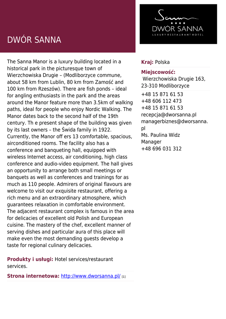 DWÓR SANNA The Sanna Manor is a luxury building located in a historical park in the picturesque town of Wierzchowiska Drugie – (Modliborzyce commune, about 58 km from Lublin, 80 km from Zamość and 100 km from Rzeszów). There are fish ponds – ideal for angling enthusiasts in the park and the areas around the Manor feature more than 3.5km of walking paths, ideal for people who enjoy Nordic Walking. The Manor dates back to the second half of the 19th century. Th e present shape of the building was given by its last owners – the Świda family in 1922. Currently, the Manor off ers 13 comfortable, spacious, airconditioned rooms. The facility also has a conference and banqueting hall, equipped with wireless Internet access, air conditioning, high class conference and audio-video equipment. The hall gives an opportunity to arrange both small meetings or banquets as well as conferences and trainings for as much as 110 people. Admirers of original flavours are welcome to visit our exquisite restaurant, offering a rich menu and an extraordinary atmosphere, which guarantees relaxation in comfortable environment. The adjacent restaurant complex is famous in the area for delicacies of excellent old Polish and European cuisine. The mastery of the chef, excellent manner of serving dishes and particular aura of this place will make even the most demanding guests develop a taste for regional culinary delicacies. Produkty i usługi: Hotel services/restaurant services. Strona internetowa: http://www.dworsanna.pl/ [1] Kraj: Polska Miejscowość: Wierzchowiska Drugie 163, 23-310 Modliborzyce +48 15 871 61 53 +48 606 112 473 +48 15 871 61 53 [email protected] managerbiznes@dworsanna. pl Ms. Paulina Widz Manager +48 696 031 312 Branża: Services (finance, insurance, law, taxes) Źródło: http://www.invest.lubelskie.pl/pl/firma/dwor-sanna