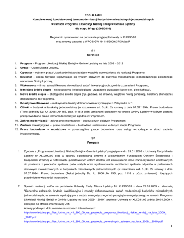 REGULAMIN Kompleksowej i podstawowej termomodernizacji budynków mieszkalnych jednorodzinnych w ramach Programu Likwidacji Niskiej Emisji w Gminie Lędziny dla etapu IV-go (2009/2010) Regulamin opracowano na podstawie przyjętej Uchwały nr XLI/290/09 oraz umowy zawartej z WFOŚiGW Nr 119/2009/37/OA/po/P §1 Definicje 1. Program – Program Likwidacji Niskiej Emisji w Gminie Lędziny na lata 2009 - 2012 2. Urząd – Urząd Miasta Lędziny, 3. Operator - wybrany przez Urząd podmiot posiadający wszelkie upowaŜnienia do realizacji Programu, 4. Inwestor – osoba fizyczna legitymująca się tytułem prawnym do budynku mieszkalnego jednorodzinnego połoŜonego na terenie Gminy Lędziny, 5. Wykonawca – firma zakwalifikowana do realizacji zadań inwestycyjnych zgodnie z zasadami Programu, 6. Istniejące źródło ciepła – niskosprawne i nieekologiczne urządzenie grzewcze (kocioł c.o., piec kaflowy), 7. Nowe źródło ciepła – ekologiczne źródło ciepła (np. gazowe, na drewno, węglowe nowej generacji, kolektory słoneczne) 8. Koszty kwalifikowane – maksymalne koszty dofinansowania wynikające z Załącznika nr 1, 9. Obiekt – budynek mieszkalny jednorodzinny (w rozumieniu art. 3 pkt. 2a ustawy z dnia 07.07.1994r. Prawo budowlane dopuszczone do Programu, (Tekst jednolity Dz. U. 2006r.,Nr 156, poz. 1118 z późn. zmianami) połoŜony na terenie Gminy Lędziny w którym zostaną przeprowadzone prace termomodernizacyjne zgodnie z Programem, 10. Zakres modernizacji – zakres prac montaŜowo – budowlanych objętych Programem, 11. Zadanie inwestycyjne – prace montaŜowo – budowlane realizowane w danym etapie Programu, 12. Prace budowlano – montaŜowe – poszczególne prace budowlane oraz usługi wchodzące w skład zadania inwestycyjnego, §2 Program 1. Zgodnie z „Programem Likwidacji Niskiej Emisji w Gminie Lędziny” przyjętym w dn. 29.01.2009 r. Uchwałą Rady Miasta Lędziny nr XLI/290/09 oraz w oparciu o podpisaną umowę z Wojewódzkim Funduszem Ochrony Środowiska i Gospodarki Wodnej w Katowicach, podstawowym celem działań jest zmniejszenie ilości zanieczyszczeń emitowanych do powietrza z procesów spalania paliw stałych oraz wyeliminowanie moŜliwości spalania odpadów w paleniskach domowych zlokalizowanych w budynkach mieszkalnych jednorodzinnych (w rozumieniu art. 3 pkt. 2a ustawy z dnia 07.07.1994r. Prawo budowlane (Tekst jednolity Dz. U. 2006r.,Nr 156, poz. 1118 z późn. zmianami) będących przedmiotem własności Inwestorów. 2. Sposób realizacji celów na podstawie Uchwały Rady Miasta Lędziny Nr XLI/290/09 z dnia 29.01.2009 r. stanowią "Generalne załoŜenia, kryteria kwalifikacyjne i zasady dofinansowania zadań modernizacji budynków mieszkalnych jednorodzinnych, w zakresie wynikającym z audytu energetycznego lub przeglądu energetycznego w ramach Programu Likwidacji Niskiej Emisji w Gminie Lędziny na lata 2009 - 2010", przyjęte Uchwałą nr XLI/291/09 z dnia 29.01.2009 r. dostępne na stronie internetowej UM. Adresy podanych dokumentów na stronach internetowych: http://www.ledziny.pl/_files_/uchw_nr_41_290_09_ws_przyjecia_programu_likwidacji_niskiej_emisji_na_lata_2009_ _2012.pdf http://www.ledziny.pl/_files_/uchw_nr_41_291_09_ws_przyjecia_generalnych_zalozen_na_lata_2009__2010.pdf 1 3. Wyboru Wykonawców do zakresu prac: - wymiana istniejących źródeł ciepła na ekologiczne i energooszczędne wykorzystujące ekologiczne nośniki energii, - wykorzystanie dodatkowych źródeł ciepła, w tym montaŜ układów solarnych, itp., - zmniejszenie zuŜycia ciepła poprzez docieplenie przegród budowlanych, wymianę stolarki okiennej i drzwiowej, modernizację instalacji c.o. i c.w.u. (UWAGA: c.w.u. w zakresie modernizacji zasobnika ciepłej wody i jego podłączenia do źródła ciepła), dokonuje Inwestor spośród zakwalifikowanych podmiotów przez Operatora. 4. Poszczególne prace budowlano – montaŜowe wchodzące w skład zadania inwestycyjnego traktowane będą jako odrębne procesy inwestycyjne składające się z następujących po sobie zakresów prac zgodnie z tabelą przedstawioną w Załączniku nr 1 do niniejszego Regulaminu. 5. Operator i Wykonawca słuŜą pomocą merytoryczną i techniczną dot. Programu. Wszelkich informacji dotyczących funkcjonowania Programu udziela Operator. §3 Zasady, forma i wysokość dofinansowania poszczególnych inwestycji 1. KaŜdy Inwestor moŜe uzyskać dofinansowanie do prac budowlano – montaŜowych zadania inwestycyjnego zgodnie z zasadami finansowania zawartymi w Załączniku nr 1 do niniejszego Regulaminu po spełnieniu wszystkich wymogów przewidzianych Regulaminem oraz podpisaniu umowy z Operatorem. 2. Wkład własny Inwestora na koszty kwalifikowane prac budowlano – montaŜowych zadania inwestycyjnego oraz wynagrodzenia Wykonawcy przewyŜszającego koszty kwalifikowane naleŜy uregulować na rzecz Wykonawcy zgodnie z postanowieniami umów z Wykonawcami. 2.1 Inwestor moŜe skorzystać z kredytu (poŜyczki) na sfinansowanie wkładu własnego w instytucji finansowej proponowanej przez Operatora bądź w dowolnie wybranej przez siebie formie i instytucji finansowej. Operator nie ponosi odpowiedzialności za zobowiązania zaciągnięte przez Inwestora, ani za skutki odmowy udzielenia kredytu (poŜyczki), 3. Urząd pokryje za Inwestora pozostałą część kosztów kwalifikowanych prac budowlano – montaŜowych zadania inwestycyjnego zgodnie z zapisami stosownej umowy zawartej przez Inwestora z Operatorem na dofinansowanie powyŜszych prac, lecz nie później niŜ do 35 dni od otrzymania faktury. 4. Koszt opracowania audytu energetycznego opracowanego zgodnie z § 4 ust. 3 niniejszego Regulaminu wraz z opinią kominiarską stanowią koszt własny Inwestora. §4 Warunki Programu Inwestor przystępując do Programu wykona następujące czynności: 1. Inwestor złoŜy ankietę wstępną wraz z deklaracją wyboru wariantu wg odpowiedniego wzoru w Urzędzie, 2. Inwestor wyrazi pisemnie zgod