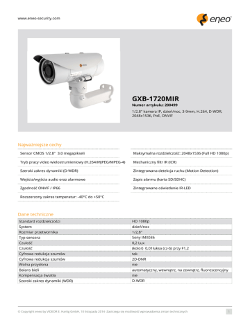 www.eneo-security.com GXB-1720MIR Numer artykułu: 200499 1/2.8" kamera IP, dzień/noc, 3-9mm, H.264, D-WDR, 2048x1536, PoE, ONVIF Najważniejsze cechy Sensor CMOS 1/2.8" 3.0 megapikseli Maksymalna rozdzielczość: 2048x1536 (Full HD 1080p) Tryb pracy video wielostrumieniowy (H.264/MJPEG/MPEG-4) Mechaniczny filtr IR (ICR) Szeroki zakres dynamiki (D-WDR) Zintegrowana detekcja ruchu (Motion Detection) Wejścia/wyjścia audio oraz alarmowe Zapis alarmu (karta SD/SDHC) Zgodność ONVIF / IP66 Zintegrowane oświetlenie IR-LED Rozszerzony zakres temperatur: -40°C do +50°C Dane techniczne Standard rozdzielczości HD 1080p System dzień/noc Rozmiar przetwornika 1/2,8" Typ sensora Sony IMX036 Czułość 0,2 Lux Czułość (kolor) 0,01luksa (cz-b) przy F1,2 Cyfrowa redukcja szumów tak Cyfrowa redukcja szumów 2D-DNR Wolna przysłona nie Balans bieli automatyczny, wewnątrz, na zewnątrz, fluorescencyjny Kompensacja światła nie Szeroki zakres dynamiki (WDR) D-WDR © Copyright eneo by VIDEOR E. Hartig GmbH, 10 listopada 2014 -Zastrzega się możliwość wprowadzenia zmian technicznych 1 www.eneo-security.com GXB-1720MIR C.d. danych technicznych Filtr IR mechaniczny Obracanie obrazu odbicie poziome/pionowe, odbicie pionowe Maksymalna rozdzielczość obrazu 2048x1536 Rozdzielczość 2048x1536 (4:3), 1600x1200 (4:3), 1024x768 (4:3), 800x600 (4:3), 640x480 (4:3), 480x360 (4:3), 320x240 (4:3), 176x144 (4:3), 1920x1080 (16:9), 1280x720 (16:9), 1152x864 (4:3), 640x360 (16:9), 480x270 (16:9), 320x176 (16:9), 176x120 (16:9) Maksymalna prędkość transmisji 25 fps Strefy prywatności 3 strefy maksymalnie Detekcja ruchu tak Wyświetlanie tekstu 63 znaki, włączanie/wyłączanie Wersje językowe menu angielski, niemiecki, francuski, hiszpański, włoski, portugalski, holenderski, szwedzki, fiński, polski, węgierski, rumuński, turecki, czeski, chiński, rosyjski Menu ekranowe OSD ARW, AWB, regulacja ekspozycji, ESC, odbicie poziome/pionowe, jasność, tekst, nasycenie koloru, detekcja ruchu, kontrast, rozdzielczość, język Złącza zewnętrzne wejście zasilania, slot kart SD, RJ-45, wejście alarmowe, wyjście alarmowe, video (chinch) Wyjścia video composite (cinch) Wsparcie аudio tak Audio 1/1 wejście/wyjście Wejścia alarmowe 1 Wyjście alarmowe 1 Procedura alarmowa Zapis na karcie SD, Wyjście alarmowe, FTP, E-Mail Pamięć wewnętrzna karta SD, SD-HC 32GB Metody kompresji H.264, M-JPEG, MPEG-4 Rodzaje strumieni H.264, MPEG-4, MJPEG jednocześnie (3 strumienie) łącze Ethernet 100Base-TX Przeglądarka sieciowa MS Internet Explorer wers. 7.0 min., Google Chrome (Java), Mozilla Firefox (Java), Safari (Java) Protokoły sieciowe IPv4, HTTP, HTTPS, TCP/IP, UDP, RTP, RTSP, DHCP, NTP, FTP, SMTP, UPnP, PPPoE, ARP, DDNS, SAMBA Typ obiektywu zmiennogniskowy Ogniskowa 3 - 9 mm Poziomy kąt widzenia 77,4 - 29,8 ° Zoom cyfrowy 10x Sterowanie przysłoną DC Oświetlenie IR Illumination range około 20m Zdalny dostęp i konfiguracja Przeglądarka internetowa, przez oprogramowanie klienckie Aktualizacja Firmware Przez sieć Zabezpieczenie hasłem tak Wsparcie e-PTZ tak Zasilanie 12VDC, 24VAC, PoE © Copyright eneo by VIDEOR E. Hartig GmbH, 10 listopada 2014 -Zastrzega się możliwość wprowadzenia zmian technicznych 2 www.eneo-security.com GXB-1720MIR C.d. danych technicznych Zasilanie (+/-10%), PoE (IEEE-802.3af) Zasilanie przez Ethernet (PoE) [#1] IEEE 802.3af Pobór mocy 10 W Sposób montażu montaż ścienny Zakres temperatur pracy -40°C ~ +50°C Ochrona wandaloodporna tak Obudowy zewnętrzna Materiał obudowy aluminium Kolor obudowy RAL9003 Klasa szczelności IP66 Program do zarządzania www.eneosecurity.com/pl/produkty/videomanagement.html SDK (inżynieria oprogramowania) SDK włącznie z HTTP-API jak i Active-X ONVIF tak, ONVIF Test Tool Version 1.02.4 Certyfikaty CE, IK10 Wymiary (WxGxD) 92x97x226 mm Waga 1,2 kg W zestawie instrukcja obsługi, zasilacz, przewód sieciowy, imbus, zestaw śrub Interfejs szeregowy nie Daszek przeciwsłoneczny tak Zintegrowany uchywt ścienny tak Zabudowa kabla tak Podgrzewanie szybki nie Metody kompresji H.264, MPEG4, MJPEG Standard wideo PAL Wejścia alarmowe 1x wejście kontaktu (zamknięte lub otwarte) Typ przetwornika CMOS Doświetlenie 12x LED 850nm, Sterowane czujnikiem, Tryb harmonogramu, Sterowane ręcznie © Copyright eneo by VIDEOR E. Hartig GmbH, 10 listopada 2014 -Zastrzega się możliwość wprowadzenia zmian technicznych 3 www.eneo-security.com GXB-1720MIR Dostępne akcesoria Bild Art. Nr. / Bezeichnung Beschreibung 202562 / PNR-5216 Rejestrator sieciowy, 16xIP 1920x1080, 480kl/s, 1TB, DVI, MPEG-4, M-JPEG, H.264, D-Sub 203658 / VT-PS12DC-11 Zasilacz 100-240VAC/12VDC (1.0A), Stabilizowany, w wtyczką 204193 / PNR-5104 Rejestrator sieciowy, 4xIP 1920x1080, 120 kl/sek, 1TB, H.264, MPEG-4, M-JPEG 204192 / PNR-5108 Rejestrator sieciowy, 8xIP 1920x1080, 240 kl/sek, 1TB, H.264, MPEG-4, M-JPEG 210144 / eneo Scan Device Aplikacja zarządzająca urządzeniami eneo kamery IP © Copyright eneo by VIDEOR E. Hartig GmbH, 10 listopada 2014 -Zastrzega się możliwość wprowadzenia zmian technicznych 4 www.eneo-security.com GXB-1720MIR Rysunek techniczny © Copyright eneo by VIDEOR E. Hartig GmbH, 10 listopada 2014 -Zastrzega się możliwość wprowadzenia zmian technicznych 5 www.eneo-security.com Osoba kontaktowa wyznaczona przez Ciebie eneo is a registered trademark of VIDEOR E. Hartig GmbH Carl-Zeiss-Straße 8 63322 Rödermark Deutschland Tel.: +49 6074-888-333 E-Mail: [email protected] Web: www.eneo-security.com © Copyright eneo by VIDEOR E. Hartig GmbH, 10 listopada 2014 -Zastrzega się możliwość wprowadzenia zmian technicznych 6