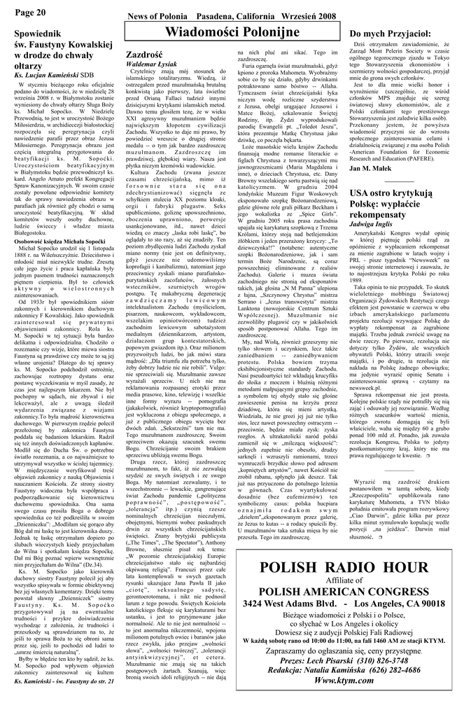 Page 20 Spowiednik św. Faustyny Kowalskiej w drodze do chwały ołtarzy Ks. Lucjan Kamieński SDB W styczniu bieżącego roku oficjalnie podano do wiadomości, że w niedzielę 28 września 2008 r. w Białymstoku zostanie wyniesiony do chwały ołtarzy Sługa Boży ks. Michał Sopoćko. W Niedzielę Przewodnią, to jest w uroczystość Bożego Miłosierdzia, w archidiecezji białostockiej rozpoczęła się peregrynacja czyli nawiedzenie parafii przez obraz Jezusa Miłosiernego. Peregrynacja obrazu jest częścią integralną przygotowania do beatyfikacji ks. M. Sopoćki. Uro czysto ścio m b eatyf ikacyj nym w Białymstoku będzie przewodniczył ks. kard. Angelo Amato prefekt Kongregacji Spraw Kanonizacyjnych. W swoim czasie zostały powołane odpowiednie komitety tak do sprawy nawiedzenia obrazu w parafiach jak również gdy chodzi o samą uroczystość beatyfikacyjną. W skład komitetów weszły osoby duchowne, ludzie świeccy i władze miasta Białegostoku. Osobowość księdza Michała Sopoćki Michał Sopoćko urodził się 1 listopada 1888 r. na Wileńszczyźnie. Dzieciństwo i młodość miał niezwykle trudne. Zresztą całe jego życie i praca kapłańska były jednym pasmem trudności naznaczonych piętnem cierpienia. Był to człowiek aktywny o wielostronnych zainteresowaniach. Od 1933r był spowiednikiem sióstr zakonnych i kierownikiem duchowym zakonnicy F Kowalskiej. Jako spowiednik z a i n t e r e s o wa ł s i ę p r y w a t n y m i objawieniami zakonnicy. Rola ks. M. Sopoćki w tej sytuacji była bardzo delikatna i odpowiedzialna. Chodziło o rozeznanie czy wizje, które miewa siostra Faustyna są prawdziwe czy może to są jej własne urojenia? Dlatego do tej sprawy ks. M. Sopoćko podchodził ostrożnie, zachowując roztropny dystans oraz postawę wyczekiwania w myśl zasady, że czas jest najlepszym lekarzem. Nie był pochopny w sądach, nie zbywał i nie lekceważył, ale z uwagą śledził wydarzenia związane z wizjami zakonnicy.To była mądrość kierownictwa duchowego. W pierwszym rzędzie polecił przełożonej by zakonnica Faustyna poddała się badaniom lekarskim. Radził się też innych doświadczonych kapłanów. Modlił się do Ducha Św. o potrzebne światło rozeznania, a co najważniejsze to utrzymywał wszystko w ścisłej tajemnicy. W międzyczasie weryfikował treść objawień zakonnicy z nauką Objawienia i nauczaniem Kościoła. Ze strony siostry Faustyny widoczna była współpraca i podporządkowanie się kierownictwu duchowemu spowiednika. Ona sama swego czasu prosiła Boga o dobrego spowiednika co też podkreśliła w swoim „Dzienniczku”: „Modliłam się gorąco aby Bóg dał mi łaskę to jest kierownika duszy. Jednak tę łaskę otrzymałam dopiero po ślubach wieczystych kiedy przyjechałam do Wilna i spotkałam księdza Sopoćkę. Dał mi Bóg poznać wpierw wewnętrznie nim przyjechałam do Wilna” (Dz.34). Ks. M. Sopoćko jako kierownik duchowy siostry Faustyny polecił jej aby wszystko spisywała w formie obiektywnej bez jej własnych komentarzy. Dzięki temu powstał sławny „Dzienniczek” siostry Faustyny. Ks. M. Sopoćko przygotowywał ją na ewentualne trudności i przykre doświadczenia wychodząc z założenia, że trudności i przeszkody są sprawdzianem na to, że jeśli to sprawa Boża to się obroni sama przez się, jeśli to pochodzi od ludzi to „umrze śmiercią naturalną”. Byłby w błędzie ten kto by sądził, że ks. M. Sopoćko pod wpływem objawień zakonnicy zainteresował się kultem Ks. Kamieński - św. Faustyny do str. 21 News of Polonia Pasadena, California Wrzesień 2008 Wiadomości Polonijne Zazdrość Waldemar Łysiak Czytelnicy znają mój stosunek do islamskiego totalitaryzmu. Wiedzą, iż ostrzegałem przed muzułmańską brutalną konkwistą jako pierwszy, lata świetlne przed Orianą Fallaci tudzież innymi dzisiejszymi krytykami islamskich metod. Dawno temu głosiłem tezę, że w wieku XXI agresywny muzułmanizm będzie największym kłopotem cywilizacji Zachodu. Wszystko to daje mi prawo, by powiedzieć wreszcie o drugiej stronie medalu -- o tym jak bardzo zazdroszczę muzułmano m. Zazdroszczę im prawdziwej, głębokiej wiary. Nasza jest płytka niczym kremówki wadowickie. Kultura Zachodu (zwana jeszcze czasami chrześcijańską, mimo iż forsownie stara się ona zdechrystianizować) sięgnęła ze schyłkiem stulecia XX poziomu kloaki, orgii i fabryki plugastw. Seks upubliczniono, goliznę upowszechniono, zboczenia uprawniono, perwersje usankcjonowano, itd., nawet dzieci wiedzą co znaczy „laska robi laskę”, bo oglądały to sto razy, aż się znudziły. Ten poziom zbydlęcenia ludzi Zachodu zyskał miano normy (nie jest on definitywny, gdyż jeszcze nie udomowiliśmy koprofagii i kanibalizmu), natomiast jego przeciwnicy zyskali miano parafiańskopurytańskich zacofańców, żałosnych wsteczników, szurniętych wrogów postępu. Tę makabryczną degenerację zawdzięczamy lewicowym intelektualistom Zachodu (myślicielom, pisarzom, naukowcom, wykładowcom, wszelakim opiniotwórcom) tudzież zachodnim lewicowym sabotażystom medialnym (dziennikarzom, artystom, działaczom grup kontestatorskich, popowym gwiazdom itp.). Oraz milionom przyzwoitych ludzi, bo jak mówi stara mądrość: „Dla triumfu zła potrzeba tylko, żeby dobrzy ludzie nic nie robili”. Vulgo: nie sprzeciwiali się. Muzułmanie zawsze wyrażali sprzeciw. U nich nie ma reklamowania rozpasanej erotyki przez media prasowe, kino, telewizję i wszelkie inne formy wyrazu -- pornografia (jakakolwiek, również kryptopornografia) jest wykluczona z obiegu społecznego, a już z publicznego obiegu wycięta bez dwóch zdań. „Seksrzeźni” tam nie ma. Tego muzułmanom zazdroszczę. Swoim sprzeciwem okazują szacunek swemu Bogu. Chrześcijanie swoim brakiem sprzeciwu ubliżają swemu Bogu. Druga rzecz, której zazdroszczę muzułmanom, to fakt, iż nie zezwalają szydzić ze swych świętych i ze swego Boga. My natom