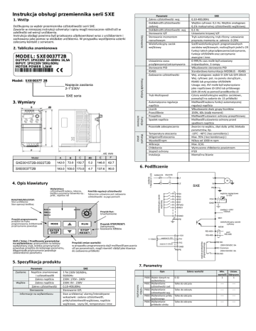 Instrukcja obsługi przemiennika serii SXE 1. Wstęp Sterowanie Dziękujemy za wybór przemiennika częstotliwości serii SXE. Zawarte w niniejszej instrukcji schematy i opisy mogą nieznacznie różnić się w zależności od wersji urządzenia. Instrukcja obsługi powinna być przekazana użytkownikowi wraz z urządzeniem i zachowana jako pomoc w obsłudze urządzenia. W przypadku wystąpienia usterki zalecamy kontakt z serwisem. 2. Tabliczka znamionowa Parametr Zakres częstotliwości wyj. Dokładność częstotliwości zadanej Dokładność częstotliwości wyj. Sterowanie V/F Sterowanie momentem rozruchowym Wielofunkcyjny zacisk wejściowy MODEL: SXE0037T2B OUTPUT: 1PH230V 10-400Hz 16,5A INPUT: 1PH230V 50Hz/60Hz MOTOR POWER 1,5kW Ustawienia czasu przyśpieszania/zatrzymywania Sterowanie PID RS485 Zadawanie częstotliwości Pozostałe funkcje Model: SXE0037T 2B Napięcie zasilania 2-1*230V SXE seria 3. Wymiary Funkcje ochronne Warunki pracy C E Tryb Multispeed Automatyczna regulacja napięcia Licznik Przeciążenie Przepięcie Spadek napięcia Pozostałe zabezpieczenia Temperatura otoczenia Wilgotność otoczenia Wysokość npm Wibracje Chłodzenie Stopień ochrony Instalacja SXE 0,10-400,00Hz Wejście cyfrowe: 0,1 Hz; Wejście analogowe: 0,1% maksymalnej częstotliwości wyjściowej 0,1 Hz Ustawianie krzywej V/F Tryb automatyczny, tryb ręczny: ustawianie przyrostu momentu w zakresie 0-20% Sześć wielofunkcyjnych programowalnych zacisków wejściowych, realizujących jedną z 29 funkcji takich jak przyśpieszenie/zatrzymanie, funkcje UP/DOWN oraz zat rzymanie awaryjne i inne. 0-999,9s czas może być ustawiany indywidualnie, 3 rampy Wbudowanie sterowanie PID Standardowa komunikacja MODBUS - RS485 Wej. analogowe: wybór 0-10V lub 0/4-20mA Wej. cyfrowe: pot. na panelu sterującym , RS485 lub przycisków UP/DOWN Uwaga: wej. AVI może być wykorzystane jako napięciowe (0-10V) lub prądowego (0/4-20 mA) za pomocą przełącznika J2 Cztery wielofunkcyjne wejścia zaciskowe , pozwalają na zadanie do 15 prędkości Możliwość wyboru funkcji automatycznej regulacji napięcia Wbudowanie dwie grupy liczników 150%, 60s (stały moment) Możliwość ustawieni ochrony przepięciowej Możliwość ustawienia ochrony przed spadkiem napięcia Zwarcie na wyjściu, zbyt duży prąd, blokada parametrów, itp. -10°C - 40°C ( bez zamrożenia ) Max. 95% ( bez kondensacji ) Niższa od 1000 m npm Max. 0,5G Wymuszone chłodzenie powietrzem IP20 Montaż na ścianie F SXE0015T2B-0022T2B 6. Podłączenie zasilanie 1-fazowe (L1,L2) SXE0037T2B 4. Opis klawiatury Pokrętło regulacji częstotliwości fabrycznie ustawione jest zadawanie częstotliwości za jego pomocą. stycznik RUN/FWD/REV/STOP: Stan urządzenia: Stan operacji bieżącej Przycisk Run: M L2 W SXE Uruchomienie Przycisk programowania przejście do trybu programowania, krótkotrwałe przytrzymanie powoduje U L1 wielofunkcyjny zacisk wejściowy Wyświetlacz: częstotliwość zadana, robocza, bieżące parametry falownika np.: prąd , napięcie itd wyłącznik PE wyjście napięciowe 0-10V S4 S3 S2 S1 FWD REV FOV GND zasilacz +24V 100mA GND M01 PE wielofunkcyjny zacisk cyfrowy Przycisk STOP/RESET: Zatrzymanie, kasowanie błędów MODE MCM RS-485+ 1~10kΩ Przyciski zmian wartości: w przypadku programowania dają możliwość poruszania się po parametrach, mogą również służyć jako klawisze do zadawania prędkości 5. Specyfikacja produktu SXE 1 faz 230V 50/60Hz, 50/60Hz 230V: 170V -- 240V 230V: 0V - 230V 0,10-400,00Hz Sterowanie V/F, Stan urządzenia/ alarmy/interaktywne wskazówki: zadana częstotliwość , prąd/częstotliwość wyjściowa, napięcie wyjściowe, szyny DC, temperatura i inne wejście 0~20mA FIV FIC GND PE RB NC 250V/30VDC 3A RC Common 250V/30VDC 3A RA NO 7. Parametry Opis Funkcje monitorujące Parametr Zasilanie Napięcie znamionowe i częstotliwośći Zakres napięcia Wyjście Zakres napięcia Zakres częstotliwości Sterowanie Informacje na wyświetlaczu wejście 0~10V wyjście przekaźnika programowalnego Shift / Enter / Przełączanie parametrów na wyświetlaczu: przesunięcie na kolejny wyświetlany znak, krótkie przytrzymanie powoduje przejście do kolejnego parametru, długotrwałe przytrzymanie powoduje zatwierdzenie parametru port RS-485 RS-485- +10V P000 Wybór danych na wyświetlaczu P001 Wyświetlanie częstotliwości zad. P002 Wyświetlanie częstotliwości wyj. P003 Wyświetlanie prądu wyjściowego P004 Wyświetlanie prędkości silnika Zakres wartości 0-32 Min. Ustaw. wartość fabryczne 1 1 Tylko do odczytu ---- ---- Tylko do odczytu ---- ---- Tylko do odczytu ---- ---- Tylko do odczytu ---- ---- Min. Wartość wartość fabryczna P005 Wyświetlanie napięcia na szynie DC P006 Wyświetlanie temperatura urządzenia P007 Wyświetlanie parametrów PID P010 Zapis alarmu 1 Tylko do odczytu ---- ---- Tylko do odczytu ---- ---- Funkcje monitorujące Tylko do odczytu ---- ---- Tylko do odczytu ---- ---- P011 Zapis alarmu 2 Tylko do odczytu ---- ---- P012 Zapis alarmu 3 Tylko do odczytu ---- ---- P013 Zapis alarmu 4 Tylko do odczytu ---- ---- P014 Ustawiona częstotliwość przy ostatnim alarmie P015 Częstotliwość wyjściowa przy ostatnim alarmie P016 Prąd wyjściowy przy ostatnim alarmie P017 Napięcie wyjściowe przy ostatnim alarmie P018 Napięcie szyny DC przy ostatnim alarmie Tylko do odczytu ---- ---- P100 Ustawienie częstotliwości wejściem cyfrowym P101 Wybór zadawania częstotliwości 0,00 – częstotliwość max. Tylko do odczytu ---- ---- Tylko do odczytu ---- ---- Tylko do odczytu ---- ---- Tylko do odczytu ---- ---- 0,1 0: Ustawianie wejściem cyfrowym (P100) 1: Wejście analogowe napięciowe (0-10V) 2: Wejście analogowe prądowe ( 0/420mA) 3: Panel sterujący 4: Przyciski UP/DOWN 5: Zadawanie za pomocą komunikacji RS485 P102 Wybór sygnału START 0: Panel sterujący (START/STOP) 1: Zaciski we/wy 2: Komunikacja RS-485 P103 Blokada przycisku STOP 0: Nieaktywna 1: Aktywna P104 Blokada zmiany 