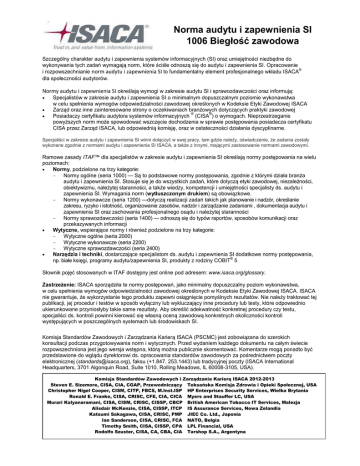 Norma audytu i zapewnienia SI 1006 Biegłość zawodowa Szczególny charakter audytu i zapewnienia systemów informacyjnych (SI) oraz umiejętności niezbędne do wykonywania tych zadań wymagają norm, które ściśle odnoszą się do audytu i zapewnienia SI. Opracowanie ® i rozpowszechnianie norm audytu i zapewnienia SI to fundamentalny element profesjonalnego wkładu ISACA dla społeczności audytorów. Normy audytu i zapewnienia SI określają wymogi w zakresie audytu SI i sprawozdawczości oraz informują: Specjalistów w zakresie audytu i zapewnienia SI o minimalnym dopuszczalnym poziomie wykonawstwa w celu spełnienia wymogów odpowiedzialności zawodowej określonych w Kodeksie Etyki Zawodowej ISACA Zarząd oraz inne zainteresowane strony o oczekiwaniach branżowych dotyczących praktyki zawodowej ® ® Posiadaczy certyfikatu audytora systemów informacyjnych (CISA ) o wymogach. Nieprzestrzeganie powyższych norm może spowodować wszczęcie dochodzenia w sprawie postępowania posiadacza certyfikatu CISA przez Zarząd ISACA, lub odpowiednią komisję, oraz w ostateczności działania dyscyplinarne. Specjaliści w zakresie audytu i zapewnienia SI winni dołączyć w swej pracy, tam gdzie należy, oświadczenie, że zadania zostały wykonane zgodnie z normami audytu i zapewnienia SI ISACA, a także z innymi, mającymi zastosowanie normami zawodowymi. Ramowe zasady ITAF™ dla specjalistów w zakresie audytu i zapewnienia SI określają normy postępowania na wielu poziomach: Normy, podzielone na trzy kategorie: Normy ogólne (seria 1000) — Są to podstawowe normy postępowania, zgodnie z którymi działa branża audytu i zapewnienia SI. Stosuje się je do wszystkich zadań, które dotyczą etyki zawodowej, niezależności, obiektywizmu, należytej staranności, a także wiedzy, kompetencji i umiejętności specjalisty ds. audytu i zapewnienia SI. Wymagania norm (wytłuszczonym drukiem) są obowiązkowe. Normy wykonawcze (seria 1200) —dotyczą realizacji zadań takich jak planowanie i nadzór, określanie zakresu, ryzyko i istotność, organizowanie zasobów, nadzór i zarządzanie zadaniami , dokumentacja audytu i zapewnienia SI oraz zachowania profesjonalnego osądu i należytej staranności Normy sprawozdawczości (seria 1400) — odnoszą się do typów raportów, sposobów komunikacji oraz przekazywanych informacji Wytyczne, wspierające normy i również podzielone na trzy kategorie: Wytyczne ogólne (seria 2000) Wytyczne wykonawcze (seria 2200) Wytyczne sprawozdawczości (seria 2400) Narzędzia i techniki, dostarczające specjalistom ds. audytu i zapewnienia SI dodatkowe normy postępowania, ® np. białe księgi, programy audytu/zapewnienia SI, produkty z rodziny COBIT 5 Słownik pojęć stosowanych w ITAF dostępny jest online pod adresem: www.isaca.org/glossary. Zastrzeżenie: ISACA sporządziła te normy postępowań, jako minimalny dopuszczalny poziom wykonawstwa, w celu spełnienia wymogów odpowiedzialności zawodowej określonych w Kodeksie Etyki Zawodowej ISACA. ISACA nie gwarantuje, że wykorzystanie tego produktu zapewni osiągnięcie pomyślnych rezultatów. Nie należy traktować tej publikacji, jej procedur i testów w sposób wyłączny lub wykluczający inne procedury lub testy, które odpowiednio ukierunkowane przyniosłyby takie same rezultaty. Aby określić adekwatność konkretnej procedury czy testu, specjaliści ds. kontroli powinni kierować się własną oceną zawodową konkretnych okoliczności kontroli występujących w poszczególnych systemach lub środowiskach SI. Komisja Standardów Zawodowych i Zarządzania Karierą ISACA (PSCMC) jest zobowiązana do szerokich konsultacji podczas przygotowywania norm i wytycznych. Przed wydaniem każdego dokumentu na całym świecie rozpowszechniona jest jego wersja wstępna, którą można publicznie skomentować. Komentarze mogą ponadto być przedstawione do wglądu dyrektorowi ds. opracowania standardów zawodowych za pośrednictwem poczty elektronicznej ([email protected]), faksu (+1.847. 253.1443) lub tradycyjnej poczty (ISACA International Headquarters, 3701 Algonquin Road, Suite 1010, Rolling Meadows, IL 60008-3105, USA). Komisja Standardów Zawodowych i Zarządzania Karierą ISACA 2012-2013 Steven E. Sizemore, CISA, CIA, CGAP, Przewodniczący Teksańska Komisja Zdrowia i Opieki Społecznej, USA Christopher Nigel Cooper, CISM, CITP, FBCS, M.Inst.ISP HP Enterprises Security Services, Wielka Brytania Ronald E. Franke, CISA, CRISC, CFE, CIA, CICA Myers and Stauffer LC, USA Murari Kalyanaramani, CISA, CISM, CRISC, CISSP, CBCP British American Tobacco IT Services, Malezja Alisdair McKenzie, CISA, CISSP, ITCP IS Assurance Services, Nowa Zelandia Katsumi Sakagawa, CISA, CRISC, PMP JIEC Co. Ltd., Japonia Ian Sanderson, CISA, CRISC, FCA NATO, Belgia Timothy Smith, CISA, CISSP, CPA LPL Financial, USA Rodolfo Szuster, CISA, CA, CBA, CIA Tarshop S.A., Argentyna Norma audytu i zapewnienia SI 1006 Biegłość zawodowa Wymagania 1006.1 Specjaliści ds. audytu i zapewnienia SI, wraz z innymi osobami pomagającymi w zleconym zadaniu, winni posiadać odpowiednie umiejętności i biegłość w przeprowadzaniu zadań audytowych i zapewniających SI oraz posiadać zawodowe kompetencje do wykonania wymaganych prac. 1006.2 Specjaliści ds. audytu i zapewnienia SI, wraz z innymi osobami pomagającymi w w zleconym zadaniu, winni posiadać odpowiednią wiedzę w przedmiotowym zakresie. 1006.3 Specjaliści ds. audytu i zapewnienia SI winni dbać o zawodowe kompetencje poprzez kształcenie ustawiczne i udział w szkoleniach. Kluczowe aspekty Specjaliści ds. audytu i zapewnienia SI winni: Wykazać, że wystarczające Kompetencje zawodowe (umiejętności, wiedza i doświadczenie związane z planowanym zadaniem) są dostępne przed rozpoczęciem prac. Ocenić alternatywne sposoby pozyskania umiejętności, w tym podwykonawstwo, zlecenie części prac na zewnątrz (outsourcing) wstrzymując wykonanie zadania do momentu, kiedy t