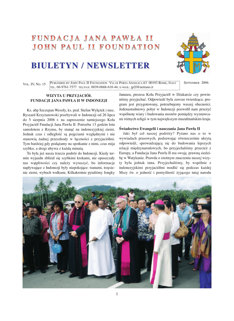 BIULETYN / NEWSLETTER VOL. IV, NO. 15 PUBLISHED BY JOHN PAUL II FOUNDATION VIA DI PORTA ANGELICA 63 00193 ROME, ITALY TEL. 06-9761-7577 TEL/FAX: 0039-0668-618-44; E-MAIL: [email protected] SEPTEMBER 2006 Januara, prezesa Koła Przyjaciół w Džakarcie czy powinniÊmy przyjechaç. Odpowiedê była zawsze twierdzàca: program jest przygotowany, potrzebujemy waszej obecnoÊci. Jedenastodniowy pobyt w Indonezji pozwolił nam przežyç wspólnot∏ wiary i budowania mostów pomi∏dzy wyznawcami róžnych religii w tym najwi∏kszym muzułmaƒskim kraju. WIZYTA U PRZYJACIÓŁ FUNDACJI JANA PAWŁA II W INDONEZJI Ks. abp Szczepan Wesoły, ks. prał. Stefan Wyl∏žek i mec. Ryszard Krzyžanowski przebywali w Indonezji od 26 lipca do 5 sierpnia 2006 r. na zaproszenie tamtejszego Koła Przyjaciół Fundacji Jana Pawła II. Potrzeba 13 godzin lotu samolotem z Rzymu, by stanàç na indonezyjskiej ziemi. Jednak czas i odległoÊç sà poj∏ciami wzgl∏dnymi i nie stanowià žadnej przeszkody w łàcznoÊci z przyjaciółmi. Tym bardziej gdy podàžamy na spotkanie z nimi, czas mija szybko, a drogi ubywa z každà minutà. To była juž nasza trzecia podróž do Indonezji. Kiedy termin wyjazdu zbližał si∏ szybkimi krokami, nie opuszczały nas wàtpliwoÊci czy naležy wyruszyç, bo informacje napływajàce z Indonezji były niepokojàce: tsunami, trz∏sienie ziemi, wybuch wulkanu. Kilkakrotnie pytaliÊmy Jongky Âwiadectwo Ewangelii i nauczania Jana Pawła II Jaki był cel naszej podróžy? Pytano nas o to w wywiadach prasowych, podsuwajàc równoczeÊnie ukrytà odpowiedê, sprowadzajàcà si∏ do budowania lepszych relacji mi∏dzynarodowych, bo przyjechaliÊmy przeciež z Europy, a Fundacja Jana Pawła II ma swojà prawnà siedzib∏ w Watykanie. Prawda o istotnym znaczeniu naszej wizyty była jednak inna. PrzyjechaliÊmy, by wspólnie z indonezyjskimi przyjaciółmi modliç si∏ podczas každej Mszy Êw. o jednoÊç i pomyÊlnoÊç žyjàcego tutaj narodu 1 oraz by wspieraç materialnie tych, którzy ucierpieli na skutek trz∏sienia ziemi. Pomoc ta pochodziła od uczestników eucharystycznej uczty. Nie przywieêliÊmy pieni∏dzy, ani tež nie szukaliÊmy ich dla siebie. DzieliliÊmy si∏ Ewangelià i nauczaniem Jana Pawła II, którego pami∏ç jest w Indonezji bardzo žywa. MogliÊmy tego doÊwiadczyç podczas liturgii eucharystycznych sprawowanych zarówno w domach prywatnych, gdzie gromadziło si∏ zawsze ponad 100 osób, jak i w wielkiej sali na terenach wystawowych w Džakarcie, gdzie we Mszy Êw. uczestniczyło 6 000 osób, czy tež w przepełnionej wiernymi katedrze w Ambon. Trasa naszej podróžy prowadziła przez Džakart∏, Ambon, Manado i Surabaj∏. W každym z tych miejsc członkowie Koła Przyjaciół Fundacji włàczyli si∏ w žycie lokalnego KoÊcioła, przychodzàc z pomocà w jego potrzebach: w budowie koÊcioła, pomocy dla klasztoru sióstr karmelitanek, wsparciu dla seminarium duchownego czy odbudowie szkoły zniszczonej przez ostatnie trz∏sienie ziemi. Ambon było poÊwi∏cenie kamienia w∏gielnego pod budow∏ nowego koÊcioła w miejscowoÊci Waai, do której z tej okazji przybyło kilka tysi∏cy chrzeÊcijan i muzułmanów. Podczas krwawego konfliktu religijnego wioska Waai została zrównana z ziemià, a ponad 9 tysi∏cy mieszkaƒców uciekło, ratujàc žycie, do okolicznych wsi. Obecnie członkowie obu wspólnot, muzułmaƒskiej i chrzeÊcijaƒskiej, spotkali si∏ z okazji budowy koÊcioła, traktujàc to jako sposobnoÊç do budowania nowych mostów mi∏dzy wyznawcami obu religii na Molukach. ZostaliÊmy przywitani najpierw przez przedstawicieli społecznoÊci muzułmaƒskiej, nieco dalej przez wspólnot∏ protestanckà, a juž na miejscu budowy koÊcioła przez wspólnot∏ katolickà. Na powitanie goÊci tancerze muzułmaƒscy wykonali taniec ludowy, a zespół muzyczny protestantów zagrał i zaÊpiewał pieÊni religijne, którym towarzyszyły taƒce dziewczàt. Biskup Mandagi ogłosił, že wznoszony budynek koÊcielny b∏dzie nosił nazw∏: „Kaplica Jana Pawła II”. Wyraził równoczeÊnie radoÊç, že uroczystoÊç przebiegała w zupełnie innej atmosferze niž znana mu z czasu konfliktu, którego ofiarami padali katolicy, protestanci i muzułmanie. „Jestem szcz∏Êliwy z tak goràcego przyj∏cia zgotowanego nam przez muzułmanów z Tuleku i protestantów z Waai. Teraz jest czas miłoÊci i pokoju, nigdy wi∏cej wojny”. ByliÊmy i jesteÊmy pełni podziwu dla pracy duszpasterskiej bp. Mandagi i zaangažowania obecnych tam wspólnot religijnych. A wszystko to miało odniesienie do wezwania, jakim wciàž pozostaje žycie i dzieło pontyfikatu Jana Pawła II. Stał si∏ on zwornikiem wysiłku ku jednoÊci podzielonych wspólnot religijnych. Spotkanie z 6-letnià Ginà Trzy lata temu, podczas naszego ostatniego pobytu w Indonezji Gina przebywała od kilku tygodni w szpitalu w stanie Êpiàczki po wypadku samochodowym, w którym zgin∏ła jej matka. OtrzymaliÊmy jej zdj∏cie z proÊbà o modlitw∏ Ojca Âwi∏tego w jej intencji. Jan Paweł II podpisał to zdj∏cie i otoczył Gin∏ swojà modlitwà. Dziewczynka wróciła do normalnego žycia, chodzi do szkoły i ma jedynie problem z lewym okiem. Byç može w przyszłoÊci uda si∏ przeprowadziç operacj∏ nerwu wzrokowego. Gina nosi przy sobie swoje zdj∏cie podpisane przez Jana Pawła II. Przyszła na spotkanie z nami z ojcem i babcià, radosna i pełna wdzi∏cznoÊci za modlitw∏ w jej intencji, kiedy nieprzytomna ležała w szpitalu. Dzisiaj modli si∏ za poÊrednictwem Jana Pawła II wierzàc, že tak jak wtedy, tak i teraz jest w jego sercu. Fundacja Jana Pawła II obecna w −yciu KoÊcioła w Indonezji Podczas naszego pobytu w Indonezji spotkaliÊmy si∏ równiež z abp. Džakarty kard. Julius Riyadi Darmaatmadja, SJ i nuncjuszem apostolskim abp. Leopoldo Girelli. Prezes indonezyjskiego Koła Przyjaciół Fundacji Jana Pawła II przedstawił zaangažowan
