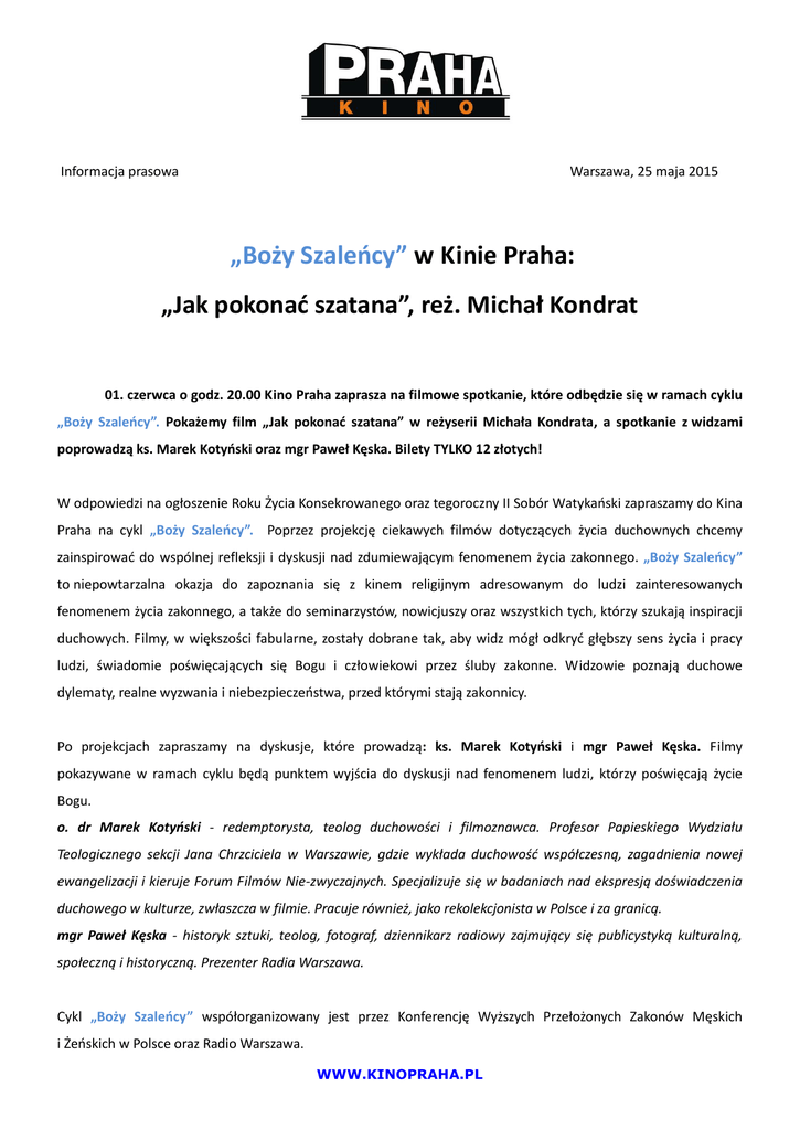 Informacja prasowa Warszawa, 25 maja 2015 „Boży Szaleńcy” w Kinie Praha: „Jak pokonać szatana”, reż. Michał Kondrat 01. czerwca o godz. 20.00 Kino Praha zaprasza na filmowe spotkanie, które odbędzie się w ramach cyklu „Boży Szaleńcy”. Pokażemy film „Jak pokonać szatana” w reżyserii Michała Kondrata, a spotkanie z widzami poprowadzą ks. Marek Kotyński oraz mgr Paweł Kęska. Bilety TYLKO 12 złotych! W odpowiedzi na ogłoszenie Roku Życia Konsekrowanego oraz tegoroczny II Sobór Watykański zapraszamy do Kina Praha na cykl „Boży Szaleńcy”. Poprzez projekcję ciekawych filmów dotyczących życia duchownych chcemy zainspirować do wspólnej refleksji i dyskusji nad zdumiewającym fenomenem życia zakonnego. „Boży Szaleńcy” to niepowtarzalna okazja do zapoznania się z kinem religijnym adresowanym do ludzi zainteresowanych fenomenem życia zakonnego, a także do seminarzystów, nowicjuszy oraz wszystkich tych, którzy szukają inspiracji duchowych. Filmy, w większości fabularne, zostały dobrane tak, aby widz mógł odkryć głębszy sens życia i pracy ludzi, świadomie poświęcających się Bogu i człowiekowi przez śluby zakonne. Widzowie poznają duchowe dylematy, realne wyzwania i niebezpieczeństwa, przed którymi stają zakonnicy. Po projekcjach zapraszamy na dyskusje, które prowadzą: ks. Marek Kotyński i mgr Paweł Kęska. Filmy pokazywane w ramach cyklu będą punktem wyjścia do dyskusji nad fenomenem ludzi, którzy poświęcają życie Bogu. o. dr Marek Kotyński - redemptorysta, teolog duchowości i filmoznawca. Profesor Papieskiego Wydziału Teologicznego sekcji Jana Chrzciciela w Warszawie, gdzie wykłada duchowość współczesną, zagadnienia nowej ewangelizacji i kieruje Forum Filmów Nie-zwyczajnych. Specjalizuje się w badaniach nad ekspresją doświadczenia duchowego w kulturze, zwłaszcza w filmie. Pracuje również, jako rekolekcjonista w Polsce i za granicą. mgr Paweł Kęska - historyk sztuki, teolog, fotograf, dziennikarz radiowy zajmujący się publicystyką kulturalną, społeczną i historyczną. Prezenter Radia Warszawa. Cykl „Boży Szaleńcy” współorganizowany jest przez Konferencję Wyższych Przełożonych Zakonów Męskich i Żeńskich w Polsce oraz Radio Warszawa. WWW.KINOPRAHA.PL PROGRAM: „Boży szaleńcy”: 11 maja, godz.20.00 – „Jak pokonać szatana” reż. Michał Kondrat, rok produkcji: 2013, czas: 1h 10min. Tematem filmu jest walka duchowa, a dokładnie walka z Szatanem. Autor filmu, Michał Kondrat, przeprowadza widza skrupulatnie przez ten problem, tłumacząc jego kontrowersyjne aspekty i udzielając wskazówek opartych na doświadczeniach Ojców Kościoła. Odwiedza najbardziej znanych egzorcystów świata, a także innych ekspertów od walki duchowej i posługi uwalniania. Z rozmów z nimi można się dowiedzieć, jakie narzędzia Kościół oferuje do walki ze złym duchem. Eksperci mówią, jak prawidłowo powinniśmy sprawować modlitwę o uwolnienie, kto może zwracać się do Szatana w formie rozkazującej, oraz jak to robić bezpiecznie. W filmie znajdzie się też wywiad z mocno dręczoną Włoszką i modlitwa nad nią. Autor filmu spotyka się również z Anią Golędzinowską, słynną modelką, która opowiada mu o silnych dręczeniach demonicznych, których doświadcza od chwili nawrócenia. PROGRAM „Boży szaleńcy” Wybrany poniedziałek, godz.20.00 Cena biletu – 12 zł INFORMCJA: Kasa Kina Praha ul. Jagiellońska 26 03-719 Warszawa tel. 22 343 03 10 KONTAKT DLA MEDIÓW: Katarzyna Polubiec-Mrowińska email: [email protected] tel. 728 875 350 WWW.KINOPRAHA.PL