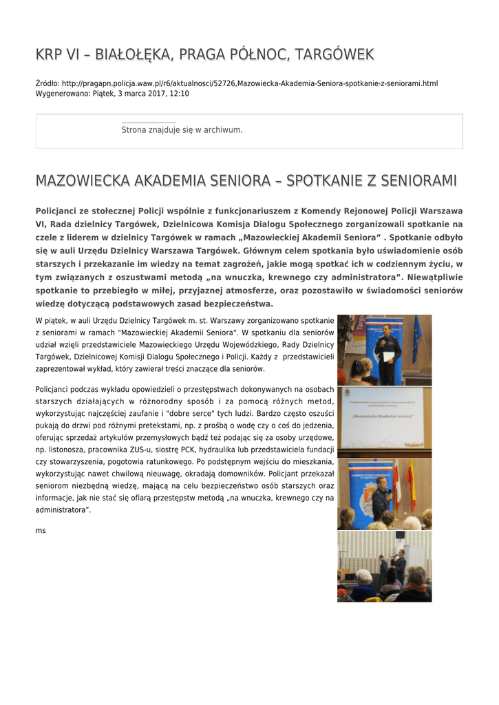 KRP VI – BIAŁOŁĘKA, PRAGA PÓŁNOC, TARGÓWEK Źródło: http://pragapn.policja.waw.pl/r6/aktualnosci/52726,Mazowiecka-Akademia-Seniora-spotkanie-z-seniorami.html Wygenerowano: Piątek, 3 marca 2017, 12:10 Strona znajduje się w archiwum. MAZOWIECKA AKADEMIA SENIORA – SPOTKANIE Z SENIORAMI Policjanci ze stołecznej Policji wspólnie z funkcjonariuszem z Komendy Rejonowej Policji Warszawa VI, Rada dzielnicy Targówek, Dzielnicowa Komisja Dialogu Społecznego zorganizowali spotkanie na czele z liderem w dzielnicy Targówek w ramach „Mazowieckiej Akademii Seniora” . Spotkanie odbyło się w auli Urzędu Dzielnicy Warszawa Targówek. Głównym celem spotkania było uświadomienie osób starszych i przekazanie im wiedzy na temat zagrożeń, jakie mogą spotkać ich w codziennym życiu, w tym związanych z oszustwami metodą „na wnuczka, krewnego czy administratora”. Niewątpliwie spotkanie to przebiegło w miłej, przyjaznej atmosferze, oraz pozostawiło w świadomości seniorów wiedzę dotyczącą podstawowych zasad bezpieczeństwa. W piątek, w auli Urzędu Dzielnicy Targówek m. st. Warszawy zorganizowano spotkanie z seniorami w ramach "Mazowieckiej Akademii Seniora". W spotkaniu dla seniorów udział wzięli przedstawiciele Mazowieckiego Urzędu Wojewódzkiego, Rady Dzielnicy Targówek, Dzielnicowej Komisji Dialogu Społecznego i Policji. Każdy z przedstawicieli zaprezentował wykład, który zawierał treści znaczące dla seniorów. Policjanci podczas wykładu opowiedzieli o przestępstwach dokonywanych na osobach starszych działających w różnorodny sposób i za pomocą różnych metod, wykorzystując najczęściej zaufanie i "dobre serce" tych ludzi. Bardzo często oszuści pukają do drzwi pod różnymi pretekstami, np. z prośbą o wodę czy o coś do jedzenia, oferując sprzedaż artykułów przemysłowych bądź też podając się za osoby urzędowe, np. listonosza, pracownika ZUS-u, siostrę PCK, hydraulika lub przedstawiciela fundacji czy stowarzyszenia, pogotowia ratunkowego. Po podstępnym wejściu do mieszkania, wykorzystując nawet chwilową nieuwagę, okradają domowników. Policjant przekazał seniorom niezbędną wiedzę, mającą na celu bezpieczeństwo osób starszych oraz informacje, jak nie stać się ofiarą przestępstw metodą „na wnuczka, krewnego czy na administratora”. ms Ocena: 0/5 (0) Tweetnij