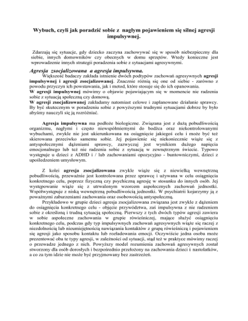 Wybuch, czyli jak poradzić sobie z nagłym pojawieniem się silnej agresji impulsywnej. Zdarzają się sytuacje, gdy dziecko zaczyna zachowywać się w sposób niebezpieczny dla siebie, innych domowników czy obecnych w domu sprzętów. Wtedy konieczne jest wprowadzenie innych strategii poradzenia sobie z sytuacjami agresywnymi. Agresja zsocjalizowana a agresja impulsywna. Większość badaczy zakłada istnienie dwóch podtypów zachowań agresywnych agresji impulsywnej i agresji zsocjalizowanej. Znacznie różnią się one od siebie - zarówno z powodu przyczyn ich powstawania, jak i metod, które stosuje się do ich opanowania. W agresji impulsywnej mówimy o objawie pojawiającym się w momencie nie radzenia sobie z sytuacją społeczną czy domową. W agresji zsocjalizowanej zakładamy natomiast celowe i zaplanowane działanie sprawcy. By być skutecznym w poradzeniu sobie z powyższymi trudnymi sytuacjami dobrze by było abyśmy nauczyli się ją rozróżniać. Agresja impulsywna ma podłoże biologiczne. Związana jest z dużą pobudliwością organizmu, nagłymi i często niewspółmiernymi do bodźca oraz niekontrolowanymi wybuchami, zwykle nie jest ukierunkowana na osiągnięcie jakiegoś celu i może być też skierowana przeciwko samemu sobie. Jej pojawienie się niekoniecznie wiąże się z antyspołecznymi dążeniami sprawcy, zazwyczaj jest wynikiem dużego napięcia emocjonalnego lub też nie radzenia sobie z sytuacją w zewnętrznym świecie. Typowo występuje u dzieci z ADHD i / lub zachowaniami opozycyjno - buntowniczymi, dzieci z upośledzeniem umysłowym. Z kolei agresja zsocjalizowana zwykle wiąże się z niewielką wewnętrzną pobudliwością, przeważnie jest kontrolowana przez sprawcę i używana w celu osiągnięcia konkretnego celu, poprzez fizyczną czy psychiczną agresję w stosunku do innych osób. Jej występowanie wiąże się z utrwalonym wzorcem aspołecznych zachowań jednostki. Współwystępuje z niską wewnętrzną pobudliwością jednostki. W psychiatrii kojarzymy ją z poważnymi zaburzeniami zachowania oraz osobowością antyspołeczną. Przykładowo w grupie dzieci agresja zsocjalizowana związana jest zwykle z dążeniem do osiągnięcia konkretnego celu - objęcie przywództwa, zaś impulsywna z nie radzeniem sobie z określoną i trudną sytuacją społeczną. Pierwszy z tych dwóch typów agresji zawiera w sobie aspołeczne zachowania w grupie rówieśniczej, mające służyć osiągnięciu konkretnego celu, podczas gdy typ impulsywnych zachowań agresywnych wiąże się raczej z niezdolnością lub nieumiejętnością nawiązania kontaktów z grupą rówieśniczą i pojawieniem się agresji jako sposobu kontaktu lub rozładowania emocji. Oczywiście jedna osoba może prezentować oba te typy agresji, w zależności od sytuacji, stąd też w praktyce mówimy raczej o przewadze jednego z nich. Powyższy model rozumienia zachowań agresywnych został stworzony dla osób dorosłych i bezpośrednio przełożony na zachowania dzieci i nastolatków, a co za tym idzie nie może być przyjmowany bez zastrzeżeń. Tabela. Porównanie agresji impulsywnej i zsocjalizowanej Agresja impulsywna Agresja zsocjalizowana Wydaje się mieć biologiczne podłoże, Wydaje się być wyuczonym zachowaniem , można ją modelować technikami socjoz niewielkim wpływem czynników biologiczterapeutycznymi oraz leczeniem nych, można ją modelować technikami farmakologicznym behawioralnymi oraz poznawczymi Związana jest z dużą pobudliwością Związana jest z małą pobudliwością. Wydaje organizmu, nagłymi i często niewspół się być całkowicie kontrolowana przez miernymi do bodźca, niekontrolowanymi sprawcę reakcjami wybuchowymi Zwykle nie jest ukierunkowana na Jest ukierunkowana na osiągnięcie celu. osiągnięcie jakiegoś celu Może być skierowana przeciwko samemu Z definicji jest skierowana przeciwko innym sobie osobom Jej pojawienie nie musi wiązać się z Jej stałe pojawianie się zazwyczaj wiąże się z antyspołecznymi dążeniami sprawcy utrwalonymi zachowaniami aspołecznvmi W tym rozdziale opiszemy techniki radzenia sobie z przejawami agresji impulsywnej. Jeśli wasze dziecko przejawia liczne zachowania związane z agresją zsocjalizowaną poszukajcie jak najszybciej profesjonalnej pomocy, ponieważ sytuacja wymyka się spod kontroli i sami nie podołacie z jej rozwiązaniem. Wybuch – metody zapanowania nad trudnymi, impulsywnymi zachowaniami dziecka. W przypadku pojawienia się wybuchu nasze działania są różne w zależności od momentu, w którym mamy interweniować. A więc możemy działać: A. Zanim dojdzie do wybuchu B. W trakcie trwania wybuchu C. Po jego zakończeniu. Zacznijmy nietypowo od "B", czyli momentu trudnego, budzącego najwięcej emocji i przykuwającego uwagę, momentu, kiedy dziecko zaczyna rzucać się na ziemię, tupać, krzyczeć, rzuca krzesłem w ścianę, uderza głową w podłogę lub bije mamę. W przypadku, gdy dojdzie już do wybuchu rodzice koniecznie muszą pamiętać o podstawowej zasadzie - uwaga jest nagrodą dla dziecka. Czym więcej jej w tym momencie okażemy, tym bardziej nasilmy wybuch. Warto zabrać uwagę, gdyż żaden aktor nie chce grać przed pustą widownią. By bezpiecznie przetrwać wybuch: W czasie wybuchu interweniujący opiekun jest strażakiem. W tym momencie ma gasić pożar, a nie zastanawiać się, dlaczego miasto płonie. Na poznanie przyczyny pożaru przyjdzie czas znacznie później Uwaga dorosłego = dolewanie oliwy do ognia Brak uwagi = zastosowanie gaśnicy Podczas wybuchu można zabierać dziecku uwagę na dwa podstawowe sposoby - w zależności od tego czy jego zachowanie jest bezpieczne dla siebie i otoczenia, czy też nie. W pierwszym przypadku metodą z wyboru, trudną do zastosowania dla rodziców, ale i bolesną dla dziecka jest nie zwracanie uwagi na dziecko i czekanie. Agresja impulsywna pojawia się w momencie, kiedy sytuacja przerasta możliwości dziecka, wtedy