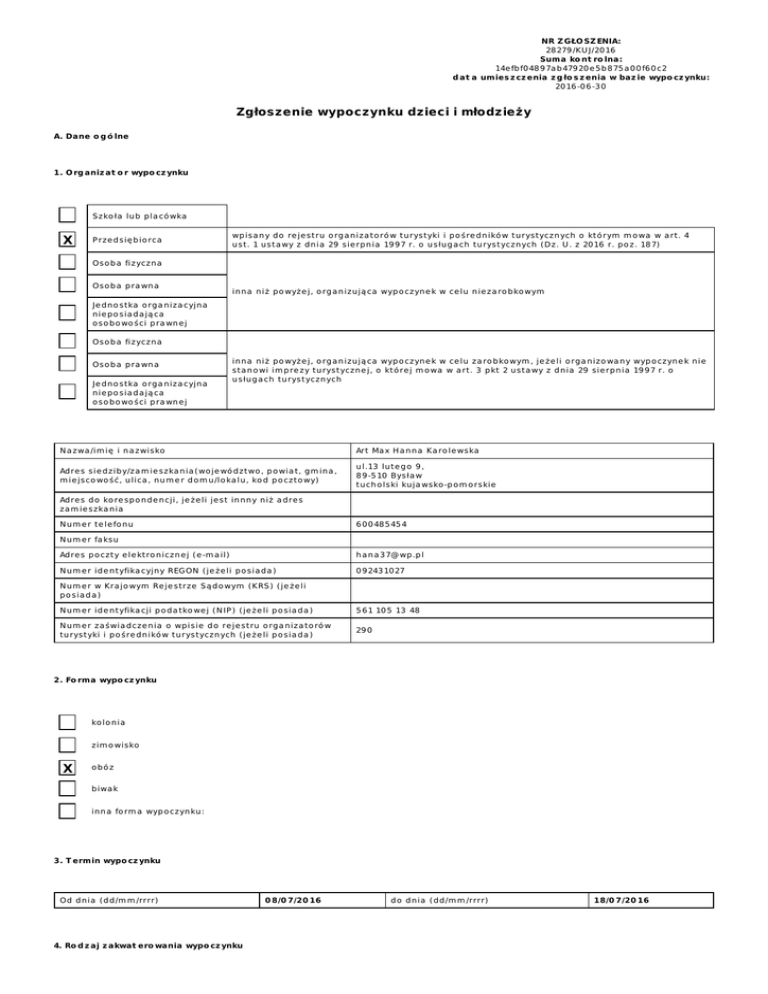 NR Z GŁO SZ ENIA: 28 279 /KU J/20 16 Suma ko nt ro lna: 14e fb f0 48 9 7a b 479 20 e 5 b 8 75 a 0 0 f6 0 c2 d at a umies z cz enia z g ło s z enia w baz ie wypo cz ynku: 20 16 -0 6 -3 0 Zgłoszenie wypoczynku dzieci i młodzieży A. Dane o g ó lne 1. O rg aniz at o r wypo cz ynku S z ko ła lu b p la có wka X P rz e d s ię b io rca wp is a n y d o re je s t ru o rg a n iz a t o ró w t u rys t yki i p o ś re d n ikó w t u rys t ycz n ych o kt ó rym m o wa w a rt . 4 u s t . 1 u s t a wy z d n ia 29 s ie rp n ia 19 9 7 r. o u s łu g a ch t u rys t ycz n ych ( D z . U . z 20 16 r. p o z . 18 7) Os o b a fiz ycz n a Os o b a p ra wn a in n a n iż p o wyż e j, o rg a n iz u ją ca wyp o cz yn e k w ce lu n ie z a ro b ko wym Je d n o s t ka o rg a n iz a cyjn a n ie p o s ia d a ją ca o s o b o wo ś ci p ra wn e j Os o b a fiz ycz n a Os o b a p ra wn a Je d n o s t ka o rg a n iz a cyjn a n ie p o s ia d a ją ca o s o b o wo ś ci p ra wn e j in n a n iż p o wyż e j, o rg a n iz u ją ca wyp o cz yn e k w ce lu z a ro b ko wym , je ż e li o rg a n iz o wa n y wyp o cz yn e k n ie s t a n o wi im p re z y t u rys t ycz n e j, o kt ó re j m o wa w a rt . 3 p kt 2 u s t a wy z d n ia 29 s ie rp n ia 19 9 7 r. o u s łu g a ch t u rys t ycz n ych N a z wa /im ię i n a z wis ko Art Ma x H a n n a Ka ro le ws ka Ad re s s ie d z ib y/z a m ie s z ka n ia ( wo je wó d z t wo , p o wia t , g m in a , m ie js co wo ś ć, u lica , n u m e r d o m u /lo ka lu , ko d p o cz t o wy) u l.13 lu t e g o 9 , 8 9 -5 10 Bys ła w t u ch o ls ki ku ja ws ko -p o m o rs kie Ad re s d o ko re s p o n d e n cji, je ż e li je s t in n n y n iż a d re s z a m ie s z ka n ia N u m e r t e le fo n u 6 0 0 48 5 45 4 N u m e r fa ks u Ad re s p o cz t y e le kt ro n icz n e j ( e -m a il) h a n a 3 7@ wp .p l N u m e r id e n t yfika cyjn y REG ON ( je ż e li p o s ia d a ) 0 9 243 10 27 N u m e r w Kra jo wym Re je s t rz e S ą d o wym ( KRS ) ( je ż e li p o s ia d a ) N u m e r id e n t yfika cji p o d a t ko we j ( N IP ) ( je ż e li p o s ia d a ) 5 6 1 10 5 13 48 N u m e r z a ś wia d cz e n ia o wp is ie d o re je s t ru o rg a n iz a t o ró w t u rys t yki i p o ś re d n ikó w t u rys t ycz n ych ( je ż e li p o s ia d a ) 29 0 2. Fo rma wypo cz ynku ko lo n ia z im o wis ko X obóz b iwa k in n a fo rm a wyp o cz yn ku : 3. T ermin wypo cz ynku Od d n ia ( d d /m m /rrrr) 4. Ro d z aj z akwat ero wania wypo cz ynku 0 8/0 7/20 16 d o d n ia ( d d /m m /rrrr) 18/0 7/20 16 X wyp o cz yn e k w o b ie kcie h o t e la rs kim lu b in n ym o b ie kcie , w kt ó rym ś wia d cz o n e s ą u s łu g i h o t e la rs kie , o kt ó rym m o wa w u s t a wie z d n ia 29 s ie rp n ia 19 9 7 r. o u s łu g a ch t u rys t ycz n ych wyp o cz yn e k w o b ie kcie u ż ywa n ym o ka z jo n a ln ie d o wyp o cz yn ku wyp o cz yn e k b e z s t a łe j in fra s t ru kt u ry ko m u n a ln e j wyp o cz yn e k o ch a ra kt e rz e wę d ro wn ym 1. N a z wa o b ie kt u S t a n ica Wo d n a P TTK ALBATROS 2. Ad re s /m ie js ce lo ka liz a cji wyp o cz yn ku : wo je wó d z t wo , p o wia t , g m in a , m ie js co wo ś ć, u lica , n r b u d yn ku /lo ka lu , ko d p o cz t o wy ( lu b in n e o kre ś le n ie lo ka liz a cji - d o t . o b o z ó w p o d n a m io t a m i, b iwa kó w) , n u m e r t e le fo n u , fa ks u S o ko le -Ku ź n ica Lu b ie wo 8 9 -5 26 3 a . Wo d a X b ie ż ą ca X z im n a X cie p ła in n a 3 b . S a n it a ria t y licz b a u m ywa le k 12 licz b a u s t ę p ó w 8 licz b a n a t rys kó w 5 X o d d z ie ln e p o m ie s z cz e n ia d la ch ło p có w i d z ie wcz ą t 3 c. Wyd z ie lo n e p o m ie s z cz e n ia /m ie js ca n a p ra n ie /s u s z e n ie m o kre j o d z ie ż y s p rz ę t p o rz ą d ko wy i ś ro d ki cz ys t o ś ci 3 . Wa ru n ki s a n it a rn o h ig ie n icz n e w o b ie kcie /m ie js cu b e z s t a łe j in fra s t ru kt u ry p rz e ch o wywa n ie b ru d n e j i cz ys t e j b ie liz n y p o ś cie lo we j o d p a d y ko m u n a ln e 3 d . Za o p a t rz e n ie w ś ro d ki cz ys t o ś ci X p a p ie r t o a le t o wy X m yd ło w p łyn ie X rę cz n iki je d n o ra z o we g o u ż yt ku lu b s u s z a rki d o rą k X ko s z e n a ś m ie ci 3 e . Op is s p o s o b u ż ywie n ia X n a m ie js cu ku ch n ia ja d a ln ia in n e 4. In fo rm a cja o s p o s o b ie z a p e wn ie n ia u cz e s t n iko m wyp o cz yn ku d o s t ę p u d o o p ie ki m e d ycz n e j 4a . Zn a jo m o ś ć d a n ych t e le a d re s o wych , g o d z in p rz yję ć o ra z z a kre s u ś wia d cz e ń o p ie ki z d ro wo t n e j wła ś ciwe g o ś wia d cz e n io d a wcy, u d z ie la ją ce g o ś wia d cz e ń o p ie ki z d ro wo t n e j n a z a s a d a ch o kre ś lo n ych w u s t a wie z d n ia 27 s ie rp n ia 20 0 4 r. o ś wia d cz e n ia ch o p ie ki z d ro wo t n e j fin a n s o wa n ych z e ś ro d kó w p u b licz n ych ( D z . U . z 20 15 r. p o z . 5 8 1, z p ó ź ń . z m .) TAK z le ka rz e m z p ie lę g n ia rką 4b . U m o wa z a wa rt a o u d z ie la n ie ś wia d cz e ń o p ie k z d ro wo t n e j z ra t o wn ikie m m e d ycz n ym in n e ...... 4c. Wyd z ie lo n y g a b in e t le ka rs ki N IE 4d . Wyd z ie lo n y g a b in e t p ie lę g n ia rs ki N IE 4d . Wyd z ie lo n a iz o la t ka N IE ką p ie lis ko m ie js ce wyko rz ys t ywa n e d o ką p ie li 5 . Be z p ie cz n e ko rz ys t a n ie z wyz n a cz o n ych o b s z a ró w wo d n ych p ływa ln ia in n e .... g ó ry p a rki n a rcia rs kie 5 . Be z p ie cz n e p rz e b ywa n ie w g ó ra ch o ra z n a z o rg a n iz o wa n ych t e re n a ch n a rcia rs kich p ó łki ćwicz e b n e n a rcia rs kie t ra s y b ie g o we n a rcia rs kie t ra s y z ja z d o we n a rt o s t ra d y 5. Inf o rmacje o licz bie ucz es t nikó w wypo cz ynku 5 a . Łą cz n a licz b a u cz e s t n ikó w wyp o cz yn ku , w t ym : 15 - p o wyż e j 10 ro ku ż ycia 9 - p o n iż e j 10 ro ku ż ycia ( i w wie ku 10 la t ) 6 5 b . N ie p