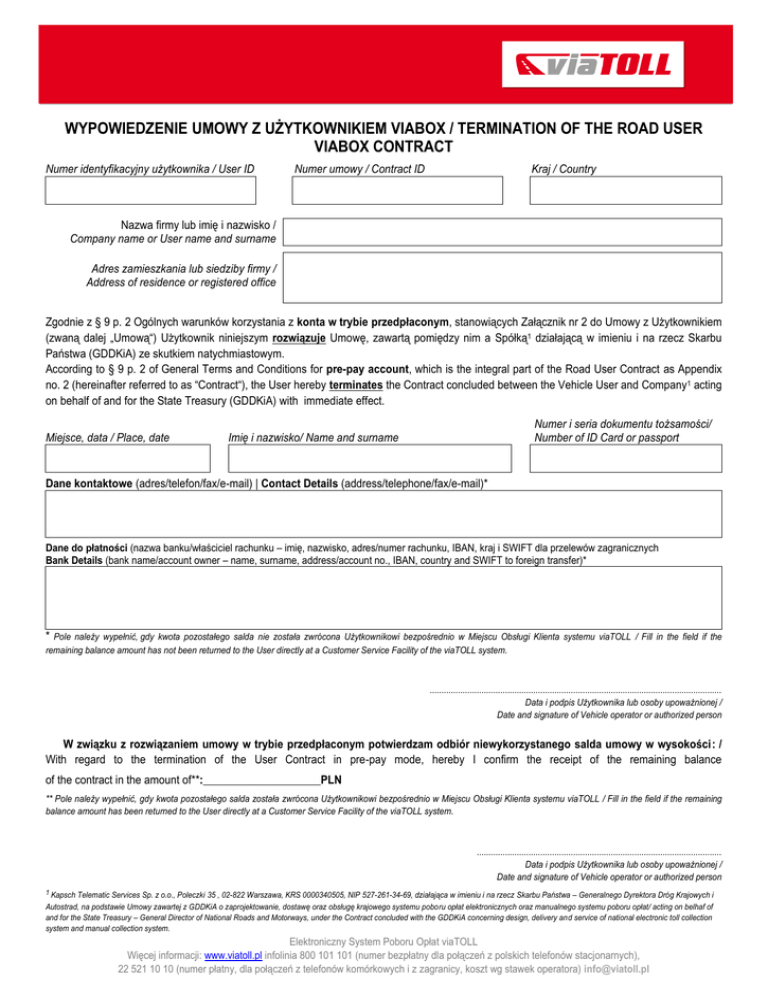WYPOWIEDZENIE UMOWY Z UŻYTKOWNIKIEM VIABOX / TERMINATION OF THE ROAD USER VIABOX CONTRACT Numer identyfikacyjny użytkownika / User ID Numer umowy / Contract ID Kraj / Country Nazwa firmy lub imię i nazwisko / Company name or User name and surname Adres zamieszkania lub siedziby firmy / Address of residence or registered office Zgodnie z § 9 p. 2 Ogólnych warunków korzystania z konta w trybie przedpłaconym, stanowiących Załącznik nr 2 do Umowy z Użytkownikiem (zwaną dalej „Umową“) Użytkownik niniejszym rozwiązuje Umowę, zawartą pomiędzy nim a Spółką1 działającą w imieniu i na rzecz Skarbu Państwa (GDDKiA) ze skutkiem natychmiastowym. According to § 9 p. 2 of General Terms and Conditions for pre-pay account, which is the integral part of the Road User Contract as Appendix no. 2 (hereinafter referred to as “Contract“), the User hereby terminates the Contract concluded between the Vehicle User and Company1 acting on behalf of and for the State Treasury (GDDKiA) with immediate effect. Miejsce, data / Place, date Numer i seria dokumentu tożsamości/ Number of ID Card or passport Imię i nazwisko/ Name and surname Dane kontaktowe (adres/telefon/fax/e-mail) | Contact Details (address/telephone/fax/e-mail)* Dane do płatności (nazwa banku/właściciel rachunku – imię, nazwisko, adres/numer rachunku, IBAN, kraj i SWIFT dla przelewów zagranicznych Bank Details (bank name/account owner – name, surname, address/account no., IBAN, country and SWIFT to foreign transfer)* * Pole należy wypełnić, gdy kwota pozostałego salda nie została zwrócona Użytkownikowi bezpośrednio w Miejscu Obsługi Klienta systemu viaTOLL / Fill in the field if the remaining balance amount has not been returned to the User directly at a Customer Service Facility of the viaTOLL system. ............................................................................................................................ Data i podpis Użytkownika lub osoby upoważnionej / Date and signature of Vehicle operator or authorized person W związku z rozwiązaniem umowy w trybie przedpłaconym potwierdzam odbiór niewykorzystanego salda umowy w wysokości: / With regard to the termination of the User Contract in pre-pay mode, hereby I confirm the receipt of the remaining balance of the contract in the amount of**:____________________PLN ** Pole należy wypełnić, gdy kwota pozostałego salda została zwrócona Użytkownikowi bezpośrednio w Miejscu Obsługi Klienta systemu viaTOLL / Fill in the field if the remaining balance amount has been returned to the User directly at a Customer Service Facility of the viaTOLL system. ........................................................................................................ Data i podpis Użytkownika lub osoby upoważnionej / Date and signature of Vehicle operator or authorized person 1 Kapsch Telematic Services Sp. z o.o., Poleczki 35 , 02-822 Warszawa, KRS 0000340505, NIP 527-261-34-69, działająca w imieniu i na rzecz Skarbu Państwa – Generalnego Dyrektora Dróg Krajowych i Autostrad, na podstawie Umowy zawartej z GDDKiA o zaprojektowanie, dostawę oraz obsługę krajowego systemu poboru opłat elektronicznych oraz manualnego systemu poboru opłat/ acting on belhaf of and for the State Treasury – General Director of National Roads and Motorways, under the Contract concluded with the GDDKiA concerning design, delivery and service of national electronic toll collection system and manual collection system. Elektroniczny System Poboru Opłat viaTOLL Więcej informacji: www.viatoll.pl infolinia 800 101 101 (numer bezpłatny dla połączeń z polskich telefonów stacjonarnych), 22 521 10 10 (numer płatny, dla połączeń z telefonów komórkowych i z zagranicy, koszt wg stawek operatora) [email protected]
