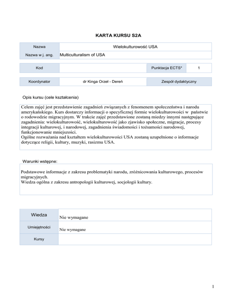 KARTA KURSU S2A Wielokulturowość USA Nazwa Nazwa w j. ang. Multiculturalism of USA Kod Punktacja ECTS* dr Kinga Orzeł - Dereń Koordynator 1 Zespół dydaktyczny Opis kursu (cele kształcenia) Celem zajęć jest przedstawienie zagadnień związanych z fenomenem społeczeństwa i narodu amerykańskiego. Kurs dostarczy informacji o specyficznej formie wielokulturowości w państwie o rodowodzie migracyjnym. W trakcie zajęć przedstawione zostaną miedzy innymi następujące zagadnienia: wielokulturowość, wielokulturowość jako zjawisko społeczne, migracje, procesy integracji kulturowej, i narodowej, zagadnienia świadomości i tożsamości narodowej, funkcjonowanie mniejszości. Ogólne rozważania nad kształtem wielokulturowości USA zostaną uzupełnione o informacje dotyczące religii, kultury, muzyki, rasizmu USA. Warunki wstępne: Podstawowe informacje z zakresu problematyki narodu, zróżnicowania kulturowego, procesów migracyjnych. Wiedza ogólna z zakresu antropologii kulturowej, socjologii kultury. Wiedza Umiejętności Nie wymagane Nie wymagane Kursy 1 Efekty kształcenia Efekt kształcenia dla kursu Uczestnik kursu nabywa: -wiedzę w zakresie kluczowych pojęć i koncepcji teoretycznych -wiedzę dotyczącą przemian etniczności ze szczególnym uwzględnieniem czynnika migracji, Odniesienie do efektów kierunkowych K_W06 K_W07 K_W08 K_W10 - podstawową wiedzę w zakresie historii USA, historii i rodowodu społeczeństwa amerykańskiego Wiedza - wiedzę dotyczącą przyczyn zróżnicowania etnicznego USA - wiedzę dotyczącą procesów asymilacji, rozwoju wielokulturowości, pluralizmu, stosunków społecznych oraz etnicznych - wiedzę w zakresie amerykańskiego procesu narodotwórczego oraz imigracyjnego rodowodu USA - wiedzę z zakresu współczesnej kultury USA Efekt kształcenia dla kursu Odniesienie do efektów kierunkowych Uczestnik kursu nabywa: Umiejętności K_U01 K_U04 - umiejętności w zakresie badania problemów K_U08 etnicznych ze szczególnym uwzględnieniem: K_U13 tożsamości kulturowej , pamięci kulturowej, K_U14 nacjonalizmu, migracji, rasizmu K_K01 - uwrażliwienie na kwestię praw mniejszości K_K04 narodowych i etnicznych, K_K05 - uwrażliwienie na temat etycznego aspektu studiów K_K06 nad tożsamością etniczną - rozróżnia asymilację od integracji - umiejętności w zakresie opisu społeczeństwa amerykańskiego i jego historii jak i historii USA 2 Organizacja Forma zajęć Ćwiczenia w grupach Wykład (W) A Liczba godzin K L S P E 10 Opis metod prowadzenia zajęć e-learning W06 W07 W8 W10 KU01 KU04 KU08 x x x x x x x Kryteria oceny Inne Egzamin pisemny Egzamin ustny Praca pisemna (esej) Referat Udział w dyskusji Projekt grupowy Projekt indywidualny Praca laboratoryjna Zajęcia terenowe Ćwiczenia w szkole Gry dydaktyczne E – learning Formy sprawdzania efektów kształcenia x x x x x x x Wykład: warunkiem zaliczenia kursu jest udział w zajęciach (50%) zaliczenie testu (50%) 3 brak Uwagi Treści merytoryczne (wykaz tematów) 1. Naród czy państwo? Kultura czy cywilizacja? Pluralistyczny, imigracyjny rodowód i charakter społeczeństwa amerykańskiego. Etniczność i asymilacja. Wielokulturowość. Mit amerykański i poczucie misji dziejowej protestanckich grup wyznaniowych. 2. Historyczny proces kształtowania się kultury amerykańskiej: rekonstrukcja głównych faz. Ameryka jako miejsce spotkania wielu kultur: grup etnicznych, religijnych, rasowych, językowych. Indianie, Europejczycy, Azjaci, kolorowi Amerykanie. 3. Społeczeństwo o imigracyjnej etnogenezie. Periodyzacja migracji. Główne fazy imigracji. Ekspansja na Zachód. Gospodarcze i społeczne skutki ekspansji. Kulturowe następstwa rozwoju gospodarczego i społecznego. 4.Procesy integracji kulturowej i narodowej. Ideologie i teorie asymilacji. Socjologiczne koncepcje „anglokonformizmu”, „melting pot” i „mozaiki kulturowej”. 5. Zagadnienia solidarności i świadomości narodowej. Tożsamość narodowa a kultura amerykańska. 6.Kultura masowa a globalizacja kulturowa. Cechy amerykańskiej kultury. Rozwój cywilizacyjny i technologiczny. 7.Perspektywy rozwoju kultury amerykańskiej. Procesy „amerykanizacji” kultury globalnej. Nowy Jork, San Franscisco i Los Angeles światowymi cantrami kultury i sztuki. 8.Zjawiska komercjalizacji i egalitaryzm amerykańskich środowisk twórczych. 9.Pobocza wielokulturowości. Zjawiska masowej kontestacji. Subkultury. 10. Próba teoretycznej rekonstrukcji stanu i funkcji kultury amerykańskiej: naród, kultura, cywilizacja i system społeczny Wykaz literatury podstawowej B Beard Ch., Beard M., 1961; Rozwój cywilizacji amerykańskiej, Warszawa Ch Chłasiński J., 1970; Kultura amerykańska. Formowanie się kultury narodowej w Stanach Zjednoczonych Ameryki, Ludowa Spółdzielnia Wydawnicza, Warszawa. Kapiszewski A., 1981; Ideologie i teorie procesów asymilacji w USA. Szkic problemu, w: „Przegląd Polonijny”, cz.I, z.1, s.5-24, cz.II, z.3, s.19-35, cz.II, z.4, s.5-15. Ku Kubiak H., 1975; Rodowód narodu amerykańskiego, Wydawnictwo Literackie, Kraków. Paleczny T., 2005 „Współczesne społeczeństwo amerykańskie w perspektywie socjologicznej” ♦ Rokicki, J., 2002 „Kolor, pochodzenie, kultura, Universitas, Kraków. Pa Wykaz literatury uzupełniającej 4 Higham, J. „Rola imigracji w historii Ameryki” oraz „Integracja a pluralizm: jeszcze jeden amerykański dylemat”, w: Lawrence Orton (red.), Dwieście lat USA. Ideały i paradoksy historii amerykańskiej, Warszawa 1984 Świątkowski, A., Tolerancja religijna a polityka społeczna władz amerykańskich, Kraków 1986 Bilans godzinowy zgodny z CNPS (Całkowity Nakład Pracy Studenta) Wykład e-learning Ilość godzin pracy studenta bez kontaktu z prowadzącymi wykład 10 Lektura w ramach przygotowania do zajęć 10 Przygotowanie do testu 5 Ogółem bilans czasu pracy 25 Ilość punktów ECTS w zależności od przyjętego przelicznika 5