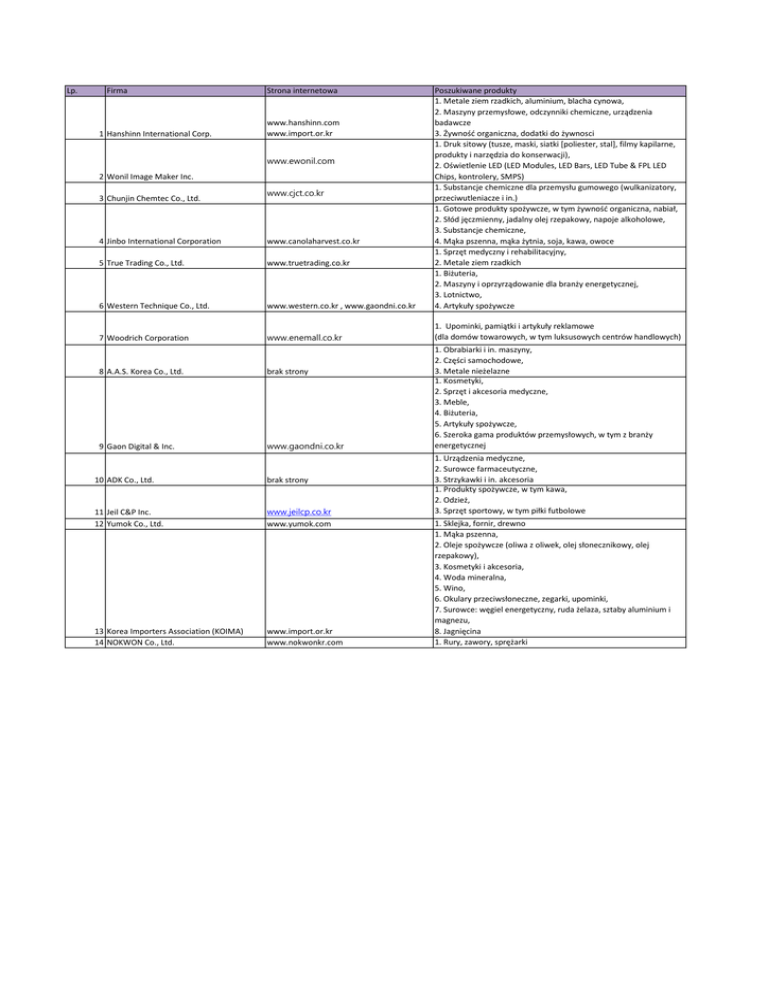 Lp. Firma 4 Jinbo International Corporation www.canolaharvest.co.kr 5 True Trading Co., Ltd. www.truetrading.co.kr 6 Western Technique Co., Ltd. www.western.co.kr , www.gaondni.co.kr Poszukiwane produkty 1. Metale ziem rzadkich, aluminium, blacha cynowa, 2. Maszyny przemysłowe, odczynniki chemiczne, urządzenia badawcze 3. Żywność organiczna, dodatki do żywnosci 1. Druk sitowy (tusze, maski, siatki [poliester, stal], filmy kapilarne, produkty i narzędzia do konserwacji), 2. Oświetlenie LED (LED Modules, LED Bars, LED Tube & FPL LED Chips, kontrolery, SMPS) 1. Substancje chemiczne dla przemysłu gumowego (wulkanizatory, przeciwutleniacze i in.) 1. Gotowe produkty spożywcze, w tym żywność organiczna, nabiał, 2. Słód jęczmienny, jadalny olej rzepakowy, napoje alkoholowe, 3. Substancje chemiczne, 4. Mąka pszenna, mąka żytnia, soja, kawa, owoce 1. Sprzęt medyczny i rehabilitacyjny, 2. Metale ziem rzadkich 1. Biżuteria, 2. Maszyny i oprzyrządowanie dla branży energetycznej, 3. Lotnictwo, 4. Artykuły spożywcze www.enemall.co.kr 1. Upominki, pamiątki i artykuły reklamowe (dla domów towarowych, w tym luksusowych centrów handlowych) 1 Hanshinn International Corp. Strona internetowa www.hanshinn.com www.import.or.kr www.ewonil.com 2 Wonil Image Maker Inc. 3 Chunjin Chemtec Co., Ltd. 7 Woodrich Corporation www.cjct.co.kr 8 A.A.S. Korea Co., Ltd. brak strony 9 Gaon Digital & Inc. www.gaondni.co.kr 10 ADK Co., Ltd. brak strony 11 Jeil C&P Inc. 12 Yumok Co., Ltd. www.jeilcp.co.kr www.yumok.com 13 Korea Importers Association (KOIMA) 14 NOKWON Co., Ltd. www.import.or.kr www.nokwonkr.com 1. Obrabiarki i in. maszyny, 2. Części samochodowe, 3. Metale nieżelazne 1. Kosmetyki, 2. Sprzęt i akcesoria medyczne, 3. Meble, 4. Biżuteria, 5. Artykuły spożywcze, 6. Szeroka gama produktów przemysłowych, w tym z branży energetycznej 1. Urządzenia medyczne, 2. Surowce farmaceutyczne, 3. Strzykawki i in. akcesoria 1. Produkty spożywcze, w tym kawa, 2. Odzież, 3. Sprzęt sportowy, w tym piłki futbolowe 1. Sklejka, fornir, drewno 1. Mąka pszenna, 2. Oleje spożywcze (oliwa z oliwek, olej słonecznikowy, olej rzepakowy), 3. Kosmetyki i akcesoria, 4. Woda mineralna, 5. Wino, 6. Okulary przeciwsłoneczne, zegarki, upominki, 7. Surowce: węgiel energetyczny, ruda żelaza, sztaby aluminium i magnezu, 8. Jagnięcina 1. Rury, zawory, sprężarki