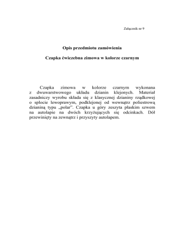 Załącznik nr 9 Opis przedmiotu zamówienia Czapka ćwiczebna zimowa w kolorze czarnym Czapka zimowa w kolorze czarnym wykonana z dwuwarstwowego układu dzianin klejonych. Materiał zasadniczy wyrobu składa się z klasycznej dzianiny rządkowej o splocie lewoprawym, podklejonej od wewnątrz poliestrową dzianiną typu „polar”. Czapka u góry zeszyta płaskim szwem na autolapie na dwóch krzyżujących się odcinkach. Dół przewinięty na zewnątrz i przyszyty autolapem.