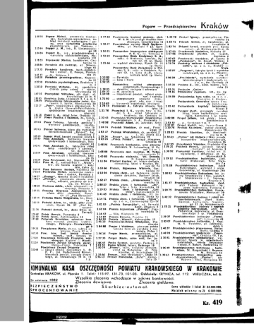 Popów — Przedsiębiorstwo KräkÓW 1 38 92 Popów Michał, pracownia blachar- 177 33 Powielarnia bratniej pomocy, stad. I 145 78 Pretzel Ignacy przemysłowiec, Flo ska, budowlano-warsztatowa, zaW. S. H. (Wyższego Studium Han- I riańska 31 kład instalacji wodociągów I gadlowego), Lenartowicza 11 162 71 Privsek Antoni, dr, handlowiec, pl. zu, oraz wytwórnia przyborów 130 47 Powrożnleze wyroby Marli SpytkowInwalidów 8 pszczelmczych, św. Tomasza J sklej, p l . Mariacki 7 ( p . Spvt- 1 83 74 Prizant Izrael, urzędnik pow. banku 115 64 Popper J. M . , inż., B. Limanowskiekowska) zwlązk., al. Mickiewicza 55 m. 15 go 50 11021 Powszechne towarzystwo elektryczne 137 23 Prochownik Kazimierz, Kielecka 37 104 84 Popper K., inż., przedsiębiorstwo A. E. Q., św. Tomasza 8 167 96 Prochowski Józefat, dr, rzeżnik, warsztaty elektrotechniczne, Ma 152 25 Powszechny Bank Kredytowy S. A., Szpitalna 4 zowiecka 131 oddz. w Krakowie, centrala. Ry 183 65 Prochowski Stanisław, pl. Lasoty 3 178 55 Poprawski Marian, handlowiec, Gar nek Gł. 36 (p. Bank) 12918 „Produkcja", M. Knopf, Wolnica 4 barska 15 12166 — wydział dewizowy, Rynek Gł. 3517574 Produkty naftowe i chemiczne „Polnafta", sp. z o. o., Kraków — (p. Bank) 2 05 84 Poradnia dla zwierząt, al. Słowac Wista Powszechny Bank Związkowy w Pol kiego 66 sce, S. A., oddz. w Krakowie, Ry 2 05 97 „Progress", fabryka łyżek I wyrobów 173 35 Poradnia handlowa, buch.-podatko nek Gł. 4 4 , Linia A—B, własna metalowych, sp. z o. o., Płaszowwa i asekur., E. Pompa, Floriańcentrala telef. (p. Bank) ska 46 147 37 — m.. Szopena 1 115 80 — Dyrekcja 2 06 29 „Pro-lnlecta", wytwórnia wyrobów 163 20 Poradnia przeciwgruźlicza, Koperni 115 81 — kasa i biura laboratoryjnych i medycznych, sp. ka 20 152 35 z o. o., Św. Gertrudy 29 Powszechny zakład ubezpieczeń 1 25 32 Prokesz Z., inż., konc. budów., Sze 215 59 Poradnia psychologiczna, Rzeźnicza 3 wzajemnych, Dunajewskiego 3 roka 33 m. 4 183 31 Prokocim ,,Gmina" 11012 Porańskl Wilhelm, dr, specjalista 138 05 — dyrektor, zastępca i sekretarz 1 7816 Prokocimcr Zygmunt, inż., św. Ag Chorób jamy ustnej I zębów, 104 37 — m. dyrektora nieszki 2 Sławkowska 28 110 48 — inspektorat powiat., relerat pogo rzel, i rachuby 154 59 Prokocimska huta szklą, sp. z o. o.. 107 35 Porczyński Wltoslaw, płk dypl., a l . umowne (ogn., Krasińskiego 32 m. 8 17292 — ubezpieczenie Prokocim, k. Krakowa 183 95 Porębska Zofia, Czapskich 3,1. p. m. 5 grad., odp. cyw. i inne) Prokuratoria Generalna (patrz Urzę 144 99 Porozumienie fabrykantów świec, kie 2 10 65 — kierownik organizacji, akwizycji dy państwowe) rownik S. Safrin, Sławkowska 30 178 73 Poznański A., fabryka obuwia, Sof 102 42 Prokuratoria kapituły katedralnej, 11317 „Port", towarzystwo ubezpieczeń, S. ty ka 19 Wawel 3 A. (patrz Generali-Port-Polonla, 12178 Poznański 1. K., wyrób. baw. w Ło 17105 Propper Józef, przysięgły rewident zjednoczone towarzystwa ubez dzi, S. A., skład fabryczny w ksiąg, biuro buchalteryjno rewi pieczeń) Krakowie, Św. Gertrudy 16 zyjne, Karmelicka 5 (p. biuro) 14118 Poser I . A . , skład luter. Grodzka 31 13343 Poznańsko-Warszawskie towarzystwo 182 88 Propst Juliusz, Inł. elektr., biuro, i 11797 Poser Paulina I Salomon, m., Grodz ubezpieczeń, S. A., Floriańska 51 Zyblikiewicza 9 ka 32 1 48 98 Pozowski Adam, dr, adwokat, Szlak 153 32 — m., Syrokomli 7 m. 8 15464 Poser Tobiasz, fabryka guzików i 32 117 87 Propst Rudolf, inż., Sereno-Fenna 8 wyrobów galalitowych, Józefiń 104 74 Poźi/lak Stanisław, dr med., Potoc 110 78 Prostak Kazimierz, zakład ślusarski, ska 20 kiego 13 Romanowicza 23 143 63 Posner Salomon, biuro dla tranzakcjl ,183 47 Poźniak Włodzimierz, dr, asystent U. 128 85 'Prostak Stanisław, dr, Sienkiewi nieruchomościami „Rekord", Św. J., Ks. Józefa 55 a cza 2a ni. 8 Sebastiana 7 1 30 63 „Protos" (dr Halpern i Ska), przeds. 155 29 Posner Wolf, handel owoców, Józefa 5 1 59 34 „ P r a c a " , św. Sebastiana 19 transportów międzynarodowych. 107 80 Poss Abraham, hurtownia towarów 2 05 24 „Praca Polska", zarząd okręgowy, Orodzka 40 Floriańska 65 spożywczych 1 kolonialnych, Koś ciuszki 13 1 48 96 Pracownia kostiumów, oraz płaszczy 1 67 95 Prozolowicz Stanisław, Prądnicka 61a 14196 Poss Abraham J., fabryczny skład damskich, M . Luksemburg, M . Ry 12631 Próchnik Henryk, dyrektor fabryki „Suchard , p l . Kossaka 3 lamp elektrycznych I żarówek nek 2/3 m 130 92 Prószyński Aureliusz, zakład art. l i 210 09 Poss Abraham, sprzeda'ż^tow.'rów '' * : ^ 34 ° ' tograficzny, i offsetowy, p l . Ja Zwierzyniecka spożywczych i kolonialnych, Dłu błonowskich 5 143 80 Pracownia stolarska, Wł. Derenia, ga 25 B. Limanowskiego 18 11912 Przedsiębiorstwo budowlane, arch. 146 29 Poss Ferdynand, inż., Starowiślna 43 11184 Praetzel Gustaw, dr, lekarz-dentysta, Karol Redkowski, Wita Stwo 11814 Poss M. L., zawiadowca f. „Wisła", sza 7 a stomatolog latem w Krynicy, Ry tow. dla handlu węglem i kok nek Gł. 24 171 28 Przedsiębiorstwo budowlane, Adolf sem, Celna 12 163 66 Pralnia, Bigoszowa Wiktoria, Rottersmann, architekt i upow. Gar 126 40 Poss Salomon Berisch, Paulińska 30 budowniczy, al. Krasińskiego 24 b barska 22 17210 Postawka Stefan, wytwórnia cukier 1 00 93 Przedsiębiorstwo Budowlane, inż. Je ków i ciastek, Bartosza 1 2 10 04 Pralnia chem., art. larbiarnia, czysz rzy Struszklewlcz I Ska, wspólwł. czenie dywanów, Bachner Jakub, 12417 „Postęp", fabryka mydła w Krakowie J. Struszkfewicz i J. Szprung, Stradom 10 14814 „Postęp", pracownia obuwia oraz Krupnicza 5 wełny, włóczki, przybory do szy 162 67 Pralnia chem., „Krakowianka", Sta rowiślna 18 18137 Przedsiębiorstwo budowlane, dypl. cia, św. Krzyża 5 arch. Tadeusz Rutkowski i Sp., 188 68 Postowa Adela, właśc. mleczarni 1 re 1 88 27 Pralnia chem. I farbiarnia, „ A s " , Tyluś I S-ka, Karmelicka 18 upow. budowniczy, Tyniecka 1 stauracji, Poselska 9 : 10721 Potocka Kry