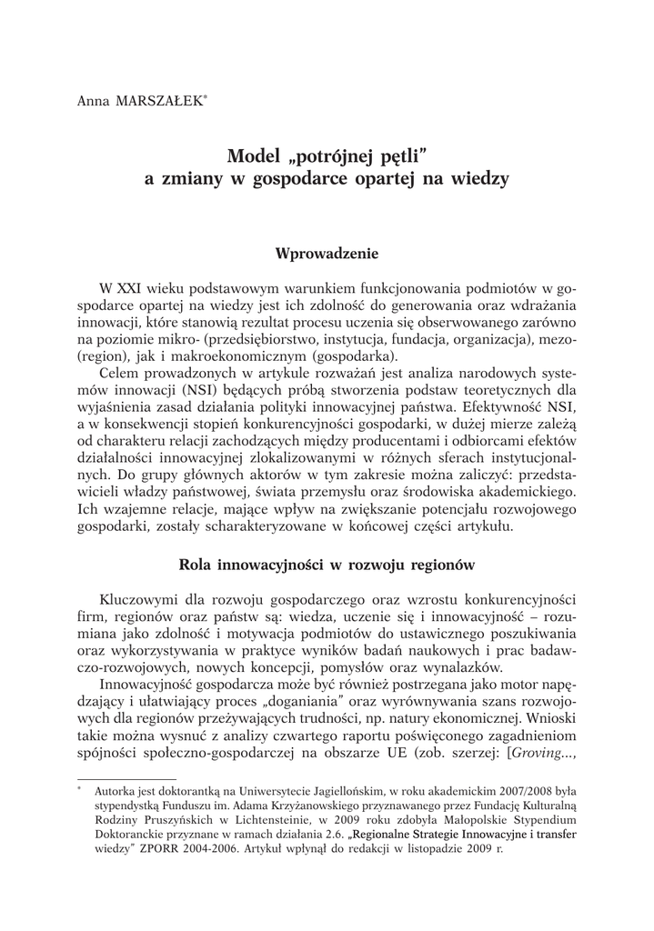 Anna MARSZAŁEK* Model „potrójnej pętli” a zmiany w gospodarce opartej na wiedzy Wprowadzenie W XXI wieku podstawowym warunkiem funkcjonowania podmiotów w gospodarce opartej na wiedzy jest ich zdolność do generowania oraz wdrażania innowacji, które stanowią rezultat procesu uczenia się obserwowanego zarówno na poziomie mikro- (przedsiębiorstwo, instytucja, fundacja, organizacja), mezo(region), jak i makroekonomicznym (gospodarka). Celem prowadzonych w artykule rozważań jest analiza narodowych systemów innowacji (NSI) będących próbą stworzenia podstaw teoretycznych dla wyjaśnienia zasad działania polityki innowacyjnej państwa. Efektywność NSI, a w konsekwencji stopień konkurencyjności gospodarki, w dużej mierze zależą od charakteru relacji zachodzących między producentami i odbiorcami efektów działalności innowacyjnej zlokalizowanymi w różnych sferach instytucjonalnych. Do grupy głównych aktorów w tym zakresie można zaliczyć: przedstawicieli władzy państwowej, świata przemysłu oraz środowiska akademickiego. Ich wzajemne relacje, mające wpływ na zwiększanie potencjału rozwojowego gospodarki, zostały scharakteryzowane w końcowej części artykułu. Rola innowacyjności w rozwoju regionów Kluczowymi dla rozwoju gospodarczego oraz wzrostu konkurencyjności firm, regionów oraz państw są: wiedza, uczenie się i innowacyjność – rozumiana jako zdolność i motywacja podmiotów do ustawicznego poszukiwania oraz wykorzystywania w praktyce wyników badań naukowych i prac badawczo-rozwojowych, nowych koncepcji, pomysłów oraz wynalazków. Innowacyjność gospodarcza może być również postrzegana jako motor napędzający i ułatwiający proces „doganiania” oraz wyrównywania szans rozwojowych dla regionów przeżywających trudności, np. natury ekonomicznej. Wnioski takie można wysnuć z analizy czwartego raportu poświęconego zagadnieniom spójności społeczno-gospodarczej na obszarze UE (zob. szerzej: [Groving..., * Autorka jest doktorantką na Uniwersytecie Jagiellońskim, w roku akademickim 2007/2008 była stypendystką Funduszu im. Adama Krzyżanowskiego przyznawanego przez Fundację Kulturalną Rodziny Pruszyńskich w Lichtensteinie, w 2009 roku zdobyła Małopolskie Stypendium Doktoranckie przyznane w ramach działania 2.6. „Regionalne ��������������������������������������������� Strategie Innowacyjne i transfer wiedzy” ZPORR 2004-2006. Artykuł wpłynął do redakcji w listopadzie 2009 r. 128 GOSPODARKA NARODOWA Nr 1-2/2010 2007]). Zarówno globalny wzrost gospodarczy, jak i spójność społeczna wymagają zwiększania konkurencyjności regionów, szczególnie tych, które posiadają niepowtarzalne zasoby (ludzkie, kapitałowe), czy charakteryzują się wysokim potencjałem rozwojowym. Obserwując przebieg procesów innowacyjnych można zauważyć następujące prawidłowości: • wdrażanie innowacji produktowych, prowadzenie czynności badawczych, czy powiązanej z nimi działalności patentowej są zlokalizowane głównie w dużych aglomeracjach (zob. szerzej: [Gehrke, Legler, 2001]), • rozprzestrzenianie się wiedzy zachodzi bardziej dynamicznie w obrębie klastrów przemysłowych (por. [Feldman, 1994]), • regiony peryferyjne oraz te, gdzie dominują stare przemysły są w porównaniu do aglomeracji, postrzegane jako mniej innowacyjne (zachodzą w nich głównie innowacje przyrostowe i procesowe). Politykę innowacyjną można zdefiniować jako: działalność władz publicznych i innych instytucji rynkowych (szkół wyższych, jednostek o charakterze naukowo-badawczym) polegającą na tworzeniu, za pomocą określonych metod i środków, warunków do wzrostu konkurencyjności zainteresowanych podmiotów poprzez powstanie i transfer innowacji, przy uwzględnieniu działań koordynacyjnych i regulacyjnych w sektorze nauki, edukacji oraz sfery badawczo-rozwojowej [Mamica, 2007, s. 22 i nast.]. Wśród kluczowych funkcji przez nią pełnionych można wyróżnić m.in.: • wytyczanie celów polityki naukowej, • formułowanie instytucjonalnego układu umożliwiającego tworzenie wiedzy i jej transfer do gospodarki, • zapewnienie warunków konkurencji będącej stymulatorem dla zachodzących procesów innowacyjnych, • stosowanie mechanizmów fiskalnych i monetarnych ułatwiających wdrażanie innowacji przez firmy, • stworzenie warunków przyjaznych dla rozwoju kapitału ludzkiego (np. działalność edukacyjna, szkoleniowa). Polityka innowacyjna, zgodnie z wytycznymi zawartymi w podręczniku metodycznym badań statystycznych innowacji Oslo Manual, jest kolejnym stadium rozwoju począwszy od polityki naukowej poprzez technologiczną, co obrazuje rysunek 1. Innowacja przyrostowa to drobne udoskonalenia istniejących już rozwiązań, które nie zmieniają zasadniczo ich natury. Ich przeciwieństwem są innowacje radykalne zastępujące dotychczas stosowane technologie bądź rozwiązania o charakterze organizacyjnym. Innowacja procesowa występuje przy wdrażaniu nowego sposobu bądź metody produkcji. Por. [Mamica, 2007, s. 17‑18]. Anna Marszałek, Model „potrójnej pętli” a zmiany w gospodarce opartej na wiedzy 129 Rysunek 1. Ewolucja polityki naukowej, technologicznej i innowacyjnej Ewolucja polityki Polityka naukowa Badania Edukacja naukowa Infrastruktura naukowa Wielka nauka Polityka technologiczna Przemysły strategiczne Współpraca w zakresie rozwoju badań i technologii Zamówienia Transfer technologii Standaryzacja Polityka innowacyjna System aplikacji Budowanie zdolności Prawa własności intelektualnej MŚP* Bioetyka Wartości społeczne Zmniejszanie różnic * MŚP – małe i średnie przedsiębiorstwa Źródło: [Borrás, 2003, s. 14] [w:] [Mamica, 2007, s. 25] Każdy z etapów ewolucji polityki opiera się na poprzednim, a sama polityka innowacyjna skupia w sobie zarówno cele, jak i instru