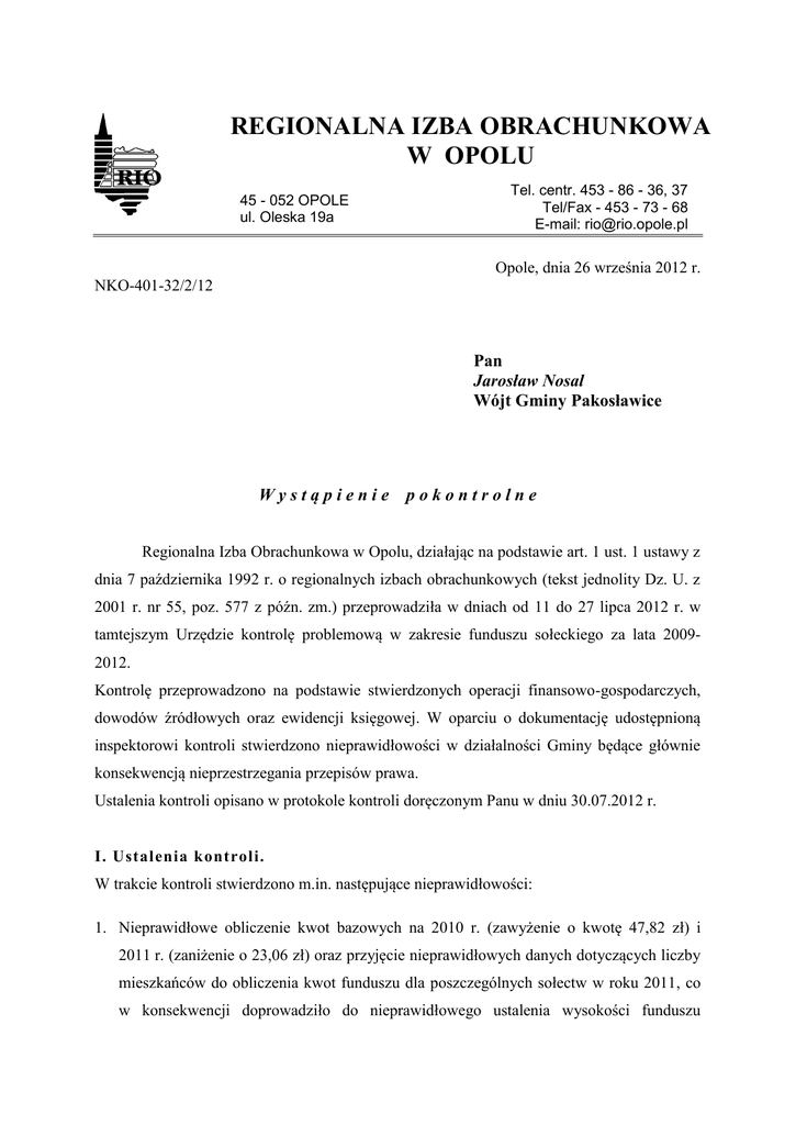 REGIONALNA IZBA OBRACHUNKOWA W OPOLU Tel. centr. 453 - 86 - 36, 37 Tel/Fax - 453 - 73 - 68 E-mail: [email protected] 45 - 052 OPOLE ul. Oleska 19a Opole, dnia 26 września 2012 r. NKO-401-32/2/12 Pan Jarosław Nosal Wójt Gminy Pakosławice Wystąpienie pokontrolne Regionalna Izba Obrachunkowa w Opolu, działając na podstawie art. 1 ust. 1 ustawy z dnia 7 października 1992 r. o regionalnych izbach obrachunkowych (tekst jednolity Dz. U. z 2001 r. nr 55, poz. 577 z późn. zm.) przeprowadziła w dniach od 11 do 27 lipca 2012 r. w tamtejszym Urzędzie kontrolę problemową w zakresie funduszu sołeckiego za lata 20092012. Kontrolę przeprowadzono na podstawie stwierdzonych operacji finansowo-gospodarczych, dowodów źródłowych oraz ewidencji księgowej. W oparciu o dokumentację udostępnioną inspektorowi kontroli stwierdzono nieprawidłowości w działalności Gminy będące głównie konsekwencją nieprzestrzegania przepisów prawa. Ustalenia kontroli opisano w protokole kontroli doręczonym Panu w dniu 30.07.2012 r. I. Ustalenia kontroli. W trakcie kontroli stwierdzono m.in. następujące nieprawidłowości: 1. Nieprawidłowe obliczenie kwot bazowych na 2010 r. (zawyżenie o kwotę 47,82 zł) i 2011 r. (zaniżenie o 23,06 zł) oraz przyjęcie nieprawidłowych danych dotyczących liczby mieszkańców do obliczenia kwot funduszu dla poszczególnych sołectw w roku 2011, co w konsekwencji doprowadziło do nieprawidłowego ustalenia wysokości funduszu sołeckiego na te lata. Fundusz sołecki na 2010 r. zawyżono o kwotę 5.407,95 zł, zaś na 2011 zaniżono o kwotę 1.267,56 zł (protokół kontroli str. 6-11). Odpowiedzialność ponosi były Skarbnik oraz Wójt Gminy. 2. Zrealizowanie ze środków funduszu sołeckiego wydatku niemieszczącego się we wniosku sołectwa czego skutkiem było wykazanie we wniosku skierowanym do Wojewody Opolskiego o zwrot z budżetu państwa części wydatków Gminy wykonanych w ramach funduszu sołeckiego za 2010 r. kwoty zwrotu zawyżonej o 30,00 zł (protokół kontroli str. 20-21, 25). Odpowiedzialność ponosi były Skarbnik oraz Wójt Gminy. II. Wnioski pokontrolne. W celu usunięcia stwierdzonych nieprawidłowości oraz usprawnienia prowadzenia zagadnień objętych kontrolą, Regionalna Izba Obrachunkowa w Opolu działając na podstawie art. 9 ust. 2 powołanej na wstępie ustawy o regionalnych izbach obrachunkowych, wnosi o pełne wykorzystanie ustaleń zawartych w protokole kontroli oraz o podjęcie skutecznych działań w celu wyeliminowania powstałych nieprawidłowości, a w szczególności o realizację następujących wniosków: 1. Zapewnić prawidłowe ustalanie kwot funduszu sołeckiego dla poszczególnych sołectw z zastosowaniem zasad określonych w przepisie art. 2 ust.1 ustawy z dnia 20 lutego 2009 r. o funduszu sołeckim (Dz. U. nr 52, poz. 420 z późn. zm.). 2. Zapewnić przeznaczanie środków funduszu sołeckiego na realizację przedsięwzięć określonych w przepisie art. 1 ust. 3 ustawy z dnia 20 lutego 2009 r. o funduszu sołeckim (Dz. U. nr 52 poz. 420 z późn. zm.). Dokonać korekty wniosku o zwrot z budżetu państwa części wydatków Gminy wykonanych w ramach funduszu sołeckiego za 2010 r. oraz przekazać skorygowany wniosek do Wojewody Opolskiego. Stosownie do postanowień art. 9 ust. 3 cyt. ustawy o regionalnych izbach obrachunkowych, oczekuję w terminie 30 dni od daty otrzymania niniejszego wystąpienia pokontrolnego pisemnej informacji o wykonaniu wniosków pokontrolnych w nim zawartych lub przyczynach ich niewykonania. Poinformowanie Izby niezgodnie z prawdą o wykonaniu wniosków pokontrolnych w myśl art. 27 ww. ustawy zagrożone jest karą grzywny. 2 Zgodnie z art. 9 ust. 3 i 4 ustawy o regionalnych izbach obrachunkowych do wniosków zawartych w wystąpieniu pokontrolnym przysługuje prawo wniesienia zastrzeżeń do Kolegium Izby w terminie 14 dni od daty otrzymania wystąpienia pokontrolnego. Podstawą zgłoszenia zastrzeżeń może być tylko zarzut naruszenia prawa przez błędną jego wykładnię lub niewłaściwe zastosowanie. Do wiadomości: Rada Gminy Zastępca Prezesa Jan Uksik /--/ 3