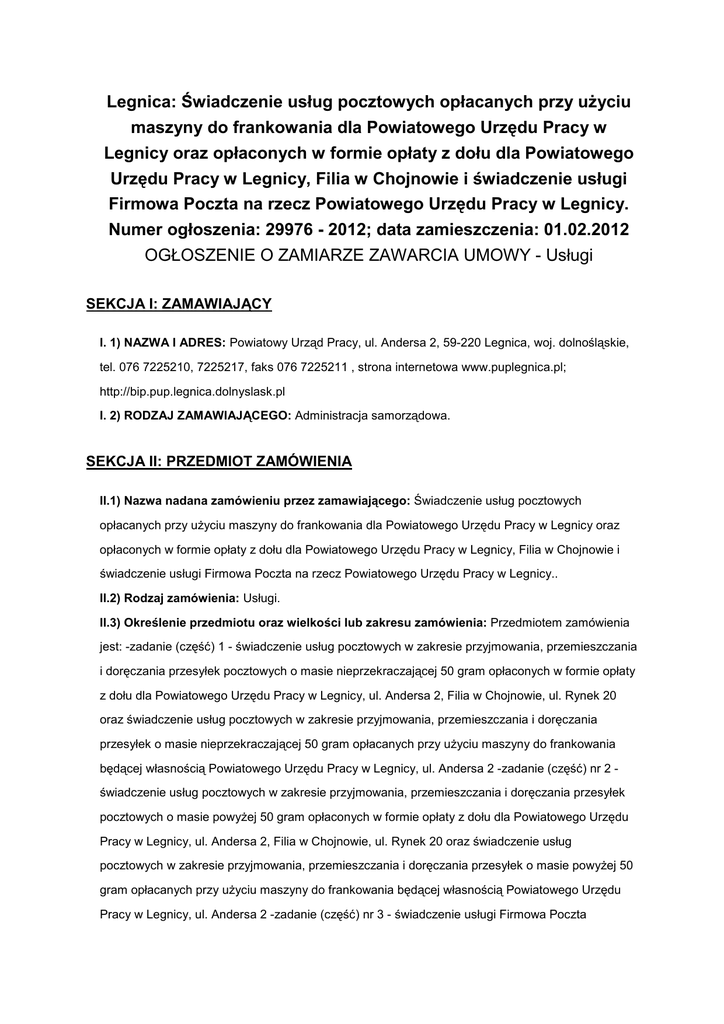 Legnica: Świadczenie usług pocztowych opłacanych przy użyciu maszyny do frankowania dla Powiatowego Urzędu Pracy w Legnicy oraz opłaconych w formie opłaty z dołu dla Powiatowego Urzędu Pracy w Legnicy, Filia w Chojnowie i świadczenie usługi Firmowa Poczta na rzecz Powiatowego Urzędu Pracy w Legnicy. Numer ogłoszenia: 29976 - 2012; data zamieszczenia: 01.02.2012 OGŁOSZENIE O ZAMIARZE ZAWARCIA UMOWY - Usługi SEKCJA I: ZAMAWIAJĄCY I. 1) NAZWA I ADRES: Powiatowy Urząd Pracy, ul. Andersa 2, 59-220 Legnica, woj. dolnośląskie, tel. 076 7225210, 7225217, faks 076 7225211 , strona internetowa www.puplegnica.pl; http://bip.pup.legnica.dolnyslask.pl I. 2) RODZAJ ZAMAWIAJĄCEGO: Administracja samorządowa. SEKCJA II: PRZEDMIOT ZAMÓWIENIA II.1) Nazwa nadana zamówieniu przez zamawiającego: Świadczenie usług pocztowych opłacanych przy użyciu maszyny do frankowania dla Powiatowego Urzędu Pracy w Legnicy oraz opłaconych w formie opłaty z dołu dla Powiatowego Urzędu Pracy w Legnicy, Filia w Chojnowie i świadczenie usługi Firmowa Poczta na rzecz Powiatowego Urzędu Pracy w Legnicy.. II.2) Rodzaj zamówienia: Usługi. II.3) Określenie przedmiotu oraz wielkości lub zakresu zamówienia: Przedmiotem zamówienia jest: -zadanie (część) 1 - świadczenie usług pocztowych w zakresie przyjmowania, przemieszczania i doręczania przesyłek pocztowych o masie nieprzekraczającej 50 gram opłaconych w formie opłaty z dołu dla Powiatowego Urzędu Pracy w Legnicy, ul. Andersa 2, Filia w Chojnowie, ul. Rynek 20 oraz świadczenie usług pocztowych w zakresie przyjmowania, przemieszczania i doręczania przesyłek o masie nieprzekraczającej 50 gram opłacanych przy użyciu maszyny do frankowania będącej własnością Powiatowego Urzędu Pracy w Legnicy, ul. Andersa 2 -zadanie (część) nr 2 świadczenie usług pocztowych w zakresie przyjmowania, przemieszczania i doręczania przesyłek pocztowych o masie powyżej 50 gram opłaconych w formie opłaty z dołu dla Powiatowego Urzędu Pracy w Legnicy, ul. Andersa 2, Filia w Chojnowie, ul. Rynek 20 oraz świadczenie usług pocztowych w zakresie przyjmowania, przemieszczania i doręczania przesyłek o masie powyżej 50 gram opłacanych przy użyciu maszyny do frankowania będącej własnością Powiatowego Urzędu Pracy w Legnicy, ul. Andersa 2 -zadanie (część) nr 3 - świadczenie usługi Firmowa Poczta polegającej na odbiorze uporządkowanych przesyłek z miejsca wskazanego przez Powiatowy Urząd Pracy w Legnicy, ul. Andersa 2 (siedziby), a następnie nadaniu tych przesyłek w wyznaczonej placówce pocztowej.. II.4) Wspólny Słownik Zamówień (CPV): 64.11.00.00-0. II.5) Szacunkowa wartość zamówienia (bez VAT): jest mniejsza niż kwoty określone w przepisach wydanych na podstawie art. 11 ust. 8 ustawy. SEKCJA III: PROCEDURA Tryb udzielenia zamówienia: Zamówienie z wolnej ręki • 1. Podstawa prawna Postępowanie wszczęte zostało na podstawie art. 67 ust. 1 pkt 1 lit. a ustawy z dnia 29 stycznia 2004 r. – Prawo zamówień publicznych. • 2. Uzasadnienie wyboru trybu Zgodnie z art. 67 ust. 1 pkt 1 lit. a ustawy z dnia 29.01.2004 r. Prawo zamówień publicznych (Dz. U. z 2010 r.Nr 113, poz. 759 z późń. zm.) zamawiający może udzielić zamówienia z wolnej ręki, jeżeli usługi mogą być świadczone tylko przez jednego wykonawcę z przyczyn technicznych o obiektywnym charakterze. Art. 5. ust. 1a pkt. 1 ustawy Pzp stanowi, iż do postępowań o udzielenie zamówień, których przedmiotem są usługi o charakterze niepriorytetowym określone w przepisach wydanych na podstawie art. 2a, nie stosuje się przepisów ustawy dotyczących terminów składania wniosków o dopuszczenie do udziału w postępowaniu lub terminów składania ofert, obowiązku żądania wadium, obowiązku żądania dokumentów potwierdzających spełnianie warunków udziału w postępowaniu, zakazu ustalania kryteriów oceny ofert na podstawie właściwości wykonawcy oraz przesłanek wyboru trybu negocjacji z ogłoszeniem, dialogu konkurencyjnego oraz licytacji elektronicznej. Usługi pocztowe będące przedmiotem niniejszego zamówienia zostały wymienione w załączniku II B do dyrektywy 2004/18/WE Parlamentu Europejskiego i Rady z dnia 31 marca 2004r. i zgodnie z załącznikiem nr 2 do rozporządzenia Prezesa Rady ministrów z dnia 28 stycznia 2010r. w sprawie wykazu usług o charakterze priorytetowym i niepriorytetowym ( Dz. U. z 2010 Nr 12, poz. 68) należą do grupy usług niepriorytetowych (nr kategorii 27, nr CPV 64110000-0 Usługi pocztowe). Art. 5 ust. 1a ustawy Pzp brzmi: w przypadku zamówień, o których mowa w ust. 1, zamawiający może wszcząć postępowanie w trybie negocjacji bez ogłoszenia lub w trybie zamówienia z wolnej ręki także w innych uzasadnionych przypadkach niż określone odpowiednio w art. 62 ust. 1 lub art. 67 ust. 1 w szczególności, jeżeli zastosowanie innego trybu mogłoby skutkować, co najmniej jedną z następujących okoliczności: 1) naruszeniem zasad celowego, oszczędnego i efektywnego dokonywania wydatków; 2) naruszeniem zasad dokonywania wydatków w wysokości i w terminach wynikających z wcześniej zaciągniętych zobowiązań; 3) poniesieniem straty w mieniu publicznym; 4) uniemożliwieniem terminowej realizacji zadań. Zastrzeżone usługi pocztowe świadczone są w ramach wyłączności ustanowionej w art. 47 ustawy z dnia 12 czerwca 2003 r. - Prawo Pocztowe (t.j. Dz. U. z 2008, Nr 189, poz. 1159 z późn. zm.) na rzecz Poczty Polskiej S.A. Zgodnie z brzmieniem art. 47 ust. 1 powołanej ustawy, operatorowi publicznemu przysługuje wyłączność na świadczenie usług pocztowych, zwanych usługami zastrzeżonymi. Górna granica wagowa usług zastrzeżonych wynosi 50 g. Inni wykonawcy świadczący usługi pocztowe, nie są uprawnieni do świadczenia zastrzeżonych usług pocztowych, chyba, że za opłatą nie niższą niż dwu i pół krotność opłaty za przyjęcie, przemieszczenie i doręczen