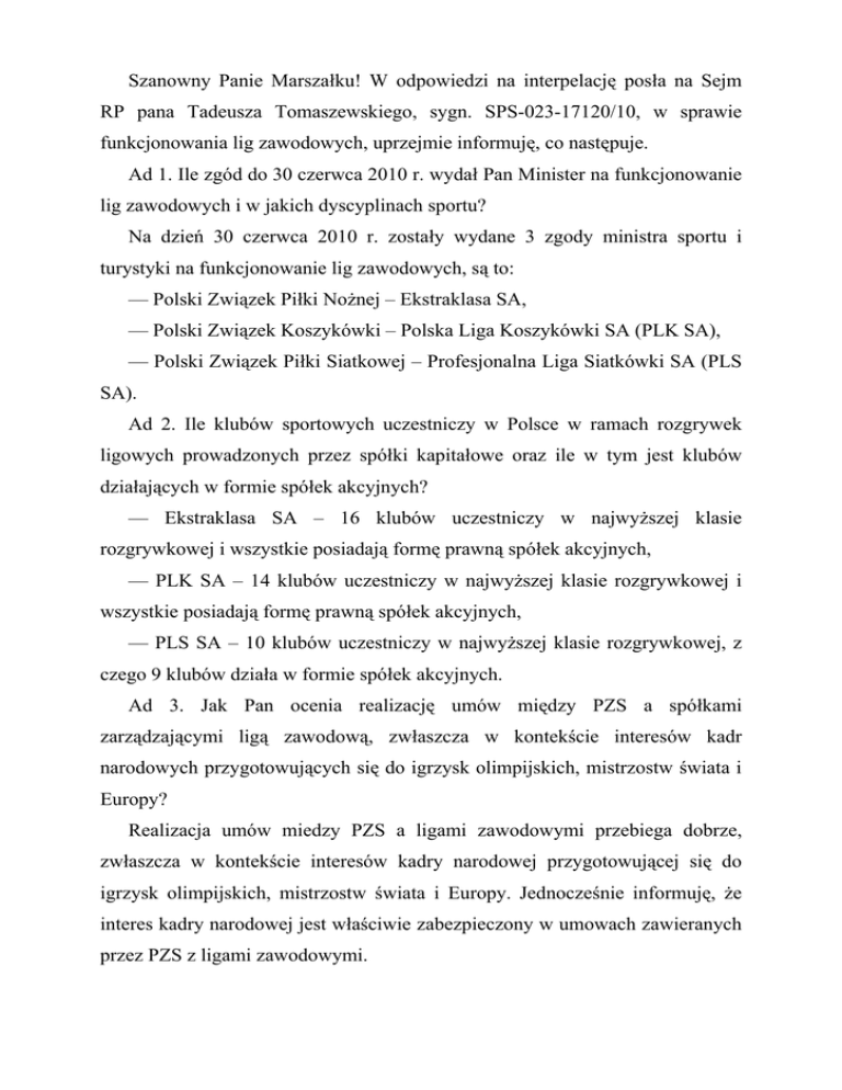Szanowny Panie Marszałku! W odpowiedzi na interpelację posła na Sejm RP pana Tadeusza Tomaszewskiego, sygn. SPS-023-17120/10, w sprawie funkcjonowania lig zawodowych, uprzejmie informuję, co następuje. Ad 1. Ile zgód do 30 czerwca 2010 r. wydał Pan Minister na funkcjonowanie lig zawodowych i w jakich dyscyplinach sportu? Na dzień 30 czerwca 2010 r. zostały wydane 3 zgody ministra sportu i turystyki na funkcjonowanie lig zawodowych, są to: — Polski Związek Piłki Nożnej – Ekstraklasa SA, — Polski Związek Koszykówki – Polska Liga Koszykówki SA (PLK SA), — Polski Związek Piłki Siatkowej – Profesjonalna Liga Siatkówki SA (PLS SA). Ad 2. Ile klubów sportowych uczestniczy w Polsce w ramach rozgrywek ligowych prowadzonych przez spółki kapitałowe oraz ile w tym jest klubów działających w formie spółek akcyjnych? — Ekstraklasa SA – 16 klubów uczestniczy w najwyższej klasie rozgrywkowej i wszystkie posiadają formę prawną spółek akcyjnych, — PLK SA – 14 klubów uczestniczy w najwyższej klasie rozgrywkowej i wszystkie posiadają formę prawną spółek akcyjnych, — PLS SA – 10 klubów uczestniczy w najwyższej klasie rozgrywkowej, z czego 9 klubów działa w formie spółek akcyjnych. Ad 3. Jak Pan ocenia realizację umów między PZS a spółkami zarządzającymi ligą zawodową, zwłaszcza w kontekście interesów kadr narodowych przygotowujących się do igrzysk olimpijskich, mistrzostw świata i Europy? Realizacja umów miedzy PZS a ligami zawodowymi przebiega dobrze, zwłaszcza w kontekście interesów kadry narodowej przygotowującej się do igrzysk olimpijskich, mistrzostw świata i Europy. Jednocześnie informuję, że interes kadry narodowej jest właściwie zabezpieczony w umowach zawieranych przez PZS z ligami zawodowymi. Ad 4. Jaki był udział PZS w przychodach związanych z zarządzaniem ligą zawodową za lata 2006–2009? Proszę o podanie wszystkich danych finansowych dostępnych za ww. lata. — PZPN – rok obrachunkowy spółki Ekstraklasa SA jest zbieżny z rozgrywkami ligowymi, tzn. zaczyna się 1 lipca, a kończy 30 czerwca, w ostatnim roku obrachunkowym, tj. 1.07.2009– 30.06.2010 spółka przekazała do PZPN łączną kwotę 6 788 420 zł brutto, — PZKosz – w latach 2006–2009 uzyskał z tytułu przekazania praw do prowadzenia ligi zawodowej kwotę 1 817 898,79 zł, — PLS – przekazał z tytułu sprzedaży praw marketingowych i telewizyjnych kwotę ok. 172 tys. zł za rok 2009 do budżetu PZPS. Ad 5. Jakie PZS zamierzają w najbliższych latach utworzyć ligi zawodowe? Z aktualnych informacji, jakie posiada MSiT, wynika, że Polski Związek Hokeja na Trawie jako jedyny informuje o możliwości powstania ligi zawodowej w hokeju na trawie mężczyzn od sezonu 2015/2016. Ad 6. Czy w latach 2006–2009 nie występowały konflikty interesów związane z posiadaniem przez osoby fizyczne lub prawne udziałów lub akcji w innym klubie sportowym uczestniczącym we współzawodnictwie sportowym w tym samym sporcie? W dotychczasowej współpracy nie występowały konflikty interesów. Tego typu sytuacjom zapobiegają zapisy w statutach PZS. Z poważaniem 2
