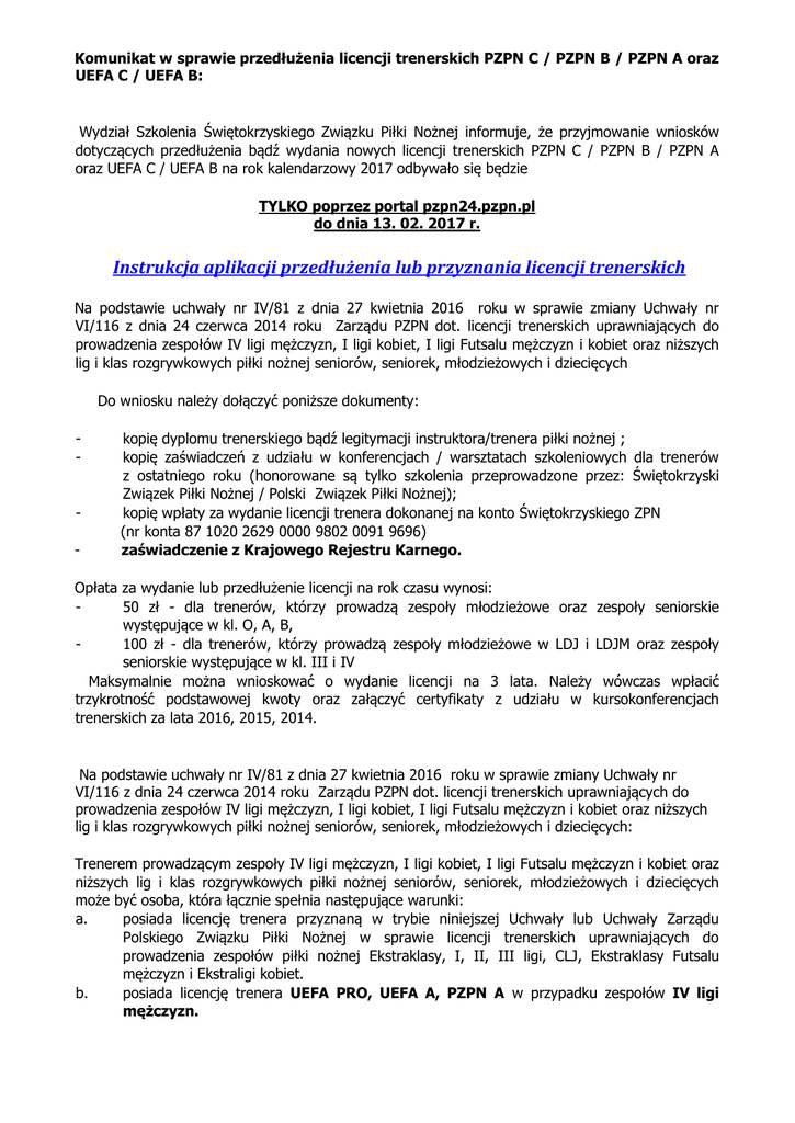 Komunikat w sprawie przedłużenia licencji trenerskich PZPN C / PZPN B / PZPN A oraz UEFA C / UEFA B: Wydział Szkolenia Świętokrzyskiego Związku Piłki Nożnej informuje, że przyjmowanie wniosków dotyczących przedłużenia bądź wydania nowych licencji trenerskich PZPN C / PZPN B / PZPN A oraz UEFA C / UEFA B na rok kalendarzowy 2017 odbywało się będzie TYLKO poprzez portal pzpn24.pzpn.pl do dnia 13. 02. 2017 r. Instrukcja aplikacji przedłużenia lub przyznania licencji trenerskich Na podstawie uchwały nr IV/81 z dnia 27 kwietnia 2016 roku w sprawie zmiany Uchwały nr VI/116 z dnia 24 czerwca 2014 roku Zarządu PZPN dot. licencji trenerskich uprawniających do prowadzenia zespołów IV ligi mężczyzn, I ligi kobiet, I ligi Futsalu mężczyzn i kobiet oraz niższych lig i klas rozgrywkowych piłki nożnej seniorów, seniorek, młodzieżowych i dziecięcych Do wniosku należy dołączyć poniższe dokumenty: - - kopię dyplomu trenerskiego bądź legitymacji instruktora/trenera piłki nożnej ; kopię zaświadczeń z udziału w konferencjach / warsztatach szkoleniowych dla trenerów z ostatniego roku (honorowane są tylko szkolenia przeprowadzone przez: Świętokrzyski Związek Piłki Nożnej / Polski Związek Piłki Nożnej); kopię wpłaty za wydanie licencji trenera dokonanej na konto Świętokrzyskiego ZPN (nr konta 87 1020 2629 0000 9802 0091 9696) zaświadczenie z Krajowego Rejestru Karnego. Opłata za wydanie lub przedłużenie licencji na rok czasu wynosi: 50 zł - dla trenerów, którzy prowadzą zespoły młodzieżowe oraz zespoły seniorskie występujące w kl. O, A, B, 100 zł - dla trenerów, którzy prowadzą zespoły młodzieżowe w LDJ i LDJM oraz zespoły seniorskie występujące w kl. III i IV Maksymalnie można wnioskować o wydanie licencji na 3 lata. Należy wówczas wpłacić trzykrotność podstawowej kwoty oraz załączyć certyfikaty z udziału w kursokonferencjach trenerskich za lata 2016, 2015, 2014. Na podstawie uchwały nr IV/81 z dnia 27 kwietnia 2016 roku w sprawie zmiany Uchwały nr VI/116 z dnia 24 czerwca 2014 roku Zarządu PZPN dot. licencji trenerskich uprawniających do prowadzenia zespołów IV ligi mężczyzn, I ligi kobiet, I ligi Futsalu mężczyzn i kobiet oraz niższych lig i klas rozgrywkowych piłki nożnej seniorów, seniorek, młodzieżowych i dziecięcych: Trenerem prowadzącym zespoły IV ligi mężczyzn, I ligi kobiet, I ligi Futsalu mężczyzn i kobiet oraz niższych lig i klas rozgrywkowych piłki nożnej seniorów, seniorek, młodzieżowych i dziecięcych może być osoba, która łącznie spełnia następujące warunki: a. posiada licencję trenera przyznaną w trybie niniejszej Uchwały lub Uchwały Zarządu Polskiego Związku Piłki Nożnej w sprawie licencji trenerskich uprawniających do prowadzenia zespołów piłki nożnej Ekstraklasy, I, II, III ligi, CLJ, Ekstraklasy Futsalu mężczyzn i Ekstraligi kobiet. b. posiada licencję trenera UEFA PRO, UEFA A, PZPN A w przypadku zespołów IV ligi mężczyzn. c. posiada licencję trenera UEFA PRO, UEFA A, UEFA B, PZPN A w przypadku zespołów Klasy Okręgowej, II ligi Futsalu mężczyzn i kobiet, II ligi kobiet, Ligi Wojewódzkiej Juniorów Starszych i Młodszych, oraz niższych klas rozgrywkowych piłki nożnej męskiej, kobiecej, młodzieżowej i dziecięcej. wyjątkowo trenerzy posiadający licencję PZPN B w przypadku nieprzerwanego prowadzenia zespołu Klasy Okręgowej w sezonie 2015/2016 mogą ubiegać się o przyznanie warunkowej licencji UEFA B na okres 1 roku, uprawniającej wyłącznie do prowadzenia danego zespołu. posiada licencję trenera UEFA C / PZPN C w przypadku zespołów piłki nożnej dziecięcej do 12 lat i zespołów seniorów klasy A, B i C. posiada pełną zdolność do czynności prawnych. korzysta z pełni praw publicznych. nie może być skazana prawomocnym wyrokiem za umyślne przestępstwo, o którym mowa w art. 46-50, lub określone w rozdziale XIX,XXIII, z wyjątkiem art. 192i art.193, rozdziale XXV i XXVI ustawy z dnia 6 czerwca 1997 roku – Kodeks karny (Dz.U. Nr 88, poz. 553, z późn.zmian.), chyba że nastąpiło zatarcie skazania. nie może to być osoba wobec której został prawomocnie orzeczony środek karny w postaci zakazu działalności w piłce nożnej (wykonywania określonej działalności), chyba że nastąpiło zatarcie skazania lub która karze bezwzględnej dyskwalifikacji orzeczonej przez organy dyscyplinarne PZPN za przewinienie korupcji w sporcie. nie może to być osoba, wobec której toczy się postępowanie dyscyplinarne za przewinienia określone w art. 79 Regulaminu Dyscyplinarnego PZPN. d. e. f. g. h. i. j. Wnioski składane po tym terminie będą rozpatrywane w trybie nadzwyczajnym, co będzie skutkowało poniesieniem wyższej opłaty! Opłata dodatkowa za wydanie lub przedłużenie licencji w trybie nadzwyczajnym wynosi (zgodnie z uchwałą nr IV/81 z dnia 27 kwietnia 2016 roku Zarządu Polskiego Związku Piłki Nożnej): * * * * za za za za licencję licencję licencję licencję PZPN A - 300 PLN UEFA B - 150 PLN PZPN B - 150 PLN UEFA C - 150 PLN Prowadzenie zespołu piłki nożnej podczas rozgrywek mistrzowskich i pucharowych przez trenera nie posiadającego ważnej licencji trenerskiej PZPN powoduje zastosowanie następujących kar dyscyplinarnych w stosunku do: 1.1 Klubu IV ligi: a) pierwszy mecz – kara pieniężna 1.200 złotych b) drugi mecz – kara pieniężna 1.800 złotych c) trzeci i kolejne mecze – weryfikacja zawodów jako walkower (3:0) dla zespołu przeciwnego. 1.2 Klubu Klasy Okręgowej, I i II Ligi Kobiet, I i II Ligi Futsalu, Św. Ligi Juniorów Starszych i Młodszych oraz niższych klas rozgrywkowych piłki nożnej męskiej, kobiecej, młodzieżowej (Klasy Okręgowe Juniorów St. i Mł): a) pierwszy mecz – kara pieniężna 700 złotych b) drugi mecz – kara pieniężna 1.200 złotych c) trzeci i kolejne mecze – weryfikacja zawodów jako walkower (3:0) dla zespołu przeciwnego. 1.3 K