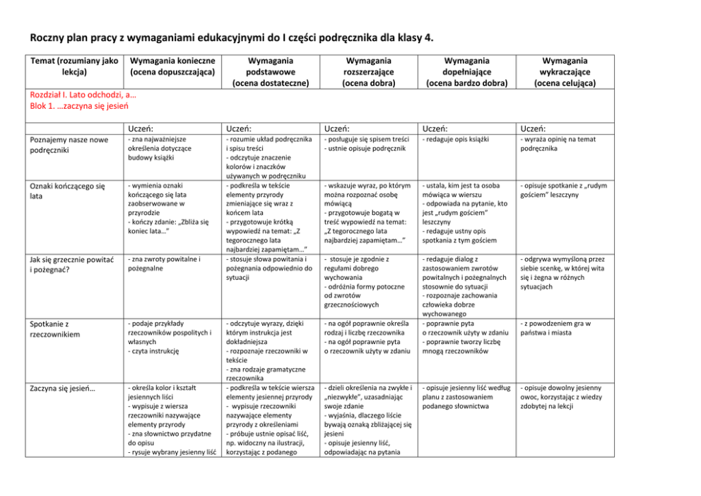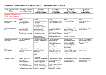 Roczny plan pracy z wymaganiami edukacyjnymi do I części podręcznika dla klasy 4. Temat (rozumiany jako lekcja) Wymagania konieczne (ocena dopuszczająca) Wymagania podstawowe (ocena dostateczne) Wymagania rozszerzające (ocena dobra) Wymagania dopełniające (ocena bardzo dobra) Wymagania wykraczające (ocena celująca) Rozdział I. Lato odchodzi, a… Blok 1. …zaczyna się jesień Uczeń: Uczeń: Uczeń: Uczeń: Uczeń: Poznajemy nasze nowe podręczniki - zna najważniejsze określenia dotyczące budowy książki - posługuje się spisem treści - ustnie opisuje podręcznik - redaguje opis książki - wyraża opinię na temat podręcznika Oznaki kończącego się lata - wymienia oznaki kończącego się lata zaobserwowane w przyrodzie - kończy zdanie: „Zbliża się koniec lata…” - wskazuje wyraz, po którym można rozpoznać osobę mówiącą - przygotowuje bogatą w treść wypowiedź na temat: „Z tegorocznego lata najbardziej zapamiętam…” - ustala, kim jest ta osoba mówiąca w wierszu - odpowiada na pytanie, kto jest „rudym gościem” leszczyny - redaguje ustny opis spotkania z tym gościem - opisuje spotkanie z „rudym gościem” leszczyny Jak się grzecznie powitać i pożegnać? - zna zwroty powitalne i pożegnalne - rozumie układ podręcznika i spisu treści - odczytuje znaczenie kolorów i znaczków używanych w podręczniku - podkreśla w tekście elementy przyrody zmieniające się wraz z końcem lata - przygotowuje krótką wypowiedź na temat: „Z tegorocznego lata najbardziej zapamiętam…” - stosuje słowa powitania i pożegnania odpowiednio do sytuacji - stosuje je zgodnie z regułami dobrego wychowania - odróżnia formy potoczne od zwrotów grzecznościowych - odgrywa wymyśloną przez siebie scenkę, w której wita się i żegna w różnych sytuacjach Spotkanie z rzeczownikiem - podaje przykłady rzeczowników pospolitych i własnych - czyta instrukcję - na ogół poprawnie określa rodzaj i liczbę rzeczownika - na ogół poprawnie pyta o rzeczownik użyty w zdaniu Zaczyna się jesień… - określa kolor i kształt jesiennych liści - wypisuje z wiersza rzeczowniki nazywające elementy przyrody - zna słownictwo przydatne do opisu - rysuje wybrany jesienny liść - odczytuje wyrazy, dzięki którym instrukcja jest dokładniejsza - rozpoznaje rzeczowniki w tekście - zna rodzaje gramatyczne rzeczownika - podkreśla w tekście wiersza elementy jesiennej przyrody - wypisuje rzeczowniki nazywające elementy przyrody z określeniami - próbuje ustnie opisać liść, np. widoczny na ilustracji, korzystając z podanego - redaguje dialog z zastosowaniem zwrotów powitalnych i pożegnalnych stosownie do sytuacji - rozpoznaje zachowania człowieka dobrze wychowanego - poprawnie pyta o rzeczownik użyty w zdaniu - poprawnie tworzy liczbę mnogą rzeczowników - opisuje jesienny liść według planu z zastosowaniem podanego słownictwa - opisuje dowolny jesienny owoc, korzystając z wiedzy zdobytej na lekcji - dzieli określenia na zwykłe i „niezwykłe”, uzasadniając swoje zdanie - wyjaśnia, dlaczego liście bywają oznaką zbliżającej się jesieni - opisuje jesienny liść, odpowiadając na pytania - z powodzeniem gra w państwa i miasta Co wypada wiedzieć o alfabecie? Ortografia bez kłopotów – pisownia wyrazów z „ó” - układa proste zdania na jego temat - zna na pamięć alfabet - zna zastosowanie alfabetu w życiu wzoru - układa proste wyrazy według alfabetu - układa w kolejności alfabetycznej wyrazy zaczynające się na tę samą literę - odwzorowuje poznawane wyrazy - zna podstawowe reguły - ćwiczy pisownię poznanych wyrazów - tworzy wyrazy według wzoru - ustala reguły pisowni - podejmuje próby korzystania ze słownika ortograficznego - układa w kolejności alfabetycznej wyrazy zaczynające się od kilku tych samych liter - podejmuje próby zastosowania znajomości alfabetu do korzystania ze słownika - uzasadnia pisownię poznanych wyrazów - korzysta ze słownika ortograficznego - stosuje znajomość alfabetu do korzystania ze słownika - tworzy jedną stronę komiksu - wyjaśnia znaczenie powiedzenia: zachowywać się jak dziecko - podaje wzory zachowań dorosłych dawane dzieciom - ma świadomość, że wyzywanie innych źle świadczy o jego wychowaniu - tworzy komiks - stosuje powiedzenie: zachowywać się jak dziecko - sprawnie pisze wyrazy z „ó” - w miarę potrzeb korzysta ze słownika ortograficznego Rozdział I. Lato odchodzi, a jesienią Blok 2. Ujawniają się pechowcy i szczęściarze Jak zostać autorem komiksu? - zna pojęcie: komiks - wymienia znane sobie komiksy - dostrzega zachowania dzieci i dorosłych w tekście - ustala cechy komiksu - odpowiada na pytania do tekstu dotyczące zachowań i ich przyczyn - przedstawia swój ulubiony komiks - porównuje zachowania dzieci i dorosłych w galijskiej wiosce - dostrzega dowcip pomysłu Mój język świadczy o mnie - w poznanym komiksie wskazuje niezbyt grzeczne słowa - używa słów: proszę, dziękuję, przepraszam - czyta głośno tekst opowiadania (pierwszy akapit i dialog – przygotowane w domu) - wymienia bohaterów - wie, co to jest plan wydarzeń - słowa „niegrzeczne” stara się zastąpić ładniejszymi - nie wyzywa rówieśników - właściwie zwraca się do rówieśników i dorosłych - czyta głośno, wyraziście - wymienia najważniejsze wydarzenia - czyta głośno, dbając o właściwą modulację głosu - potrafi przyporządkować zdarzenia do cech charakteru Emila - układa plan wydarzeń - wymyśla nową przygodę bohatera i ją zapisuje - opowiada o wydarzeniach w pierwszej osobie - wymyśla plan wydarzeń pod tytułem „Niezwykły poranek” i według niego pisze opowiadanie - wyjaśnia dosłowne znaczenie związków wyrazowych - słucha czytanego tekstu - zna niektóre związki frazeologiczne - czyta fragment powieści - wymienia bohaterów - rysuje ulubioną postać - próbuje wyjaśnić ukryte znaczenie wybranych zwi