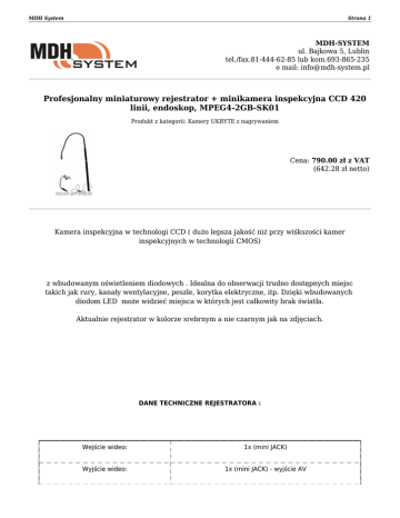 MDH System Strona 1 MDH-SYSTEM ul. Bajkowa 5, Lublin tel./fax.81-444-62-85 lub kom.693-865-235 e mail: [email protected] Profesjonalny miniaturowy rejestrator + minikamera inspekcyjna CCD 420 linii, endoskop, MPEG4-2GB-SK01 Produkt z kategorii: Kamery UKRYTE z nagrywaniem Cena: 790.00 zł z VAT (642.28 zł netto) Kamera inspekcyjna w technologi CCD ( dużo lepsza jakość niż przy wiśkszości kamer inspekcyjnych w technologii CMOS) z wbudowanym oświetleniem diodowych . Idealna do obserwacji trudno dostępnych miejsc takich jak rury, kanały wentylacyjne, peszle, korytka elektryczne, itp. Dzięki wbudowanych diodom LED może widzieć miejsca w których jest całkowity brak światła. Aktualnie rejestrator w kolorze srebrnym a nie czarnym jak na zdjęciach. DANE TECHNICZNE REJESTRATORA : Wejście wideo: 1x (mini JACK) Wyjście wideo: 1x (mini JACK) - wyjście AV MDH System Strona 2 Audio: Wejście audio Wbudowany mikrofon Wyjścia audio: 1x (mini JACK) - wyjście AV Metoda kompresji zapisu: MPEG-4 Format zapisanego pliku AV: 3GP Rozdzielczości zapisanego obrazu: 320 x 240 Prędkość zapisu: 25 kl/s Przekątna ekranu LCD: 2.4" Archiwizacja na zewnętrznych nośnikach: Karta pamięci typu micro SD (nie zawarta w zestawie) Pojemność pamięci: • wewnętrzna: 2 GB • zewnętrzna: obsługa kart micro SD do 8 GB (testowano na SanDisk) Wyszukiwanie i odtwarzanie nagrań: Lista nagrań z data Interface: USB 2.0 pozwala odczytywać pliki zapisane w urządzeniu i na karcie micro SD (widoczny przez PC jako Pendrive) Zapis pamięci / czas nagrywania: ok. 121 MB/h ok. 16.5 h nagrywania na pamięci wewnętrznej Zasilanie: 5V (zasilacz USB w komplecie) lub z wewnętrznej baterii Li-Ion Wymiary: 84 x 51 x 14 mm Waga: 68 g Opis kamery: Kamera, dzięki elastycznemu wysięgnikowi i wbudowanemu oświetleniu, umożliwia podgląd trudno dostępnych miejsc. MDH System Strona 3 Parametry: Typ produktu: Mini Kamera Sensor optyczny: 1/8"CDC MK Minimalna jasność: Rozdzielczość: 0 Lux (wbudowane diody ) 420 Zasilanie: 3 - 5V Soczewka: Super Mini 3,7mm Pinhole Lens Balans bieli: Gamma: Automatyczny 0,45 Odstęp sygnału od szumu: >48dB Pobór mocy: 200mA Temperatura pracy: Waga: Wymiary: -10 C do +60 C 50g średnica kamery: 15 mm 35cm dlugość Gwarancja: 12 miesięcy Akcesoria: przedłużenie teleskopowe: 50 cm W komplecie przewody połączeniowe pomiędzy kamerą a rejestratorem. Kamera jest zasilana bezpośrednio z rejestratora i nie wymaga dodatkowego zewnętrznego zasilania.. MDH System Strona 4 Zapraszamy do naszego sklepu internetowego www.mdh-system.pl Dokument wygenerowany 2017-03-03 o godzinie 12:19