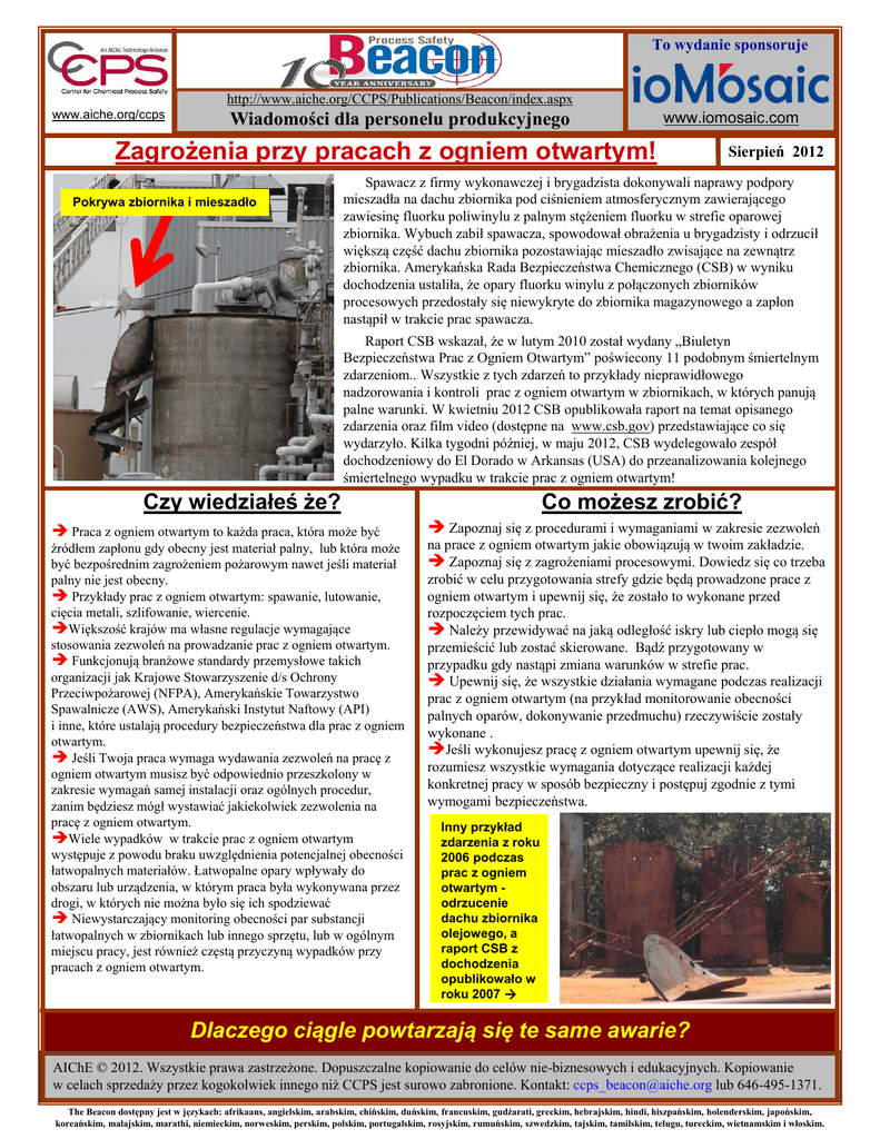To wydanie sponsoruje http://www.aiche.org/CCPS/Publications/Beacon/index.aspx www.aiche.org/ccps Wiadomości dla personelu produkcyjnego www.iomosaic.com Zagrożenia przy pracach z ogniem otwartym! Pokrywa zbiornika i mieszadło Sierpień 2012 Spawacz z firmy wykonawczej i brygadzista dokonywali naprawy podpory mieszadła na dachu zbiornika pod ciśnieniem atmosferycznym zawierającego zawiesinę fluorku poliwinylu z palnym stężeniem fluorku w strefie oparowej zbiornika. Wybuch zabił spawacza, spowodował obrażenia u brygadzisty i odrzucił większą część dachu zbiornika pozostawiając mieszadło zwisające na zewnątrz zbiornika. Amerykańska Rada Bezpieczeństwa Chemicznego (CSB) w wyniku dochodzenia ustaliła, że opary fluorku winylu z połączonych zbiorników procesowych przedostały się niewykryte do zbiornika magazynowego a zapłon nastąpił w trakcie prac spawacza. Raport CSB wskazał, że w lutym 2010 został wydany „Biuletyn Bezpieczeństwa Prac z Ogniem Otwartym” poświecony 11 podobnym śmiertelnym zdarzeniom.. Wszystkie z tych zdarzeń to przykłady nieprawidłowego nadzorowania i kontroli prac z ogniem otwartym w zbiornikach, w których panują palne warunki. W kwietniu 2012 CSB opublikowała raport na temat opisanego zdarzenia oraz film video (dostępne na www.csb.gov) przedstawiające co się wydarzyło. Kilka tygodni później, w maju 2012, CSB wydelegowało zespół dochodzeniowy do El Dorado w Arkansas (USA) do przeanalizowania kolejnego śmiertelnego wypadku w trakcie prac z ogniem otwartym! Czy wiedziałeś że? Î Praca z ogniem otwartym to każda praca, która może być źródłem zapłonu gdy obecny jest materiał palny, lub która może być bezpośrednim zagrożeniem pożarowym nawet jeśli materiał palny nie jest obecny. Î Przykłady prac z ogniem otwartym: spawanie, lutowanie, cięcia metali, szlifowanie, wiercenie. ÎWiększość krajów ma własne regulacje wymagające stosowania zezwoleń na prowadzanie prac z ogniem otwartym. Î Funkcjonują branżowe standardy przemysłowe takich organizacji jak Krajowe Stowarzyszenie d/s Ochrony Przeciwpożarowej (NFPA), Amerykańskie Towarzystwo Spawalnicze (AWS), Amerykański Instytut Naftowy (API) i inne, które ustalają procedury bezpieczeństwa dla prac z ogniem otwartym. Î Jeśli Twoja praca wymaga wydawania zezwoleń na pracę z ogniem otwartym musisz być odpowiednio przeszkolony w zakresie wymagań samej instalacji oraz ogólnych procedur, zanim będziesz mógł wystawiać jakiekolwiek zezwolenia na pracę z ogniem otwartym. ÎWiele wypadków w trakcie prac z ogniem otwartym występuje z powodu braku uwzględnienia potencjalnej obecności łatwopalnych materiałów. Łatwopalne opary wpływały do obszaru lub urządzenia, w którym praca była wykonywana przez drogi, w których nie można było się ich spodziewać Î Niewystarczający monitoring obecności par substancji łatwopalnych w zbiornikach lub innego sprzętu, lub w ogólnym miejscu pracy, jest również częstą przyczyną wypadków przy pracach z ogniem otwartym. Co możesz zrobić? Î Zapoznaj się z procedurami i wymaganiami w zakresie zezwoleń na prace z ogniem otwartym jakie obowiązują w twoim zakładzie. Î Zapoznaj się z zagrożeniami procesowymi. Dowiedz się co trzeba zrobić w celu przygotowania strefy gdzie będą prowadzone prace z ogniem otwartym i upewnij się, że zostało to wykonane przed rozpoczęciem tych prac. Î Należy przewidywać na jaką odległość iskry lub ciepło mogą się przemieścić lub zostać skierowane. Bądź przygotowany w przypadku gdy nastąpi zmiana warunków w strefie prac. Î Upewnij się, że wszystkie działania wymagane podczas realizacji prac z ogniem otwartym (na przykład monitorowanie obecności palnych oparów, dokonywanie przedmuchu) rzeczywiście zostały wykonane . ÎJeśli wykonujesz pracę z ogniem otwartym upewnij się, że rozumiesz wszystkie wymagania dotyczące realizacji każdej konkretnej pracy w sposób bezpieczny i postępuj zgodnie z tymi wymogami bezpieczeństwa. Inny przykład zdarzenia z roku 2006 podczas prac z ogniem otwartym odrzucenie dachu zbiornika olejowego, a raport CSB z dochodzenia opublikowało w roku 2007 Æ Dlaczego ciągle powtarzają się te same awarie? AIChE © 2012. Wszystkie prawa zastrzeżone. Dopuszczalne kopiowanie do celów nie-biznesowych i edukacyjnych. Kopiowanie w celach sprzedaży przez kogokolwiek innego niż CCPS jest surowo zabronione. Kontakt: [email protected] lub 646-495-1371. The Beacon dostępny jest w językach: afrikaans, angielskim, arabskim, chińskim, duńskim, francuskim, gudżarati, greckim, hebrajskim, hindi, hiszpańskim, holenderskim, japońskim, koreańskim, malajskim, marathi, niemieckim, norweskim, perskim, polskim, portugalskim, rosyjskim, rumuńskim, szwedzkim, tajskim, tamilskim, telugu, tureckim, wietnamskim i włoskim.