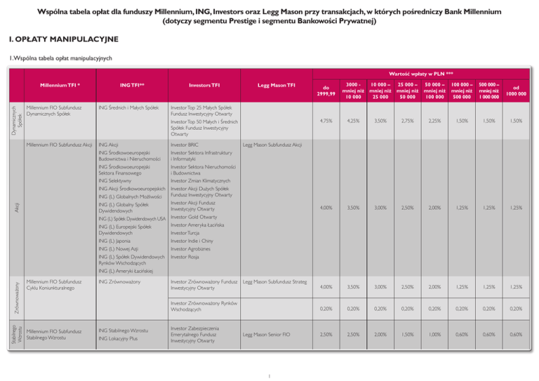 Wspólna tabela opłat dla funduszy Millennium, ING, Investors oraz Legg Mason przy transakcjach, w których pośredniczy Bank Millennium (dotyczy segmentu Prestige i segmentu Bankowości Prywatnej) I. OPŁATY MANIPULACYJNE 1.Wspólna tabela opłat manipulacyjnych Wartość wpłaty w PLN *** Dynamicznych Spółek Millennium TFI * Millennium FIO Subfundusz Dynamicznych Spółek ING TFI** ING Średnich i Małych Spółek Investors TFI Legg Mason TFI Akcji 3000 mniej niż 10 000 10 000 – mniej niż 25 000 25 000 – mniej niż 50 000 50 000 – mniej niż 100 000 100 000 – mniej niż 500 000 500 000 – mniej niż 1 000 000 od 1000 000 4,75% 4,25% 3,50% 2,75% 2,25% 1,50% 1,50% 1,50% 4,00% 3,50% 3,00% 2,50% 2,00% 1,25% 1,25% 1,25% 4,00% 3,50% 3,00% 2,50% 2,00% 1,25% 1,25% 1,25% 0,20% 0,20% 0,20% 0,20% 0,20% 0,20% 0,20% 0,20% 2,50% 2,50% 2,00% 1,50% 1,00% 0,60% 0,60% 0,60% Investor Top 25 Małych Spółek Fundusz Inwestycyjny Otwarty Investor Top 50 Małych i Średnich Spółek Fundusz Inwestycyjny Otwarty Millennium FIO Subfundusz Akcji do 2999,99 ING Akcji Investor BRIC ING Środkowoeuropejski Budownictwa i Nieruchomości Investor Sektora Infrastruktury i Informatyki ING Środkowoeuropejski Sektora Finansowego Investor Sektora Nieruchomości i Budownictwa ING Selektywny Investor Zmian Klimatycznych ING Akcji Środkowoeuropejskich ING (L) Globalnych Możliwości Investor Akcji Dużych Spółek Fundusz Inwestycyjny Otwarty ING (L) Globalny Spółek Dywidendowych Investor Akcji Fundusz Inwestycyjny Otwarty ING (L) Spółek Dywidendowych USA Investor Gold Otwarty ING (L) Europejski Spółek Dywidendowych Investor Ameryka Łacińska ING (L) Japonia Investor Indie i Chiny ING (L) Nowej Azji Investor Agrobiznes ING (L) Spółek Dywidendowych Rynków Wschodzących Investor Rosja Legg Mason Subfundusz Akcji Investor Turcja Stabilnego Wzrostu Zrównoważony ING (L) Ameryki Łacińskiej Millennium FIO Subfundusz Cyklu Koniunkturalnego ING Zrównoważony Investor Zrównoważony Fundusz Inwestycyjny Otwarty Legg Mason Subfundusz Strateg Investor Zrównoważony Rynków Wschodzących Millennium FIO Subfundusz Stabilnego Wzrostu ING Stabilnego Wzrostu ING Lokacyjny Plus Investor Zabezpieczenia Emerytalnego Fundusz Inwestycyjny Otwarty Legg Mason Senior FIO 1 Wartość wpłaty w PLN *** Millennium TFI * ING TFI** Investors TFI Legg Mason TFI do 2999,99 3000 mniej niż 10 000 10 000 – mniej niż 25 000 25 000 – mniej niż 50 000 50 000 – mniej niż 100 000 100 000 – mniej niż 500 000 500 000 – mniej niż 1 000 000 od 1000 000 2,00% 1,75% 1,50% 1,25% 1,00% 0,75% 0,75% 0,75% 0,50% 0,50% 0,50% 0,40% 0,40% 0,30% 0,30% 0,30% 1,50% 1,25% 1,00% 1,00% 0,80% 0,75% 0,75% 0,75% 0,00% 0,00% 0,00% 0,00% 0,00% 0,00% 0,00% 0,00% Obligacji ING (L) Globalny Długu Korporacyjnego ING (L) Obligacji Rynków Wschodzących (WL) ING Obligacji Investor Obligacji Fundusz Inwestycyjny Otwarty Legg Mason Subfundusz Obligacji Pieniężny Millennium FIO Subfundusz Instrumentów Dłużnych Millennium FIO Subfundusz Depozytowy ING Gotówkowy Investor Gotówkowy Legg Mason Subfundusz Pieniężny Investor Płynna Lokata Fundusz Inwestycyjny Otwarty * Minimalna wpłata dla subfunduszy wynosi 500 PLN. ** Minimalna wysokość wpłat tytułem nabycia jednostek uczestnictwa wynosi 200 PLN w przypadku pierwszego nabycia oraz 50 PLN w przypadku każdego następnego nabycia. Minimalna wysokość wpłat tytułem nabycia jednostek uczestnictwa w walutach wynosi 50 EUR / USD w przypadku pierwszego nabycia oraz 10 EUR / USD w przypadku każdego następnego nabycia. *** W przypadku Legg Mason TFI wartość pierwszej wpłaty lub suma wartości rejestru/subrejestru i kolejnej wpłaty. Zniżka w opłacie manipulacyjnej może nastąpić tylko w przypadku Klientów segmentu Bankowości Prywatnej. Promocje dotyczące Millennium FIO i SFIO: 2. Millennium TFI Stawki opłat dla Millennium SFIO Wartość wpłaty dla PLN * do 2999,99 3000 - mniej niż 10000 10 000 – mniej niż 25 000 25 000 – mniej niż 50 000 50 000 – mniej niż 100 000 100 000 – mniej niż 500 000 od 500 000 Globalny Akcji 2,50% 2,50% 2,50% 2,00% 2,00% 1,50% 1,50% Absolute Return 2,50% 2,50% 2,50% 2,00% 2,00% 1,50% 1,50% Globalny Stabilnego Wzrostu 2,50% 2,50% 2,50% 2,00% 2,00% 1,50% 1,50% Globalny Strategii Alternatywnych 2,50% 2,50% 2,50% 2,00% 2,00% 1,50% 1,50% Obligacji Korporacyjnych 0,50% 0,50% 0,50% 0,40% 0,30% 0,20% 0,20% Millennium TFI * * Minimalna wpłata do subfunduszu wynosi 500 PLN. Zniżka w opłacie manipulacyjnej może nastąpić tylko w przypadku Klientów segmentu Bankowości Prywatnej. Zasady naliczania opłat manipulacyjnych Fundusze Millennium oferują jednostki uczestnictwa typu A, od których opłaty manipulacyjne pobierane są przy nabyciach. 1. Wprowadzona na okres od dnia 1.04.2014 do 31.12.2014 promocja polegająca na niepobieraniu opłaty manipulacyjnej przy nabyciu jednostek uczestnictwa na rejestry zwykłe Subfunduszu Stabilnego Wzrostu wydzielonego w Millennium FIO oraz Subfunduszu Globalnego Stabilnego Wzrostu wydzielonego w Millennium SFIO dla linii biznesowych Detal, Prestige i Bankowość Prywatna. Promocja dotyczy również nabyć dokonanych za pośrednictwem Millenet. 2. Wprowadzona na okres od dnia 22.07.2013 do 31.12.2014 promocja polegająca na niepobieraniu opłaty manipulacyjnej (wyrównawczej) przy zamianie jednostek uczestnictwa na rejestry zwykłe wszystkich subfunduszy Millennium FIO i Millennium SFIO. Promocja dotyczy również zamian dokonanych za pośrednictwem Millenet. 3. Wprowadzona od dnia 1.06.2013 do odwołania promocja polegająca na obniżeniu opłaty manipulacyjnej o 50%, względem standardowej Tabeli opłat, za nabycie jednostek uczestnictwa przez bankowość internetową Millenet wszystkich pozostałych subfunduszy Millennium FIO i SFIO poza subfunduszami wymienionymi w pkt.1. Wyżej wymienione promocje nie dotyczą Planów Oszczędnościowych tj. CPI, PSO, PIM oraz Planu Super Duetu. Zasada akumulacji W fundusza