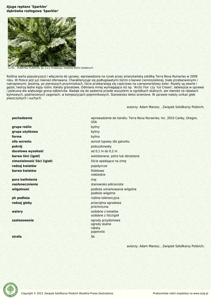 Ajuga reptans 'Sparkler' dąbrówka rozłogowa 'Sparkler' (c) fot. - PLANTPOL PLANTPOL Sp. z o.o. Produkcja i Hodowla Roślin Ozdobnych Roślina warta popularyzacji i włączenia do uprawy, wprowadzona na rynek przez amerykańską szkółkę Terra Nova Nurseries w 2009 roku. W Polsce jest już również oferowana. Charakteryzuje się podługowatymi liśćmi o barwie ciemnozielonej, biało przebarwionymi i nakrapianymi. Jesienią, po pierwszych przymrozkach, liście przebarwiają się częściowo na czerwonoróżowy kolor. Rozety są zwarte i gęste, tworzą ładne kępy roślin. Kwiaty granatowe. Odmiana mniej wymagająca niż np. ‘Arctic Fox’ czy ‘Ice Cream’, łatwiejsza w uprawie i polecana dla większego grona odbiorców. Nadaje się do sadzenia przede wszystkim w ogródkach skalnych, ale również na rabatach bylinowych, podniesionych zagonach, w kompozycjach pojemnikowych. Stanowisko lekko ocienione. W uprawie należy unikać gleb piaszczystych i suchych. autorzy: Adam Marosz; , Związek Szkółkarzy Polskich; pochodzenie wprowadzenie do handlu: Terra Nova Nurseries, Inc. 2010 Canby, Oregon, USA grupa roślin byliny grupa użytkowa byliny forma bylina siła wzrostu wzrost typowy dla gatunku pokrój poduszkowaty docelowa wysokość od 0,1 m do 0,2 m barwa liści (igieł) wielobarwne, pstre lub obrzeżone zimozieloność liści (igieł) liście opadające na zimę rodzaj kwiatów pojedyncze barwa kwiatów fioletowe niebieskie pora kwitnienia maj nasłonecznienie stanowisko półcieniste wilgotność podłoże umiarkowanie wilgotne podłoże wilgotne ph podłoża roślina tolerancyjna rodzaj gleby przeciętna ogrodowa próchniczna walory ozdobne z kwiatów ozdobne z liści/igieł zastosowanie ogrody przydomowe ogrody skalne rabaty pojemniki strefa 5b autorzy: Adam Marosz; , Związek Szkółkarzy Polskich; Copyright © 2013. Związek Szkółkarzy Polskich Wszelkie Prawa Zastrzeżone. Producentów roślin znajdziesz na www.zszp.pl