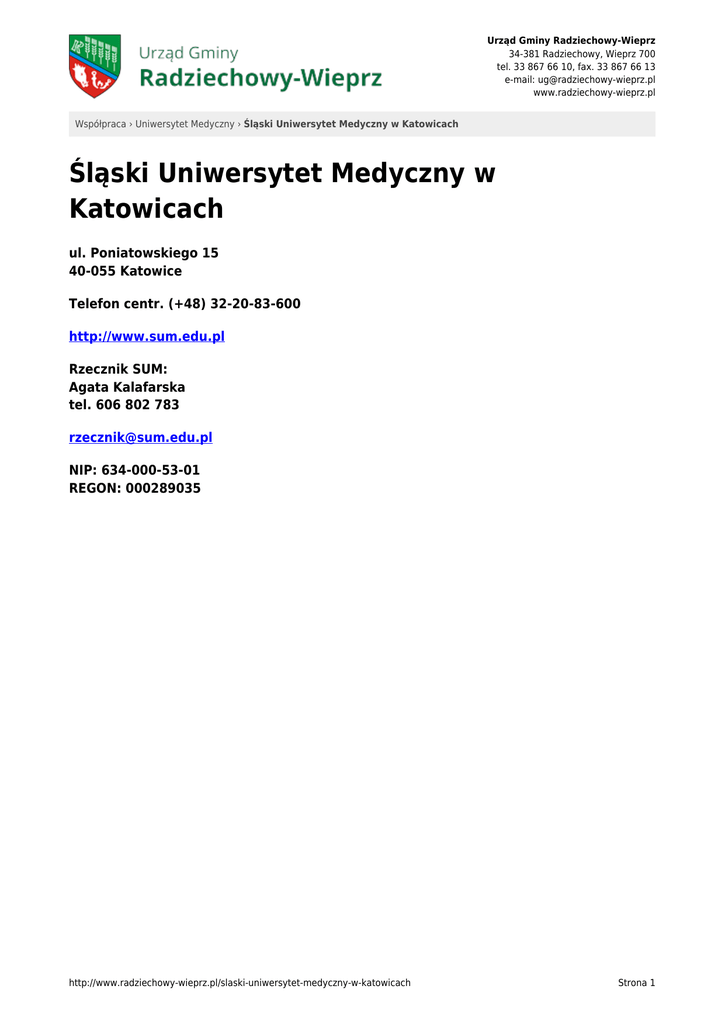 Urząd Gminy Radziechowy-Wieprz 34-381 Radziechowy, Wieprz 700 tel. 33 867 66 10, fax. 33 867 66 13 e-mail: [email protected] www.radziechowy-wieprz.pl Współpraca › Uniwersytet Medyczny › Śląski Uniwersytet Medyczny w Katowicach Śląski Uniwersytet Medyczny w Katowicach ul. Poniatowskiego 15 40-055 Katowice Telefon centr. (+48) 32-20-83-600 http://www.sum.edu.pl Rzecznik SUM: Agata Kalafarska tel. 606 802 783 [email protected] NIP: 634-000-53-01 REGON: 000289035 http://www.radziechowy-wieprz.pl/slaski-uniwersytet-medyczny-w-katowicach Strona 1