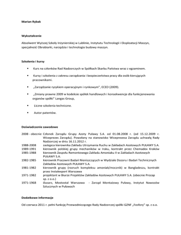 Marian Rybak Wykształcenie Absolwent Wyższej Szkoły Inżynierskiej w Lublinie, Instytutu Technologii i Eksploatacji Maszyn, specjalność Obrabiarki, narzędzia i technologia budowy maszyn. Szkolenia i kursy Kurs na członków Rad Nadzorczych w Spółkach Skarbu Państwa wraz z egzaminem. Kursy i szkolenia z zakresu zarządzania i bezpieczeństwa pracy dla osób kierujących pracownikami. „Zarządzanie ryzykiem operacyjnym i rynkowym”, ECED (2009). „Zmiany prawne 2009 w kodeksie spółek handlowych i konsekwencje dla funkcjonowania organów spółki” Langas Group, Liczne szkolenia techniczne. Autor patentów. Doświadczenie zawodowe 2008 - obecnie Członek Zarządu Grupy Azoty Puławy S.A. od 01.08.2008 r. (od 15.12.2009 r. Wiceprezes Zarządu). Powołany na stanowisko Wiceprezesa Zarządu uchwałą Rady Nadzorczej w dniu 16.11.2012 r. 1988-2008 zastępca kierownika Zakładu Utrzymania Ruchu w Zakładach Azotowych PUŁAWY S.A. 1989-1991 kierownik polskiej grupy mechaników w Iraku, kontrakt przez Chemadex Kraków 1985-1988 kierownik Zespołu Remontowego Zakładu Amoniaku II w Zakładach Azotowych PUŁAWY S.A. 1982-1985 kierownik Pracowni Badań Nieniszczących w Wydziale Dozoru i Badań Technicznych Zakładów Azotowych PUŁAWY S.A. 1981-1982 kierownik grupy (rozruch kompleksu amoniak/mocznik) w Bangladeszu, kontrakt przez Instalexport Warszawa 1971-1982 projektant w Biurze Projektów Zakładów Azotowych PUŁAWY S.A. (obecnie Prozap sp. z o.o.) 1971-1968 ślusarz, Mostostal Warszawa - Zarząd Montażowy Puławy, Instytut Nawozów Sztucznych w Puławach Dodatkowe informacje Od czerwca 2011 r. pełni funkcję Przewodniczącego Rady Nadzorczej spółki GZNF „Fosfory” sp. z o.o.