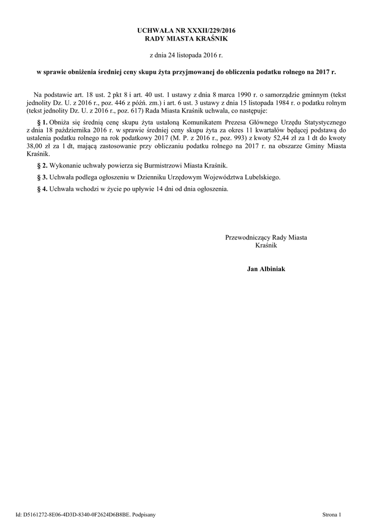 UCHWAŁA NR XXXII/229/2016 RADY MIASTA KRAŚNIK z dnia 24 listopada 2016 r. w sprawie obniżenia średniej ceny skupu żyta przyjmowanej do obliczenia podatku rolnego na 2017 r. Na podstawie art. 18 ust. 2 pkt 8 i art. 40 ust. 1 ustawy z dnia 8 marca 1990 r. o samorządzie gminnym (tekst jednolity Dz. U. z 2016 r., poz. 446 z późń. zm.) i art. 6 ust. 3 ustawy z dnia 15 listopada 1984 r. o podatku rolnym (tekst jednolity Dz. U. z 2016 r., poz. 617) Rada Miasta Kraśnik uchwala, co następuje: § 1. Obniża się średnią cenę skupu żyta ustaloną Komunikatem Prezesa Głównego Urzędu Statystycznego z dnia 18 października 2016 r. w sprawie średniej ceny skupu żyta za okres 11 kwartałów będącej podstawą do ustalenia podatku rolnego na rok podatkowy 2017 (M. P. z 2016 r., poz. 993) z kwoty 52,44 zł za 1 dt do kwoty 38,00 zł za 1 dt, mającą zastosowanie przy obliczaniu podatku rolnego na 2017 r. na obszarze Gminy Miasta Kraśnik. § 2. Wykonanie uchwały powierza się Burmistrzowi Miasta Kraśnik. § 3. Uchwała podlega ogłoszeniu w Dzienniku Urzędowym Województwa Lubelskiego. § 4. Uchwała wchodzi w życie po upływie 14 dni od dnia ogłoszenia. Przewodniczący Rady Miasta Kraśnik Jan Albiniak Id: D5161272-8E06-4D3D-8340-0F2624D6B8BE. Podpisany Strona 1