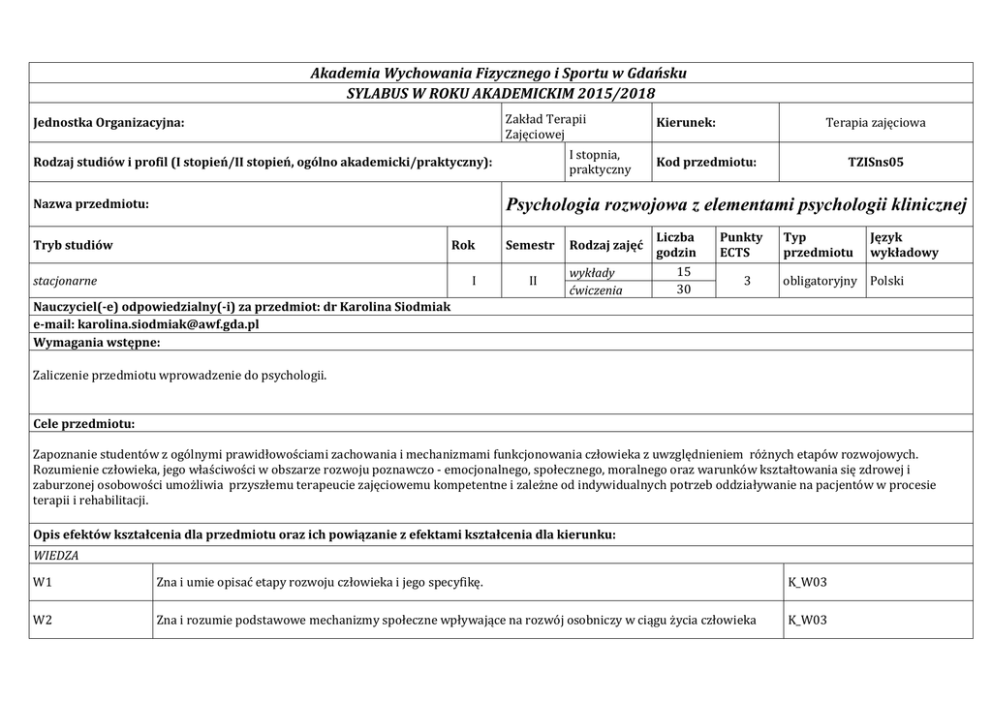 Akademia Wychowania Fizycznego i Sportu w Gdańsku SYLABUS W ROKU AKADEMICKIM 2015/2018 Zakład Terapii Zajęciowej Jednostka Organizacyjna: I stopnia, praktyczny Rodzaj studiów i profil (I stopień/II stopień, ogólno akademicki/praktyczny): Terapia zajęciowa Kierunek: Kod przedmiotu: TZISns05 Psychologia rozwojowa z elementami psychologii klinicznej Nazwa przedmiotu: Tryb studiów Rok stacjonarne I Semestr II Rodzaj zajęć wykłady ćwiczenia Liczba godzin 15 30 Punkty ECTS 3 Typ przedmiotu Język wykładowy obligatoryjny Polski Nauczyciel(-e) odpowiedzialny(-i) za przedmiot: dr Karolina Siodmiak e-mail: [email protected] Wymagania wstępne: Zaliczenie przedmiotu wprowadzenie do psychologii. Cele przedmiotu: Zapoznanie studentów z ogólnymi prawidłowościami zachowania i mechanizmami funkcjonowania człowieka z uwzględnieniem różnych etapów rozwojowych. Rozumienie człowieka, jego właściwości w obszarze rozwoju poznawczo - emocjonalnego, społecznego, moralnego oraz warunków kształtowania się zdrowej i zaburzonej osobowości umożliwia przyszłemu terapeucie zajęciowemu kompetentne i zależne od indywidualnych potrzeb oddziaływanie na pacjentów w procesie terapii i rehabilitacji. Opis efektów kształcenia dla przedmiotu oraz ich powiązanie z efektami kształcenia dla kierunku: WIEDZA W1 Zna i umie opisać etapy rozwoju człowieka i jego specyfikę. K_W03 W2 Zna i rozumie podstawowe mechanizmy społeczne wpływające na rozwój osobniczy w ciągu życia człowieka K_W03 Zna podstawy poznawczo – emocjonalno – społeczne funkcjonowania człowieka w różnych wieku w zakresie terapii zajęciowej. K_W09 U1 Umie zaprezentować swoje przemyślenia związane z różnymi etapami rozwoju człowieka. K_U19 U2 Potrafi interpretować ludzkie zachowań w perspektywie różnych etapów rozwojowych. K_U01 U3 Potrafi samodzielnie identyfikować zachowania pacjentów i nadawać temu interpretację. K_U04 K1 Rozumie psychologiczny aspekt problemów pacjenta w zależności od jego wieku i zadań rozwojowych K_K05 K2 Potrafi przekonywująco przedstawiać swoje zdanie i pracować w zespole biorąc odpowiedzialność za wspólna pracę. K_K09 W3 UMIEJĘTNOŚCI KOMPETENCJE Kryteria i metody oceny osiągniętych efektów kształcenia: 1. Odpowiedź na pytania w czasie kolokwium/egzaminu (pytania otwarte), 2. Prezentacja obejmująca treści ćwiczeń: wskazanie pytania problemowego, oryginalność, poprawność merytoryczna prezentacji, aktywizacja grupy. 3. Obecność na zajęciach (ćwiczeniach). Aby uzyskać zaliczenie przedmiotu na ocenę dostateczną student musi osiągnąć wszystkie wymienione przedmiotowe efekty kształcenia. Metody i formy realizacji przedmiotu: Wykłady, ćwiczenia (praca w grupach, analiza przypadków, dyskusja, elementy treningu umiejętności komunikacyjnych) Treści kształcenia: Wykłady: 1. Psychologia rozwojowa jako nauka. 2. Cechy zmian rozwojowych 3. Znaczenie stylów wychowawczych w rodzinie na kształtowanie się rozwoju psychicznego dziecka. 4. Rozwój prenatalny 5. Wczesne dzieciństwo i kształtowanie się relacji przywiązania. 6. Psychoanalityczna teoria rozwojowa (M.Mahler). 7. Społeczno – poznawcza teoria rozwoju L. Wygotskiego 8. Znaczenie zabawy i fazy rozwoju zabawy w rozwoju. 9. Zasady wychowawcze 10. Teoria rozwoju poznawczego wg Piageta 11. Teoria rozwoju psychospołecznego wg Eriksona. 12. Specyfika dorastania 13. Zachowania ryzykowne, problematyczne wśród młodzieży. 14. Charakterystyka dorosłości Ćwiczenia: 1. Wprowadzenie do przedmiotu 2. Wczesne dzieciństwo: okres niemowlęcy do 1 r. ż 3. Wczesne dzieciństwo: okres poniemowlęcy 2 i 3 r. ż – specyfika rozwoju. 4. Teoria przywiązania wg Bowlbiego i jej znaczenie w życiu dorosłym. 5. Język niemowląt Tracy Hogg – zaklinaczka dzieci. 6. Średnie dzieciństwo – wiek przedszkolny – specyfika rozwoju. 7. Późne dzieciństwo – młodszy wiek szkolny – specyfika rozwoju 8. Dorastanie – specyfika rozwoju. 9. Wczesna dorosłość (18 – 35 r. ż)– charakterystyka rozwoju. 10. Średnia dorosłość (35 – 65 r. ż.)– charakterystyka rozwoju. 11. Późna dorosłość (pow. 65 r. ż.)– charakterystyka rozwoju. 12. Śmierć i żałoba w rodzinie. Forma zaliczenia: Literatura: Egzamin pisemny; pozytywne zaliczenie kolokwium, przedstawienie prezentacji, obecność na zajęciach Podstawowa: Bee, H. (2004). Psychologia rozwoju człowieka. Poznań: Zysk i S-ka Wydawnictwo. Brzezińska, I., A. (2005). Psychologiczne portrety człowieka. Gdańsk: GWP Strelau, J., Doliński, D. (red.), (2008). Psychologia. Podręcznik akademicki, tom 1, 2. Gdańsk: GWP. Trempała J. (2011): Psychologia rozwoju człowieka. Warszawa: PWN. Uzupełniająca: Przetacznik – Gierowska M., Tyszkowa M. (2006): Psychologia rozwoju człowieka. Tom 1,2,3. Warszawa: PWN Rathus, S. A. (2004). Psychologia współczesna. Gdańsk: GWP Strelau, J. (2004). Psychologia. Podręcznik akademicki, tom 2. Gdańsk: PWN Zimbardo, P. G., Ruch, F. L (2006). Psychologia i życie. Warszawa: PWN. Vasta R., Haith M.M., Miller S.A. (1995): Psychologia dziecka. Warszawa: WiS Bilans punktów ECTS (1 pkt ECTS – 25-30 godz. pracy studenta): Aktywność Udział w wykładach Samodzielne studiowanie tematyki wykładów Udział w ćwiczeniach Przygotowanie się do ćwiczeń Konsultacje Prezentacja Obciążenie studenta godz. 15 godz.10 godz. 30 godz.15 godz.10 godz.10 Całkowite obciążenie pracą studenta Punkty ECTS za przedmiot godz.90 ECTS 3