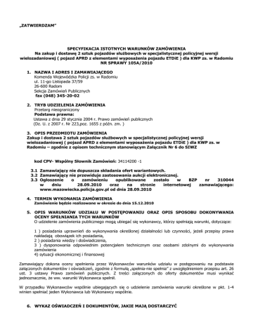 „ZATWIERDZAM” SPECYFIKACJA ISTOTNYCH WARUNKÓW ZAMÓWIENIA Na zakup i dostawę 2 sztuk pojazdów słuŜbowych w specjalistycznej policyjnej wersji wielozadaniowej ( pojazd APRD z elementami wyposaŜenia pojazdu ETDiE ) dla KWP zs. w Radomiu NR SPRAWY 105A/2010 1. NAZWA I ADRES I ZAMAWIAJĄCEGO Komenda Wojewódzka Policji zs. w Radomiu ul. 11-go Listopada 37/59 26-600 Radom Sekcja Zamówień Publicznych fax (048) 345-20-02 2. TRYB UDZIELENIA ZAMÓWIENIA Przetarg nieograniczony Podstawa prawna: Ustawa z dnia 29 stycznia 2004 r. Prawo zamówień publicznych (Dz. U. z 2007 r. Nr 223,poz. 1655 z późn. zm. ) 3. OPIS PRZEDMIOTU ZAMÓWIENIA Zakup i dostawa 2 sztuk pojazdów słuŜbowych w specjalistycznej policyjnej wersji wielozadaniowej ( pojazd APRD z elementami wyposaŜenia pojazdu ETDiE ) dla KWP zs. w Radomiu – zgodnie z opisem technicznym stanowiącym Załącznik Nr 6 do SIWZ kod CPV- Wspólny Słownik Zamówień: 34114200 -1 3.1 Zamawiający nie dopuszcza składania ofert wariantowych. 3.2 Zamawiający nie przewiduje zastosowania aukcji elektronicznej. 3.3 Ogłoszenie o zamówieniu opublikowane zostało w BZP nr 310044 w dniu 28.09.2010 oraz na stronie internetowej zamawiającego: www.mazowiecka.policja.gov.pl od dnia 28.09.2010 4. TERMIN WYKONANIA ZAMÓWIENIA Zamówienie będzie realizowane w okresie do dnia 15.12.2010 5. OPIS WARUNKÓW UDZIAŁU W POSTĘPOWANIU ORAZ OPIS SPOSOBU DOKONYWANIA OCENY SPEŁNIANIA TYCH WARUNKÓW O udzielenie zamówienia publicznego mogą ubiegać się wykonawcy, którzy spełniają warunki, dotyczące: 1 ) posiadania uprawnień do wykonywania określonej działalności lub czynności, jeŜeli przepisy prawa nakładają obowiązek ich posiadania, 2 ) posiadania wiedzy i doświadczenia, 3 ) dysponowania odpowiednim potencjałem technicznym oraz osobami zdolnymi do wykonywania zamówienia 4) sytuacji ekonomicznej i finansowej Zamawiający dokona oceny spełnienia przez Wykonawców warunków udziału w postępowaniu na podstawie załączonych dokumentów i oświadczeń, zgodnie z formułą „spełnia-nie spełnia” z uwzględnieniem przepisu art. 26 ust. 3 ustawy Prawo zamówień publicznych. Z treści załączonych do oferty dokumentów musi wynikać jednoznacznie, Ŝe ww. warunki Wykonawca spełnił. W przypadku Wykonawców wspólnie ubiegających się o udzielenie zamówienia warunki określone w pkt. 1-4 winien spełniać jeden Wykonawca lub Wykonawcy wspólnie. 6. WYKAZ OŚWIADCZEŃ I DOKUMENTÓW, JAKIE MAJĄ DOSTARCZYĆ WYKONAWCY I. GRUPA W celu wykazania spełniania przez wykonawcę warunków udziału w postępowaniu zamawiający Ŝąda: a) oświadczenia o spełnianiu warunków udziału w postępowaniu określonych w art. 22 ust. 1 pkt. 1-4 ( zgodnego w treści z załącznikiem nr 1 do siwz) b) UWAGA! Wykonawca moŜe polegać na wiedzy i doświadczeniu, potencjale technicznym, osobach zdolnych do wykonania zamówienia lub zdolnościach finansowych innych podmiotów, niezaleŜnie od charakteru prawnego łączących go nimi stosunków. Wykonawca w takiej sytuacji zobowiązany jest udowodnić zamawiającemu, iŜ będzie dysponował zasobami niezbędnymi do realizacji zamówienia, w szczególności przedstawiając w tym celu pisemne zobowiązanie tych podmiotów do oddania mu do dysponowania niezbędnych zasobów na okres korzystania z nich przy wykonywaniu zamówienia. PowyŜsze dokumenty muszą być złoŜone w formie oryginału. c ) Zaświadczenie o wpisie do ewidencji psychologów uprawnionych do przeprowadzania badań psychologicznych, o których mowa w art. 124 ustawy z dnia 20.06.2010 – Prawo o ruchu drogowym II GRUPA W celu wykazania braku podstaw do wykluczenia z postępowania o udzielenie zamówienia wykonawcy w okolicznościach, o których mowa w art. 24 ust. 1 cyt. ustawy, zamawiający Ŝąda następujących dokumentów: d) oświadczenia o braku podstaw do wykluczenia ( zgodnego w treści z załącznikiem nr 2 do siwz) e) aktualnego odpisu z właściwego rejestru, jeŜeli odrębne przepisy wymagają wpisu do rejestru, w celu wykazania braku podstaw do wykluczenia w oparciu o art. 24 ust. 1 pkt. 2 ustawy, wystawionego nie wcześniej niŜ 6 miesięcy przed upływem terminu składania ofert, a w stosunku do osób fizycznych oświadczenia w zakresie art. 24 ust. 1 pkt. 2 ustawy( zgodnego w treści z załącznikiem nr 3 do siwz ) f ) aktualnego zaświadczenia właściwego naczelnika urzędu skarbowego potwierdzającego, Ŝe wykonawca nie zalega z opłacaniem podatków, lub zaświadczenie Ŝe uzyskał przewidziane prawem zwolnienie, odroczenie lub rozłoŜenie na raty zaległych płatności lub wstrzymanie w całości wykonania decyzji właściwego organu – wystawione nie wcześniej niŜ 3 miesiące przed upływem terminu składania ofert. PowyŜsze dokumenty muszą być złoŜone w formie oryginału lub kserokopii potwierdzonej formułą „za zgodność z oryginałem„ przez osobę ( osoby ) upowaŜnione do reprezentowania Wykonawcy W celu potwierdzenia, Ŝe oferowane dostawy odpowiadają wymaganiom określonym przez zamawiającego, zamawiający Ŝąda : g )- wyciągu ze świadectwa homologacji typu pojazdu ( pojazd bazowy ) III. GRUPA h )W przypadku udzielenia pełnomocnictwa - oryginał pełnomocnictwa lub kopia poświadczona przez notariusza. IV.GRUPA: i ) parafowany wzór umowy (wzór stanowi załącznik nr 4), j ) wypełniony i podpisany druk oferty (wzór stanowi załącznik Nr 5 ) PowyŜsze dokumenty z GRUPY IV muszą być opatrzone pieczęcią i podpisem osoby (osób) upowaŜnionych do reprezentowania Wykonawcy, za wyjątkiem wzoru umowy, który moŜe być jedynie parafowany. W przypadku wykonawców wspólnie ubiegających się o udzielenie zamówienia wymagane jest określenie pełnomocnika do ich reprezentowania w postępowaniu albo reprezentowania w postępowaniu i zawarcia umowy w sprawie zamówienia publicznego. Oryginał pełnomocnictwa, z którego musi wynikać zakres umocowania dla pełnomocnika ustanowionego przez wykona