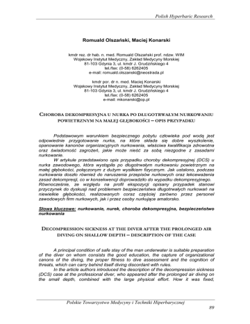 Polish Hyperbaric Research Romuald Olszański, Maciej Konarski kmdr rez. dr hab. n. med. Romuald Olszański prof. ndzw. WIM Wojskowy Instytut Medyczny, Zakład Medycyny Morskiej 81-103 Gdynia 3, ul. kmdr J. Grudzińskiego 4 tel./fax: (0-58) 6262405 e-mail: [email protected] kmdr por. dr n. med. Maciej Konarski Wojskowy Instytut Medyczny, Zakład Medycyny Morskiej 81-103 Gdynia 3, ul. kmdr J. Grudzińskiego 4 tel./fax: (0-58) 6262405 e-mail: [email protected] CHOROBA DEKOMPRESYJNA U NURKA PO DŁUGOTRWAŁYM NURKOWANIU POWIETRZNYM NA MAŁEJ GŁĘBOKOŚCI – OPIS PRZYPADKU Podstawowym warunkiem bezpiecznego pobytu człowieka pod wodą jest odpowiednie przygotowanie nurka, na które składa się dobre wyszkolenie, opanowanie kanonów organizacyjnych nurkowania, właściwa kwalifikacja zdrowotna oraz świadomość zagrożeń, jakie może nieść za sobą niezgodne z zasadami nurkowanie. W artykule przedstawiono opis przypadku choroby dekompresyjnej (DCS) u nurka zawodowego, która wystąpiła po długotrwałym nurkowaniu powietrznym na małej głębokości, połączonym z dużym wysiłkiem fizycznym. Jak ustalono, podczas nurkowania doszło również do naruszenia przepisów nurkowych oraz lekceważenia zasad dekompresji, co w konsekwencji doprowadziło do wypadku dekompresyjnego. Równocześnie, ze względu na profil ekspozycji opisany przypadek stanowi przyczynek do dyskusji nad problemem bezpieczeństwa długotrwałych nurkowań na niewielkie głębokości, realizowanych coraz częściej zarówno przez personel zawodowych firm nurkowych, jak i przez osoby nurkujące amatorsko. Słowa kluczowe: nurkowanie, nurek, choroba dekompresyjna, bezpieczeństwo nurkowania DECOMPRESSION SICKNESS AT THE DIVER AFTER THE PROLONGED AIR DIVING ON SHALLOW DEPTH – DESCRIPTION OF THE CASE A principal condition of safe stay of the man underwater is suitable preparation of the diver on whom consists the good education, the capture of organizational canons of the diving, the proper fitness to dive assessment and the cognition of threats, which can carry behind itself diving discordant with rules. In the article authors introduced the description of the decompression sickness (DCS) case at the professional diver, who appeared after the prolonged air diving on the small depth, combined with the large physical effort. How it was fixed, Polskie Towarzystwo Medycyny i Techniki Hiperbarycznej 89 Nr 4 (33) 2010 rok transgression of diver′s regulations and slights of rules of the decompression was also reached during the diving, what consequently led to the decompression accident. Simultaneously, for the reason of exposition’s profile the case described determines a contribution to the discussion over the problem of the safety of prolonged dives on shallow depths, realized more and more often both through the staff of professional diver’s firms, as by the unprofessional divers. Key words: diving, diver, decompression sickness, diving safety WSTĘP Współczesny rozwój techniki stwarza nurkom coraz lepsze warunki do przebywania pod wodą oraz zwiększa efektywność i bezpieczeństwo nurkowania [6], jednak warunkiem decydującym o bezpiecznym pobycie w obcym środowisku jest odpowiednie przygotowanie do tego zadania samego człowieka. Przygotowanie to obejmować musi – oprócz wyćwiczenia odpowiedniej techniki, opanowania kanonów organizacyjnych nurkowania [13, 14] i właściwej kwalifikacji zdrowotnej – wyrobienie wśród nurków świadomości zagrożeń dla zdrowia, a nawet i życia, jakie może nieść za sobą niezgodne z zasadami nurkowanie [1, 10]. Właściwy sposób dekompresowania nurka jest istotnym warunkiem przeprowadzania bezpiecznych nurkowań. Na ładunek gazu obojętnego, rozpuszczonego w tkankach podczas nurkowania wpływa głębokość i czas nurkowania, a więc parametry określone w tabelach dekompresyjnych. Przestrzeganie ich wzajemnych relacji oraz profilu dekompresji jest w zdecydowanej większości przypadków wystarczające ze względów bezpieczeństwa nurka, jednak czasami zdarzają się zachorowania na chorobę dekompresyjną (DCS), zależne od innych niż podstawowe (ciśnienie i czas) czynników, wpływających na stopień nasycenia gazem obojętnym, szybkość uwalniania gazu z tkanek i formowania wolnej fazy gazowej pod postacią pęcherzyków [10, 11]. Czynniki, mogące mieć wpływ na przebieg dekompresji przedstawiono w tabeli 1. Zastosowanie powietrza jako czynnika oddechowego podczas nurkowania oraz dekompresji powietrznej jako zasadniczej metody dekompresji per se niesie za sobą ryzyko wystąpienia DCS [11]. Na podstawie danych z piśmiennictwa oraz własnych obserwacji [2, 3, 4, 8, 10], poczynionych podczas zabezpieczania różnych typów nurkowań można stwierdzić, że do epizodów choroby dekompresyjnej dochodzi znamiennie częściej podczas działań w granicznym dla ekspozycji powietrznych zakresie głębokości ponad 50 mH2O, ale także przy długotrwałych nurkowaniach na małe głębokości, które są w praktyce najliczniejszą grupą spośród wszystkich realizowanych ekspozycji nurkowych. Polskie Towarzystwo Medycyny i Techniki Hiperbarycznej 90 Polish Hyperbaric Research Tabela 1. Czynniki mogące wpływać na przebieg dekompresji Środowiskowe Techniczne wiek 1) ciśnienie 1) nurkowania głębokie i płeć 2) czas pobytu (nurkowania) długo trwające 2) szybkość zanurzania i budowa ciała i zawartość 3) rodzaj i czas dekompresji wynurzania tkanki tłuszczowej 4) rodzaj czynnika 3) profil dekompresji wydolność fizyczna (ogólna oddechowego (stopniowana, ciągła) i specyficzna) 5) zawartość (prężność) tlenu i 4) odległości pomiędzy zmęczenie dwutlenku węgla stacjami dekompresji wychłodzenie 6) temperatura 5) aktywność fizyczna przegrzanie 7) wilgotność podczas dekompresji stan psychiczny 8) pora dnia 6) pozycja ciała wypoczynek (sen) 9) stan morza 7) wycieczki z plateau bilans wodny 10) charakterystyka akwenu uprzednio przebyte chor