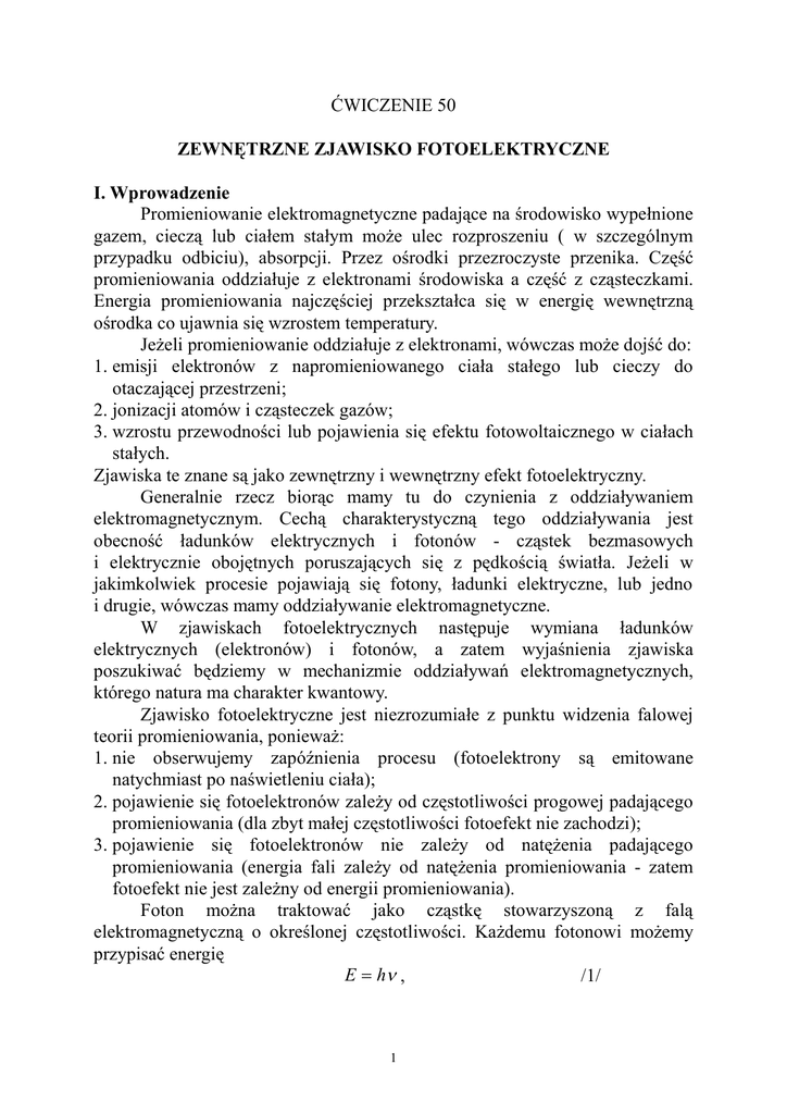 ĆWICZENIE 50 ZEWNĘTRZNE ZJAWISKO FOTOELEKTRYCZNE I. Wprowadzenie Promieniowanie elektromagnetyczne padające na środowisko wypełnione gazem, cieczą lub ciałem stałym może ulec rozproszeniu ( w szczególnym przypadku odbiciu), absorpcji. Przez ośrodki przezroczyste przenika. Część promieniowania oddziałuje z elektronami środowiska a część z cząsteczkami. Energia promieniowania najczęściej przekształca się w energię wewnętrzną ośrodka co ujawnia się wzrostem temperatury. Jeżeli promieniowanie oddziałuje z elektronami, wówczas może dojść do: 1. emisji elektronów z napromieniowanego ciała stałego lub cieczy do otaczającej przestrzeni; 2. jonizacji atomów i cząsteczek gazów; 3. wzrostu przewodności lub pojawienia się efektu fotowoltaicznego w ciałach stałych. Zjawiska te znane są jako zewnętrzny i wewnętrzny efekt fotoelektryczny. Generalnie rzecz biorąc mamy tu do czynienia z oddziaływaniem elektromagnetycznym. Cechą charakterystyczną tego oddziaływania jest obecność ładunków elektrycznych i fotonów - cząstek bezmasowych i elektrycznie obojętnych poruszających się z pędkością światła. Jeżeli w jakimkolwiek procesie pojawiają się fotony, ładunki elektryczne, lub jedno i drugie, wówczas mamy oddziaływanie elektromagnetyczne. W zjawiskach fotoelektrycznych następuje wymiana ładunków elektrycznych (elektronów) i fotonów, a zatem wyjaśnienia zjawiska poszukiwać będziemy w mechanizmie oddziaływań elektromagnetycznych, którego natura ma charakter kwantowy. Zjawisko fotoelektryczne jest niezrozumiałe z punktu widzenia falowej teorii promieniowania, ponieważ: 1. nie obserwujemy zapóźnienia procesu (fotoelektrony są emitowane natychmiast po naświetleniu ciała); 2. pojawienie się fotoelektronów zależy od częstotliwości progowej padającego promieniowania (dla zbyt małej częstotliwości fotoefekt nie zachodzi); 3. pojawienie się fotoelektronów nie zależy od natężenia padającego promieniowania (energia fali zależy od natężenia promieniowania - zatem fotoefekt nie jest zależny od energii promieniowania). Foton można traktować jako cząstkę stowarzyszoną z falą elektromagnetyczną o określonej częstotliwości. Każdemu fotonowi możemy przypisać energię E = hν , /1/ 1 gdzie: h- stała Plancka, a ν -częstotliwość fali elektromagnetycznej z którą foton jest stowarzyszony. Każdemu fotonowi przyporządkowujemy również określony pęd hν p= , /2/ c gdzie: c - prędkość rozchodzenia się światła w próżni. Energię cząstki opisujemy znanym wzorem Einsteina /3/ E = mc , gdzie: m - oznacza masę cząstki. Energia opisana wzorami /1/ i /3/ jest równoważna, stąd hν m= , /4/ c gdzie: m - jest masą elektrodynamiczną fotonu. Masa spoczynkowa m0 = 0, co łatwo udowodnić korzystając ze znanej zależności na masę cząstki poruszającej się z prędkością V m m= /5/ V . 1− c Z zależności /1/, /2/, /4/ a także /5/ widać, że foton ma cechy charakterystyczne cząstce. Foton obdarzony odpowiednią energią i pędem zderzając się z elektronem może przekazać mu energię ,być przez niego pochłonięty a energia przekazana elektronowi w wyniku czego opuści on środowisko (zostanie wybity), lub przejdzie na wyższy poziom energetyczny (wewnętrzne zjawisko fotoelektryczne). Zakładamy, że oddziaływania te mają charakter jednofotonowy, tzn.: jeden foton oddziałuje z jednym elektronem. Nie każdy foton bombardujący środowisko oddziałuje z elektronami. Do oddziaływania między stosunkowo nielicznymi fotonami a elektronami dochodzi rzadko. Makroskopowo efekt ten jest określany jako wydajność fotoelektryczna. Zjawisko fotoelektryczne należy traktować statystycznie w kategoriach prawdopodobieństwa. Rządzą nim prawa mechaniki kwantowej. Zgodnie z zasadą nieoznaczoności nie jesteśmy w stanie przewidzieć między którymi fotonami i elektronami, gdzie i kiedy dojdzie do oddziaływania. Wyniki doświadczalne mają charakter statystyczny, ponieważ obejmują dużą liczbę niemierzalnych i nieobserwowalnych aktów jednostkowych. Ciała stałe mają dobrze określoną powierzchnię, bardzo niską prężność pary nasyconej nad nią co pozwala na utworzenie głębokiej próżni w pobliżu nich. Efekty uboczne nie zakłócają zjawiska fotoelektrycznego. Stosunkowo łatwo wyobrazić sobie wnętrze metalu posługując się modelem studni potencjalnej. Z teorii ciała stałego wiadomo, że sieć krystaliczna metalu składająca się z dodatnich węzłów zanurzona jest w gazie 2 2 0 2 2 2 elektronowym utworzonym z elektronów przewodnictwa wspólnych dla wszystkich atomów tworzących kryształ. Elektrony wchodzące w skład gazu elektronowego mają cechy elektronów „swobodnych”. Wewnątrz metalu ich energia E≤E , gdzie: Ef - jest energią tzw. poziomu Fermiego - wyznaczającego maksymalną energię elektronów w gazie elektronowym. Od otaczającej próżni, wnętrze metalu oddziela bariera potencjału, której wysokość zależy od rodzaju substancji i temperatury. Jeżeli metal ma wyższą temperaturę, wówczas poziom Fermiego Ef jest odpowiednio wyższy a bariera potencjału niższa. Zjawiska na granicy: wnętrze metalu - otoczenie dobrze opisuje jama potencjału przedstawiona na rysunku /1/, f Rys.1. gdzie: -E0 oznacza głębokość studni. Foton o energii E = hν = W /6/ bombardujący powierzchnię metalu oddaje ją elektronom z poziomu Fermiego, dzięki czemu elektrony zdolne są wykonać pracę wyjścia W i opuścić wnętrze metalu. Jeżeli energia /1/ padających fotonów przekroczy energię bariery (osiągnie wartość pracy wyjścia), wówczas zgodnie z zasadą zachowania energii nadwyżka przekształca się w energię kinetyczną wybijanych elektronów. mV E = /7/ 2 Zasadę zachowania możemy zapisać w postaci równania Einsteina mV hν = W + . /8/ 2 Na rysunku 2 ilustrujemy to w modelu jamy potencjalnej gr gr 2 k 2 3 Rys.2. Jeżeli fotony o tej samej 