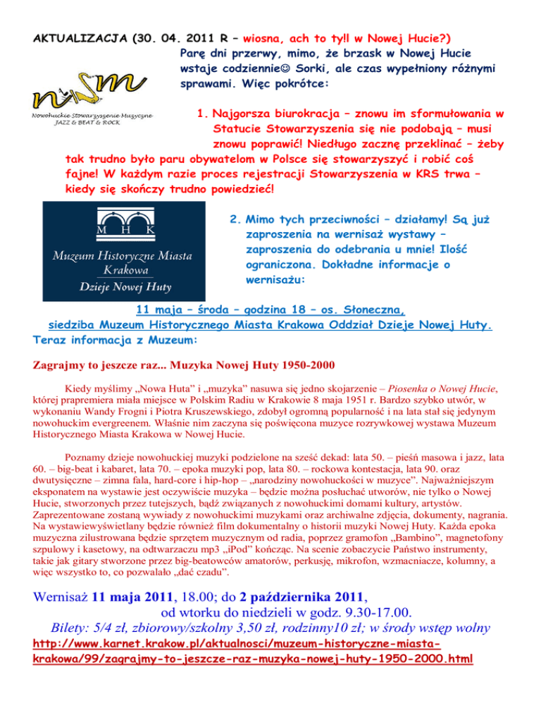 AKTUALIZACJA (30. 04. 2011 R – wiosna, ach to ty!l w Nowej Hucie?) Parę dni przerwy, mimo, że brzask w Nowej Hucie wstaje codziennie Sorki, ale czas wypełniony różnymi sprawami. Więc pokrótce: 1. Najgorsza biurokracja – znowu im sformułowania w Statucie Stowarzyszenia się nie podobają – musi znowu poprawić! Niedługo zacznę przeklinać – żeby tak trudno było paru obywatelom w Polsce się stowarzyszyć i robić coś fajne! W każdym razie proces rejestracji Stowarzyszenia w KRS trwa – kiedy się skończy trudno powiedzieć! 2. Mimo tych przeciwności – działamy! Są już zaproszenia na wernisaż wystawy – zaproszenia do odebrania u mnie! Ilość ograniczona. Dokładne informacje o wernisażu: 11 maja – środa – godzina 18 – os. Słoneczna, siedziba Muzeum Historycznego Miasta Krakowa Oddział Dzieje Nowej Huty. Teraz informacja z Muzeum: Zagrajmy to jeszcze raz... Muzyka Nowej Huty 1950-2000 Kiedy myślimy „Nowa Huta” i „muzyka” nasuwa się jedno skojarzenie – Piosenka o Nowej Hucie, której prapremiera miała miejsce w Polskim Radiu w Krakowie 8 maja 1951 r. Bardzo szybko utwór, w wykonaniu Wandy Frogni i Piotra Kruszewskiego, zdobył ogromną popularność i na lata stał się jedynym nowohuckim evergreenem. Właśnie nim zaczyna się poświęcona muzyce rozrywkowej wystawa Muzeum Historycznego Miasta Krakowa w Nowej Hucie. Poznamy dzieje nowohuckiej muzyki podzielone na sześć dekad: lata 50. – pieśń masowa i jazz, lata 60. – big-beat i kabaret, lata 70. – epoka muzyki pop, lata 80. – rockowa kontestacja, lata 90. oraz dwutysięczne – zimna fala, hard-core i hip-hop – „narodziny nowohuckości w muzyce”. Najważniejszym eksponatem na wystawie jest oczywiście muzyka – będzie można posłuchać utworów, nie tylko o Nowej Hucie, stworzonych przez tutejszych, bądź związanych z nowohuckimi domami kultury, artystów. Zaprezentowane zostaną wywiady z nowohuckimi muzykami oraz archiwalne zdjęcia, dokumenty, nagrania. Na wystawiewyświetlany będzie również film dokumentalny o historii muzyki Nowej Huty. Każda epoka muzyczna zilustrowana będzie sprzętem muzycznym od radia, poprzez gramofon „Bambino”, magnetofony szpulowy i kasetowy, na odtwarzaczu mp3 „iPod” kończąc. Na scenie zobaczycie Państwo instrumenty, takie jak gitary stworzone przez big-beatowców amatorów, perkusję, mikrofon, wzmacniacze, kolumny, a więc wszystko to, co pozwalało „dać czadu”. Wernisaż 11 maja 2011, 18.00; do 2 października 2011, od wtorku do niedzieli w godz. 9.30-17.00. Bilety: 5/4 zł, zbiorowy/szkolny 3,50 zł, rodzinny10 zł; w środy wstęp wolny http://www.karnet.krakow.pl/aktualnosci/muzeum-historyczne-miastakrakowa/99/zagrajmy-to-jeszcze-raz-muzyka-nowej-huty-1950-2000.html 3. 12 maja o godzinie 18 zapraszamy do sali klubowej Ośrodka Kultury im. C. K. Norwida na os. Górali 5: „Spotkajmy się … po latach”. Wieczór wspomnień muzycznych z Nowej Huty z lat 50., 60. i 70. XX wieku. Wieczór przygotowuje Nowohuckie Stowarzyszenie Muzyczne „Jazz & Beat & Rock”. To będziecie Państwo wspominać! Wystąpią m.in. siostry Jolanta i Roma Doniec, Jerzy Zieliński, Ad Libitum, grecki zespół Sirtaki i jeszcze niespodzianki będą. No i publiczność – mam nadzieję – wystąpi, bo to będzie wieczór o Was – ludziach tworzących klimat muzyczny Nowej Huty sprzed 30, 40 i 50 lat. Dokładne informacje tutaj: http://www.okn.edu.pl/index.php?option=com_content&view=article&id=257&Itemi d=144 Zaproszenia na wieczór także do odebrania u mnie lub innych członków Stowarzyszenia – dokładne informacje po 3 Maja! Niech się święci! 4. A na koncert „Ryszardów” zaprosimy Państwa 20 maja – Nasi nowohuccy chłopcy z gitarami))) nieco chłopcy starsi, ale jak grają!!! to na razie wstępna informacja. Po ustaleniu szczegółów – poinformujemy dokładnie! Ilość miejsc będzie ograniczona – proszę informować, kto zechce bilet: [email protected] I kilka zdjęć z moich poszukiwań. Piękne zdjęcie, prawda? Co to jest?:)) Dawniej i dziś! Nowohucko-krakowskie zagadki! Co to za zespół? To schody Piwnicy Pod Baranami! Znakomity perkusista Wiesław Schonborn! Pozdrawiam, Krystyna Downar