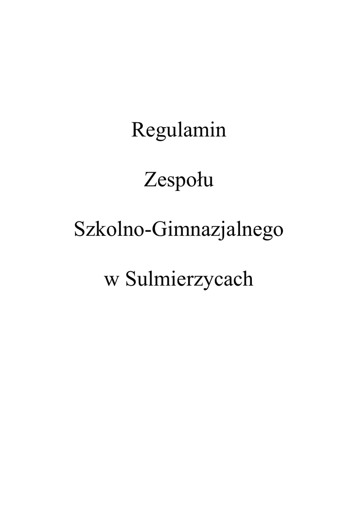 Regulamin Zespołu Szkolno-Gimnazjalnego w Sulmierzycach I. Zasady pobytu ucznia w szkole 1. Uczeń jest zobowiązany przez cały czas pobytu w szkole, tj. od rozpoczęcia zajęć do ich zakończenia, do pozostawania na jej terenie. 2. Uczniowie przychodzą do szkoły najwcześniej 20 minut przed rozpoczęciem pierwszej lekcji (nie dotyczy to uczniów dowożonych). 3. Uczniowie dowożeni, po przyjeździe do szkoły, idą przebrać się do szatni, po czym bezpośrednio udają się na świetlicę, bądź do biblioteki, gdzie przebywają do godziny 7.40 – tj. do czasu rozpoczęcia dyżurów przez nauczycieli. 4. Po przyjściu do szkoły uczniowie mają obowiązek pozostawienia okrycia wierzchniego i obuwia zmienionego w szatni lub szafkach. 5. Bezpośrednio po dzwonku na lekcje uczniowie udają się pod wyznaczoną klasę i oczekują na przyjście nauczyciela. 6. Przed zajęciami wychowania fizycznego uczniowie wchodzą do szatni w celu przebrania się nie wcześniej niż 5 minut przed dzwonkiem na lekcję. 7. Uczniowie nie mają prawa opuszczać sal lekcyjnych bez zgody nauczyciela i przebywać podczas lekcji na korytarzu szkolnym. 8. W czasie przerw zabrania się: biegania po korytarzach, skakania po schodach, popychania się nawzajem, siadania na parapetach okiennych, otwierania okien i wychylania się przez nie, przebywania w klasach, sali gimnastycznej, szatniach, przesiadywania w toaletach, jazdy na rowerach i innych pojazdach wokół budynku szkolnego, a także wszelkich innych zachowań noszących znamiona niebezpieczeństwa. 9. Zabrania się uczniom przebywania na parkingu szkolnym i na terenie wokół domu nauczyciela. 10. W czasie przerw z placu zabaw mogą korzystać uczniowie klas I-V szkoły podstawowej. 11. Zabrania się uczniom palenia papierosów, spożywania alkoholu, używania środków odurzających. 12. Uczniom nie wolno wnosić na teren szkoły przedmiotów zagrażających bezpieczeństwu i życiu ich i innych osób. 13. Uczeń po zakończeniu planowanych zajęć lekcyjnych oczekujący na rozpoczęcie zajęć pozalekcyjnych do chwili ich rozpoczęcia przebywa w świetlicy szkolnej lub w bibliotece. 2 14. Uczniowie mają obowiązek szanować mienie szkolne, sprzęt i pomoce naukowe. 15. Zobowiązuje się uczniów do zachowania czystości w salach, toaletach, na korytarzach i w pozostałych miejscach na terenie placówki. 16. Za szkody wyrządzone przez dzieci na terenie szkoły odpowiadają i ponoszą konsekwencje finansowe rodzice (prawni opiekunowie). 17. Szkoła nie odpowiada za przedmioty będące własnością ucznia, których posiadanie w szkole jest zbędne np. przedmioty wartościowe, pieniądze, biżuterię, telefon komórkowy, sprzęt elektroniczny. 18. Każdy uczeń szkoły zobowiązany jest do kulturalnego zachowania się, okazywania szacunku dorosłym i swoim kolegom. II. Zwalnianie z zajęć i opuszczanie terenu szkoły. 1. Zwolnić ucznia z lekcji może tylko rodzic (prawny opiekun) odbierając go ze szkoły osobiście w sytuacjach spowodowanych: 1) chorobą, 2) specjalistycznymi badaniami lekarskimi, 3) ważną przyczyną losową. 2. W wyjątkowych sytuacjach uczeń może być zwolniony z zajęć przez wychowawcę, nauczyciela danych zajęć lub dyrektora szkoły na podstawie pisemnego oświadczenia rodziców. Załącznik nr1 3. Nauczyciel nie może zwalniać ucznia z zajęć lekcyjnych na podstawie rozmowy telefonicznej z rodzicem (prawnym opiekunem). 4. Uczeń, który nie uczęszcza na zajęcia religii lub wychowania do życia w rodzinie, w czasie prowadzenia tych zajęć przebywa w świetlicy lub bibliotece szkolnej. Jeżeli są to lekcje pierwsze lub ostatnie dla ucznia – to na pisemną prośbę rodzica uczeń może przyjść na późniejsze godziny lekcyjne lub zostać zwolnionym do domu (w przypadku końcowych lekcji). Załącznik nr 2 5. Uczniowie posiadający ważne zaświadczenie lekarskie lub pisemne usprawiedliwienie rodzica, mogą być zwolnieni z zajęć wychowania fizycznego, ale muszą przebywać na terenie szkoły, pod opieką nauczyciela. Wyjątek stanowią pierwsze i ostatnie lekcje, gdzie na pisemną prośbę rodzica (prawnego opiekuna), uczeń może przyjść dopiero na pozostałe lekcje lub zostać zwolniony do domu (w przypadku ostatnich lekcji). Załącznik nr 2 3 6. Uczniowie mogą opuszczać świetlicę szkolną tylko pod warunkiem wcześniejszego dostarczenia jej wychowawcom pisemnej zgody od rodzica (prawnego opiekuna). Załącznik nr 3 III. Zasady korzystania z telefonów komórkowych i innych urządzeń elektronicznych na terenie szkoły 1. W czasie zajęć uczniów obowiązuje zakaz używania telefonów i innych urządzeń elektronicznych (chyba, że wymaga tego zaplanowany przez nauczyciela tok lekcji). Niezastosowanie się do zakazu, wiąże się z zabraniem w/w urządzeń do depozytu, z którego mogą być odebrane tylko przez rodziców (prawnych opiekunów). 2. Uczeń przebywający na terenie szkoły w wyjątkowych sytuacjach może korzystać z telefonu komórkowego tylko w czasie przerwy w celu kontaktowania się. 3. Każdy uczeń ma prawo korzystania w uzasadnionych przypadkach z telefonu stacjonarnego w sekretariacie szkoły. 4. Na terenie szkoły zabrania się: nagrywania, filmowania, fotografowania. 5. Podczas uroczystości i imprez klasowych dopuszcza się używanie w/w urządzeń za zgodą nauczyciela i uczestników. 6. Imprezy, uroczystości i inne wydarzenia szkolne mogą rejestrować wyłącznie osoby wyznaczone przez dyrektora szkoły lub nauczyciela odpowiedzialnego za organizację imprezy. IV. Strój uczniowski i wygląd zewnętrzny 1. Uczniowie przychodzą do szkoły ubrani schludnie i estetycznie, strój musi zakrywać brzuch, dekolt, plecy, bieliznę osobistą. Spódnice i spodenki powinny mieć długość co najmniej do połowy uda. 2. Strój ucznia nie może zawierać elementów oznaczających przynależność do subkultur oraz agresywnych lub wulgarnych obrazów, symboli, haseł (w dowolnym języku