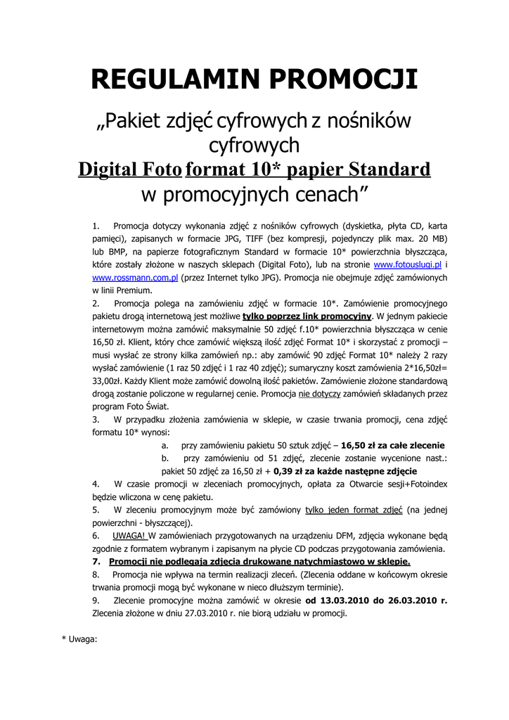REGULAMIN PROMOCJI „Pakiet zdjęć cyfrowych z nośników cyfrowych Digital Foto format 10* papier Standard w promocyjnych cenach” 1. Promocja dotyczy wykonania zdjęć z nośników cyfrowych (dyskietka, płyta CD, karta pamięci), zapisanych w formacie JPG, TIFF (bez kompresji, pojedynczy plik max. 20 MB) lub BMP, na papierze fotograficznym Standard w formacie 10* powierzchnia błyszcząca, które zostały złożone w naszych sklepach (Digital Foto), lub na stronie www.fotouslugi.pl i www.rossmann.com.pl (przez Internet tylko JPG). Promocja nie obejmuje zdjęć zamówionych w linii Premium. 2. Promocja polega na zamówieniu zdjęć w formacie 10*. Zamówienie promocyjnego pakietu drogą internetową jest możliwe tylko poprzez link promocyjny. W jednym pakiecie internetowym można zamówić maksymalnie 50 zdjęć f.10* powierzchnia błyszcząca w cenie 16,50 zł. Klient, który chce zamówić większą ilość zdjęć Format 10* i skorzystać z promocji – musi wysłać ze strony kilka zamówień np.: aby zamówić 90 zdjęć Format 10* należy 2 razy wysłać zamówienie (1 raz 50 zdjęć i 1 raz 40 zdjęć); sumaryczny koszt zamówienia 2*16,50zł= 33,00zł. Każdy Klient może zamówić dowolną ilość pakietów. Zamówienie złożone standardową drogą zostanie policzone w regularnej cenie. Promocja nie dotyczy zamówień składanych przez program Foto Świat. 3. W przypadku złożenia zamówienia w sklepie, w czasie trwania promocji, cena zdjęć formatu 10* wynosi: a. przy zamówieniu pakietu 50 sztuk zdjęć – 16,50 zł za całe zlecenie b. przy zamówieniu od 51 zdjęć, zlecenie zostanie wycenione nast.: pakiet 50 zdjęć za 16,50 zł + 0,39 zł za każde następne zdjęcie 4. W czasie promocji w zleceniach promocyjnych, opłata za Otwarcie sesji+Fotoindex będzie wliczona w cenę pakietu. 5. W zleceniu promocyjnym może być zamówiony tylko jeden format zdjęć (na jednej powierzchni - błyszczącej). 6. UWAGA! W zamówieniach przygotowanych na urządzeniu DFM, zdjęcia wykonane będą zgodnie z formatem wybranym i zapisanym na płycie CD podczas przygotowania zamówienia. 7. 8. Promocji nie podlegają zdjęcia drukowane natychmiastowo w sklepie. Promocja nie wpływa na termin realizacji zleceń. (Zlecenia oddane w końcowym okresie trwania promocji mogą być wykonane w nieco dłuższym terminie). 9. Zlecenie promocyjne można zamówić w okresie od 13.03.2010 do 26.03.2010 r. Zlecenia złożone w dniu 27.03.2010 r. nie biorą udziału w promocji. * Uwaga: Obraz z nośnika przenoszony jest na papier w pełni, dlatego też format zdjęć (jego długość) uzależniony jest od rodzaju matrycy aparatu fotograficznego (stosunku boków obrazu zapisanego na przesłanym nośniku), np.: - jeśli stosunek boków obrazu zapisanego na nośniku wynosi 3 do 4 to zdjęcie zamówione jako Format 10 będzie miało rzeczywisty wymiar 10x13,3 cm. - jeśli stosunek boków obrazu zapisanego na nośniku wynosi 2 do 3 to zdjęcie zamówione jako Format 10 będzie miało rzeczywisty wymiar 10x15 cm. 2 - -