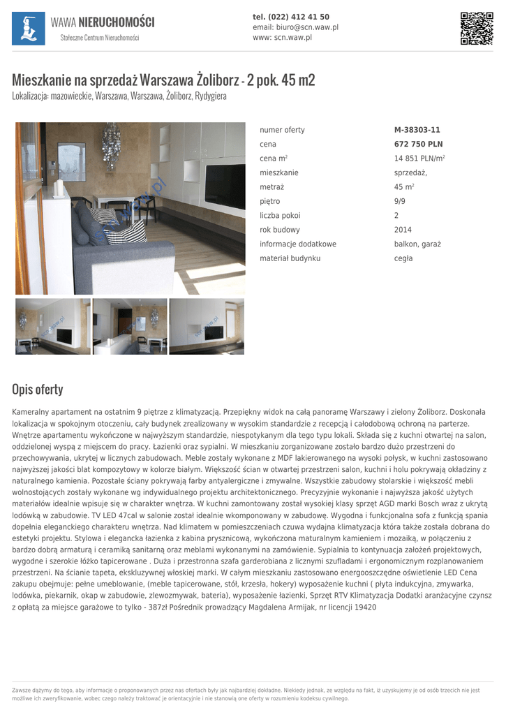 tel. (022) 412 41 50 email: [email protected] www: scn.waw.pl Mieszkanie na sprzedaż Warszawa Żoliborz - 2 pok. 45 m2 Lokalizacja: mazowieckie, Warszawa, Warszawa, Żoliborz, Rydygiera numer oferty M-38303-11 cena 672 750 PLN cena m 14 851 PLN/m2 mieszkanie sprzedaż, metraż 45 m2 piętro 9/9 liczba pokoi 2 rok budowy 2014 informacje dodatkowe balkon, garaż materiał budynku cegła 2 Opis oferty Kameralny apartament na ostatnim 9 piętrze z klimatyzacją. Przepiękny widok na całą panoramę Warszawy i zielony Żoliborz. Doskonała lokalizacja w spokojnym otoczeniu, cały budynek zrealizowany w wysokim standardzie z recepcją i całodobową ochroną na parterze. Wnętrze apartamentu wykończone w najwyższym standardzie, niespotykanym dla tego typu lokali. Składa się z kuchni otwartej na salon, oddzielonej wyspą z miejscem do pracy. Łazienki oraz sypialni. W mieszkaniu zorganizowane zostało bardzo dużo przestrzeni do przechowywania, ukrytej w licznych zabudowach. Meble zostały wykonane z MDF lakierowanego na wysoki połysk, w kuchni zastosowano najwyższej jakości blat kompozytowy w kolorze białym. Większość ścian w otwartej przestrzeni salon, kuchni i holu pokrywają okładziny z naturalnego kamienia. Pozostałe ściany pokrywają farby antyalergiczne i zmywalne. Wszystkie zabudowy stolarskie i większość mebli wolnostojących zostały wykonane wg indywidualnego projektu architektonicznego. Precyzyjnie wykonanie i najwyższa jakość użytych materiałów idealnie wpisuje się w charakter wnętrza. W kuchni zamontowany został wysokiej klasy sprzęt AGD marki Bosch wraz z ukrytą lodówką w zabudowie. TV LED 47cal w salonie został idealnie wkomponowany w zabudowę. Wygodna i funkcjonalna sofa z funkcją spania dopełnia eleganckiego charakteru wnętrza. Nad klimatem w pomieszczeniach czuwa wydajna klimatyzacja która także została dobrana do estetyki projektu. Stylowa i elegancka łazienka z kabina prysznicową, wykończona maturalnym kamieniem i mozaiką, w połączeniu z bardzo dobrą armaturą i ceramiką sanitarną oraz meblami wykonanymi na zamówienie. Sypialnia to kontynuacja założeń projektowych, wygodne i szerokie łóżko tapicerowane . Duża i przestronna szafa garderobiana z licznymi szufladami i ergonomicznym rozplanowaniem przestrzeni. Na ścianie tapeta, ekskluzywnej włoskiej marki. W całym mieszkaniu zastosowano energooszczędne oświetlenie LED Cena zakupu obejmuje: pełne umeblowanie, (meble tapicerowane, stół, krzesła, hokery) wyposażenie kuchni ( płyta indukcyjna, zmywarka, lodówka, piekarnik, okap w zabudowie, zlewozmywak, bateria), wyposażenie łazienki, Sprzęt RTV Klimatyzacja Dodatki aranżacyjne czynsz z opłatą za miejsce garażowe to tylko - 387zł Pośrednik prowadzący Magdalena Armijak, nr licencji 19420 Zawsze dążymy do tego, aby informacje o proponowanych przez nas ofertach były jak najbardziej dokładne. Niekiedy jednak, ze względu na fakt, iż uzyskujemy je od osób trzecich nie jest możliwe ich zweryfikowanie, wobec czego należy traktować je orientacyjnie i nie stanowią one oferty w rozumieniu kodeksu cywilnego. tel. (022) 412 41 50 email: [email protected] www: scn.waw.pl Lokalizacja Osoba kontaktowa Łukasz Kołakowski województwo mazowieckie powiat Warszawa [email protected] miasto Warszawa dzielnica Żoliborz ulica Rydygiera Chętnie udzielę dodatkowych informacji związanych z tą ofertą. Zapraszam do kontaktu! tel. 725 56 56 04 Zawsze dążymy do tego, aby informacje o proponowanych przez nas ofertach były jak najbardziej dokładne. Niekiedy jednak, ze względu na fakt, iż uzyskujemy je od osób trzecich nie jest możliwe ich zweryfikowanie, wobec czego należy traktować je orientacyjnie i nie stanowią one oferty w rozumieniu kodeksu cywilnego.
