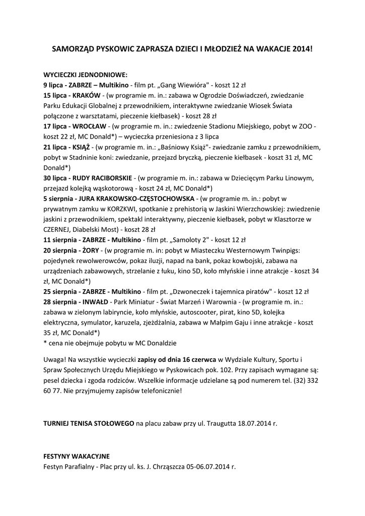 SAMORZĄD PYSKOWIC ZAPRASZA DZIECI I MŁODZIEŻ NA WAKACJE 2014! WYCIECZKI JEDNODNIOWE: 9 lipca - ZABRZE – Multikino - film pt. „Gang Wiewióra" - koszt 12 zł 15 lipca - KRAKÓW - (w programie m. in.: zabawa w Ogrodzie Doświadczeń, zwiedzanie Parku Edukacji Globalnej z przewodnikiem, interaktywne zwiedzanie Wiosek Świata połączone z warsztatami, pieczenie kiełbasek) - koszt 28 zł 17 lipca - WROCŁAW - (w programie m. in.: zwiedzenie Stadionu Miejskiego, pobyt w ZOO koszt 22 zł, MC Donald*) – wycieczka przeniesiona z 3 lipca 21 lipca - KSIĄŻ - (w programie m. in.: „Baśniowy Książ"- zwiedzanie zamku z przewodnikiem, pobyt w Stadninie koni: zwiedzanie, przejazd bryczką, pieczenie kiełbasek - koszt 31 zł, MC Donald*) 30 lipca - RUDY RACIBORSKIE - (w programie m. in.: zabawa w Dziecięcym Parku Linowym, przejazd kolejką wąskotorową - koszt 24 zł, MC Donald*) 5 sierpnia - JURA KRAKOWSKO-CZĘSTOCHOWSKA - (w programie m. in.: pobyt w prywatnym zamku w KORZKWI, spotkanie z prehistorią w Jaskini Wierzchowskiej: zwiedzenie jaskini z przewodnikiem, spektakl interaktywny, pieczenie kiełbasek, pobyt w Klasztorze w CZERNEJ, Diabelski Most) - koszt 28 zł 11 sierpnia - ZABRZE - Multikino - film pt. „Samoloty 2" - koszt 12 zł 20 sierpnia - ŻORY - (w programie m. in: pobyt w Miasteczku Westernowym Twinpigs: pojedynek rewolwerowców, pokaz iluzji, napad na bank, pokaz kowbojski, zabawa na urządzeniach zabawowych, strzelanie z łuku, kino 5D, koło młyńskie i inne atrakcje - koszt 34 zł, MC Donald*) 25 sierpnia - ZABRZE - Multikino - film pt. „Dzwoneczek i tajemnica piratów" - koszt 12 zł 28 sierpnia - INWAŁD - Park Miniatur - Świat Marzeń i Warownia - (w programie m. in.: zabawa w zielonym labiryncie, koło młyńskie, autoscooter, pirat, kino 5D, kolejka elektryczna, symulator, karuzela, zjeżdżalnia, zabawa w Małpim Gaju i inne atrakcje - koszt 35 zł, MC Donald*) * cena nie obejmuje pobytu w MC Donaldzie Uwaga! Na wszystkie wycieczki zapisy od dnia 16 czerwca w Wydziale Kultury, Sportu i Spraw Społecznych Urzędu Miejskiego w Pyskowicach pok. 102. Przy zapisach wymagane są: pesel dziecka i zgoda rodziców. Wszelkie informacje udzielane są pod numerem tel. (32) 332 60 77. Nie przyjmujemy zapisów telefonicznie! TURNIEJ TENISA STOŁOWEGO na placu zabaw przy ul. Traugutta 18.07.2014 r. FESTYNY WAKACYJNE Festyn Parafialny - Plac przy ul. ks. J. Chrząszcza 05-06.07.2014 r. Festyn dla dzieci - Plac zabaw przy ul. Traugutta 18.07.2014 r. Festyn Lokalny - Boisko sportowe w Dzierżnie 16-17.08.2014 r. Organizator zastrzega sobie prawo do zmiany programu wakacji!