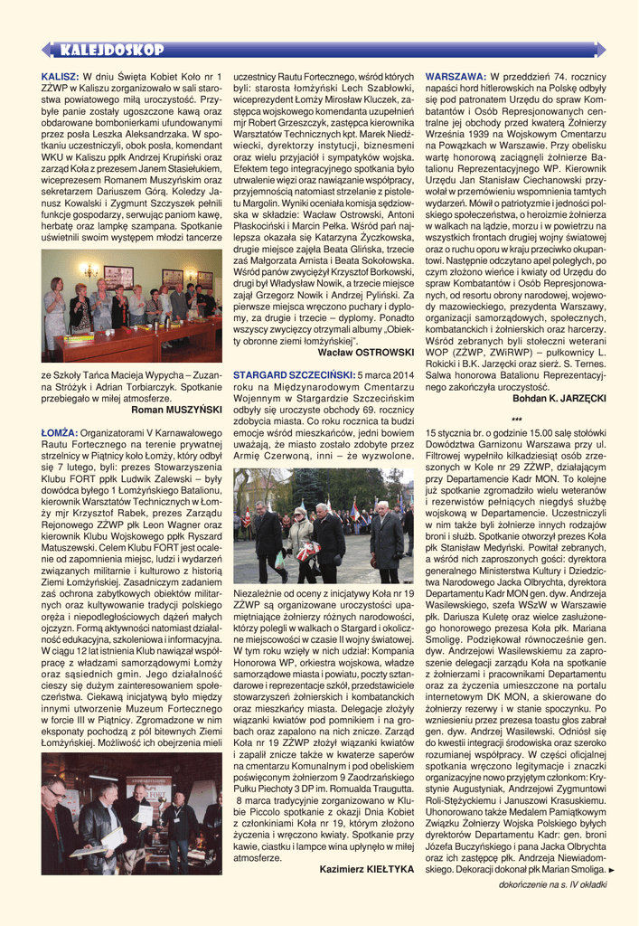 kalejdoskop KALISZ: W dniu Święta Kobiet Koło nr 1 ZŻWP w Kaliszu zorganizowało w sali starostwa powiatowego miłą uroczystość. Przybyłe panie zostały ugoszczone kawą oraz obdarowane bombonierkami ufundowanymi przez posła Leszka Aleksandrzaka. W spotkaniu uczestniczyli, obok posła, komendant WKU w Kaliszu ppłk Andrzej Krupiński oraz zarząd Koła z prezesem Janem Stasiełukiem, wiceprezesem Romanem Muszyńskim oraz sekretarzem Dariuszem Górą. Koledzy Janusz Kowalski i Zygmunt Szczyszek pełnili funkcje gospodarzy, serwując paniom kawę, herbatę oraz lampkę szampana. Spotkanie uświetnili swoim występem młodzi tancerze uczestnicy Rautu Fortecznego, wśród których byli: starosta łomżyński Lech Szabłowki, wiceprezydent Łomży Mirosław Kluczek, zastępca wojskowego komendanta uzupełnień mjr Robert Grzeszczyk, zastępca kierownika Warsztatów Technicznych kpt. Marek Niedźwiecki, dyrektorzy instytucji, biznesmeni oraz wielu przyjaciół i sympatyków wojska. Efektem tego integracyjnego spotkania było utrwalenie więzi oraz nawiązanie współpracy, przyjemnością natomiast strzelanie z pistoletu Margolin. Wyniki oceniała komisja sędziowska w składzie: Wacław Ostrowski, Antoni Płaskociński i Marcin Pełka. Wśród pań najlepsza okazała się Katarzyna Życzkowska, drugie miejsce zajęła Beata Glińska, trzecie zaś Małgorzata Arnista i Beata Sokołowska. Wśród panów zwyciężył Krzysztof Borkowski, drugi był Władysław Nowik, a trzecie miejsce zajął Grzegorz Nowik i Andrzej Pyliński. Za pierwsze miejsca wręczono puchary i dyplomy, za drugie i trzecie – dyplomy. Ponadto wszyscy zwycięzcy otrzymali albumy „Obiekty obronne ziemi łomżyńskiej”. Wacław OSTROWSKI ze Szkoły Tańca Macieja Wypycha – Zuzanna Stróżyk i Adrian Torbiarczyk. Spotkanie przebiegało w miłej atmosferze. Roman MUSZYŃSKI STARGARD SZCZECIŃSKI: 5 marca 2014 roku na Międzynarodowym Cmentarzu Wojennym w Stargardzie Szczecińskim odbyły się uroczyste obchody 69. rocznicy zdobycia miasta. Co roku rocznica ta budzi emocje wśród mieszkańców, jedni bowiem uważają, że miasto zostało zdobyte przez Armię Czerwoną, inni – że wyzwolone. ŁOMŻA: Organizatorami V Karnawałowego Rautu Fortecznego na terenie prywatnej strzelnicy w Piątnicy koło Łomży, który odbył się 7 lutego, byli: prezes Stowarzyszenia Klubu FORT ppłk Ludwik Zalewski – były dowódca byłego 1 Łomżyńskiego Batalionu, kierownik Warsztatów Technicznych w Łomży mjr Krzysztof Rabek, prezes Zarządu Rejonowego ZŻWP płk Leon Wagner oraz kierownik Klubu Wojskowego ppłk Ryszard Matuszewski. Celem Klubu FORT jest ocalenie od zapomnienia miejsc, ludzi i wydarzeń związanych militarnie i kulturowo z historią Ziemi Łomżyńskiej. Zasadniczym zadaniem zaś ochrona zabytkowych obiektów militarnych oraz kultywowanie tradycji polskiego oręża i niepodległościowych dążeń małych ojczyzn. Formą aktywności natomiast działalność edukacyjna, szkoleniowa i informacyjna. W ciągu 12 lat istnienia Klub nawiązał współpracę z władzami samorządowymi Łomży oraz sąsiednich gmin. Jego działalność cieszy się dużym zainteresowaniem społeczeństwa. Ciekawą inicjatywą było między innymi utworzenie Muzeum Fortecznego w forcie III w Piątnicy. Zgromadzone w nim eksponaty pochodzą z pól bitewnych Ziemi Łomżyńskiej. Możliwość ich obejrzenia mieli Niezależnie od oceny z inicjatywy Koła nr 19 ZŻWP są organizowane uroczystości upamiętniające żołnierzy różnych narodowości, którzy polegli w walkach o Stargard i okoliczne miejscowości w czasie II wojny światowej. W tym roku wzięły w nich udział: Kompania Honorowa WP, orkiestra wojskowa, władze samorządowe miasta i powiatu, poczty sztandarowe i reprezentacje szkół, przedstawiciele stowarzyszeń żołnierskich i kombatanckich oraz mieszkańcy miasta. Delegacje złożyły wiązanki kwiatów pod pomnikiem i na grobach oraz zapalono na nich znicze. Zarząd Koła nr 19 ZŻWP złożył wiązanki kwiatów i zapalił znicze także w kwaterze saperów na cmentarzu Komunalnym i pod obeliskiem poświęconym żołnierzom 9 Zaodrzańskiego Pułku Piechoty 3 DP im. Romualda Traugutta. 8 marca tradycyjnie zorganizowano w Klubie Piccolo spotkanie z okazji Dnia Kobiet z członkiniami Koła nr 19, którym złożono życzenia i wręczono kwiaty. Spotkanie przy kawie, ciastku i lampce wina upłynęło w miłej atmosferze. Kazimierz KIEŁTYKA WARSZAWA: W przeddzień 74. rocznicy napaści hord hitlerowskich na Polskę odbyły się pod patronatem Urzędu do spraw Kombatantów i Osób Represjonowanych centralne jej obchody przed kwaterą Żołnierzy Września 1939 na Wojskowym Cmentarzu na Powązkach w Warszawie. Przy obelisku wartę honorową zaciągnęli żołnierze Batalionu Reprezentacyjnego WP. Kierownik Urzędu Jan Stanisław Ciechanowski przywołał w przemówieniu wspomnienia tamtych wydarzeń. Mówił o patriotyzmie i jedności polskiego społeczeństwa, o heroizmie żołnierza w walkach na lądzie, morzu i w powietrzu na wszystkich frontach drugiej wojny światowej oraz o ruchu oporu w kraju przeciwko okupantowi. Następnie odczytano apel poległych, po czym złożono wieńce i kwiaty od Urzędu do spraw Kombatantów i Osób Represjonowanych, od resortu obrony narodowej, wojewody mazowieckiego, prezydenta Warszawy, organizacji samorządowych, społecznych, kombatanckich i żołnierskich oraz harcerzy. Wśród zebranych byli stołeczni weterani WOP (ZŻWP, ZWiRWP) – pułkownicy L. Rokicki i B.K. Jarzęcki oraz sierż. S. Ternes. Salwa honorowa Batalionu Reprezentacyjnego zakończyła uroczystość. Bohdan K. JARZĘCKI *** 15 stycznia br. o godzinie 15.00 salę stołówki Dowództwa Garnizonu Warszawa przy ul. Filtrowej wypełniło kilkadziesiąt osób zrzeszonych w Kole nr 29 ZŻWP, działającym przy Departamencie Kadr MON. To kolejne już spotkanie zgromadziło wielu weteranów i rezerwistów pełniących niegdy