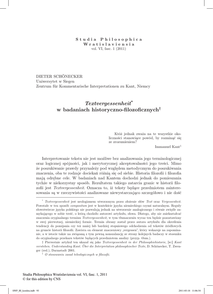 Studia Philosophica Wr a t i s l av i e n s i a vol. VI, fasc. 1 (2011) DIETER SCHÖNECKER Uniwersytet w Siegen Zentrum für Kommentarische Interpretationen zu Kant, Niemcy Textvergessenheit* w badaniach historyczno-filozoficznych† Któż jednak zważa na te wszystkie okoliczności stanowiące powód, by rozminąć się ze zrozumieniem? Immanuel Kant1 Interpretowanie tekstu nie jest możliwe bez analizowania jego terminologicznej oraz logicznej spójności, jak i merytorycznej akceptowalności jego treści. Mimo że poszukiwanie prawdy przynależy pod względem metodycznym do poszukiwania znaczenia, oba te rodzaje dociekań różnią się od siebie. Historia filozofii i filozofia mają odrębne cele. W badaniach nad Kantem dochodzi jednak do pomieszania tychże w niekorzystny sposób. Rezultatem takiego zatarcia granic w historii filozofii jest Textvergessenheit. Oznacza to, iż teksty będące przedmiotem zainteresowania są w rzeczywistości analizowane niewystarczająco szczegółowo i nie dość * Textvergessenheit jest neologizmem utworzonym przez złożenie słów Text oraz Vergessenheit. Powstałe w ten sposób compositum jest w kontekście języka niemieckiego czymś naturalnym. Reguły słowotwórcze języka polskiego nie pozwalają jednak na utworzenie analogicznego i równie zwięźle zamykającego w sobie treść, o którą chodziło autorowi artykułu, słowa. Dlatego, aby nie zniekształcać znaczenia oryginalnego terminu Textvergessenheit, w tym tłumaczeniu wyraz ten będzie pozostawiony w swej pierwotnej, niemieckiej formie. Termin obrany został przez autora artykułu dla określenia tendencji do pomijania czy też mniej lub bardziej stopniowego odchodzenia od tekstów źródłowych na gruncie historii filozofii. Zawiera on element znaczeniowy „vergessen”, który wskazuje na zapominanie, a w istocie także na związaną z tym pewną nonszalancję ze strony kolejnych badaczy w stosunku do oryginalnego przekazu tekstów będących przedmiotem analizy (przyp. tłum.). † Pierwotnie artykuł ten ukazał się jako Textvergessenheit in der Philosophiehistorie, [w:] Kant verstehen. Understanding Kant. Über die Interpretation philosophischer Texte, D. Schönecker, T. Zwenger (red.), Darmstadt 2001. 1 O stosowaniu zasad teleologicznych w filozofii. Studia Philosophica Wratislaviensia vol. VI, fasc. 1, 2011 © for this edition by CNS SWP_III_korekta.indb 93 2011-03-18 11:06:54 94 D. Schönecker, Textvergessenheit w badaniach historyczno-filozoficznych dokładnie, zarówno z perspektywy historycznej (kontekstowej), jak i genetycznej, uwzględniającej pochodzenie i ewolucję myśli; brakuje interpretacji komentarycznych, to znaczy popartych obszernym komentarzem, który powinien uzasadniać takie a nie inne rozumienie tekstu (kommentarische Interpretation**). Co zjawisko to dokładnie oznacza, pozostaje siłą rzeczy trudne do wyjaśnienia na płaszczyźnie abstrakcyjnej. Konieczne jest przedyskutowanie go na przykładach, a przykłady Textvergessenheit w badaniach historyczno-filozoficznych są w istocie łatwe do znalezienia. Stwierdzić można też, że nie są to przykłady pojedyncze czy odosobnione. Filozofia, podobnie jak wiele innych dyscyplin nauk humanistycznych, w znacznym stopniu wiąże się z czytaniem i interpretowaniem tekstów. Cokolwiek by to „czytanie” i „interpretowanie” oznaczało, a także czegokolwiek byśmy nie powiedzieli na temat „znaczenia”, „rekonstrukcji”, „intentional fallacy” itd. — odniesienie do tekstu jest konieczne. Chciałbym zastanowić się, a także zachęcić innych do zastanowienia się nad pytaniem, czy nie jest tak, że ten podstawowy akt odniesienia się do tekstu źródłowego w historii filozofii budzi zastrzeżenia. Przez historię filozofii rozumiem przy tym dziedzinę zajmującą się dziejami filozofii, w odróżnieniu od samej filozofii w dziejach. Historię filozofii odróżniam od systematycznej filozofii — rozumianej przeze mnie jako praktyka filozofów, w której chodzi o prawdziwość bądź fałszywość wywodów argumentacyjnych i teorii. Niezrozumienie różnicy między tymi dwiema dyscyplinami skutkuje brakiem dbałości o szczegóły czy też odniesienia tekstualne w pracy interpretatorskiej przynależnej historykom filozofii. Taki rodzaj zaniedbywania tekstu określam — może trochę przesadnie, mam nadzieję jednak, że przystępnie — niestosowanym dotychczas terminem Textvergessenheit. Rozpocznę przywołaniem przykładu z obszaru interpretacji Kanta, mając na celu pokazanie in concreto, co rozumiem przez „Textvergessenheit”. Sięgając do założeń programu przedstawionego przez Vaihingera, wykażę ponadto, że Textvergessenheit jest już od dawna problemem w badaniach nad Kantem (I). Pytanie o przyczynę takiego stanu rzeczy narzuca się samo. Choć problem ten nie może zostać tutaj wyczerpująco zbadany, zostanie jednak pokazane, że ma on związek z brakiem rozróżnienia między znaczeniem a prawdziwością (II). Po rozważaniach na ten temat powrócę do faktycznego stanu badań nad Kantem (III)2. ** Kommentarische Interpretation — interpretacja komentaryczna; określenie metody proponowanej przez D. Schöneckera w badaniach historyczno-filozoficznych, jak też tekstu badawczego tworzonego przy użyciu tej metody (przyp. tłum.). 2 Wcześniejsze wersje tego artykułu przedstawiłem na Uniwersytetach w Binghamton, Dundee, Halle i Irvine. Przy tych i innych okazjach brałem udział w wielu wartościowych dyskusjach, których uczestniczek i uczestników nie mogę tu wszystkich wymienić; chciałbym jednak wspomnieć następujące osoby: Bob Adams, Marcia Baron, Gregor Damschen, Rainer Enskat, Ursula Hamacher, Christian Illies, Salim Kemal, Bernd Kraft, Miriam Ossa, Anthony Preuss, Robert Schnepf, Richarde J. Schönecker, Ralf Stoecker, Jürgen Stolzenberg, Burkhard Tuschling, Thomas Zwenger. Za inspirujące rozmowy dziękuję także obu referentom konferencji w Bonn na
