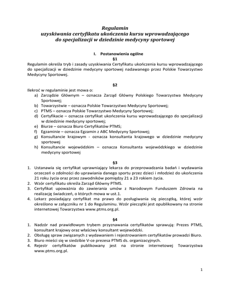 Regulamin uzyskiwania certyfikatu ukończenia kursu wprowadzającego do specjalizacji w dziedzinie medycyny sportowej I. Postanowienia ogólne §1 Regulamin określa tryb i zasady uzyskiwania Certyfikatu ukończenia kursu wprowadzającego do specjalizacji w dziedzinie medycyny sportowej nadawanego przez Polskie Towarzystwo Medycyny Sportowej. §2 Ilekroć w regulaminie jest mowa o: a) Zarządzie Głównym – oznacza Zarząd Główny Polskiego Towarzystwa Medycyny Sportowej; b) Towarzystwie – oznacza Polskie Towarzystwo Medycyny Sportowej; c) PTMS – oznacza Polskie Towarzystwo Medycyny Sportowej; d) Certyfikacie – oznacza certyfikat ukończenia kursu wprowadzającego do specjalizacji w dziedzinie medycyny sportowej; e) Biurze – oznacza Biuro Certyfikatów PTMS; f) Egzaminie – oznacza Egzamin z ABC Medycyny Sportowej; g) Konsultancie krajowym - oznacza konsultanta krajowego w dziedzinie medycyny sportowej h) Konsultancie wojewódzkim – oznacza Konsultanta wojewódzkiego w dziedzinie medycyny sportowej 1. 2. 3. 4. §3 Ustanawia się certyfikat uprawniający lekarza do przeprowadzania badań i wydawania orzeczeń o zdolności do uprawiania danego sportu przez dzieci i młodzież do ukończenia 21 roku życia oraz przez zawodników pomiędzy 21 a 23 rokiem życia. Wzór certyfikatu określa Zarząd Główny PTMS. Certyfikat upoważnia do zawierania umów z Narodowym Funduszem Zdrowia na realizację świadczeń, o których mowa w ust.1. Lekarz posiadający certyfikat ma prawo do posługiwania się pieczątką, której wzór określono w załączniku nr 1 do Regulaminu. Wzór pieczątki jest opublikowany na stronie internetowej Towarzystwa www.ptms.org.pl. §4 1. Nadzór nad prawidłowym trybem przyznawania certyfikatów sprawują: Prezes PTMS, konsultant krajowy oraz właściwy konsultant wojewódzki. 2. Obsługę spraw związanych z wydawaniem i rejestrowaniem certyfikatów prowadzi Biuro. 3. Biuro mieści się w siedzibie V-ce prezesa PTMS ds. organizacyjnych. 4. Rejestr certyfikatów publikowany jest na stronie internetowej Towarzystwa www.ptms.org.pl. 1 II. Warunki uzyskiwania certyfikatu §5 Certyfikat przyznaje Zarząd Główny na wniosek osoby zainteresowanej, po spełnieniu wymogów formalnych. §6 Certyfikat PTMS mogą uzyskać lekarze, którzy: 1. posiadają specjalizację w następujących dziedzinach medycyny: choroby wewnętrzne, pediatria, chirurgia ogólna, chirurgia dziecięca, ortopedia i traumatologia, rehabilitacja medyczna, medycyna rodzinna; 2. ukończyli kurs ABC medycyny sportowej - wprowadzenie do specjalizacji w dziedzinie medycyny sportowej, na podstawie programu specjalizacji w medycynie sportowej, zgodnie z harmonogramem kursu specjalizacyjnego lub kursu doskonalącego przyjętym corocznie przez Centrum Medyczne Kształcenia Podyplomowego i opublikowanym na stronie internetowej www.cmkp.edu.pl; 3. zdali egzamin ABC medycyny sportowej - wprowadzenie do specjalizacji w dziedzinie medycyny sportowej, którego warunki określa Zarząd Główny; 4. otrzymali pozytywną opinię konsultanta wojewódzkiego na podstawie odbytej rozmowy dotyczącej orzecznictwa sportowo-lekarskiego; 5. prowadzą działalność leczniczą w grupowej praktyce lekarskiej lub w ramach indywidualnej praktyki lekarskiej zarejestrowanej we właściwej dla miejsca zamieszkania okręgowej izbie lekarskiej w publicznym lub niepublicznym podmiocie leczniczym o profilu medycyna sportowa; 6. posiadają aktualne prawo wykonywania zawodu lekarza; 7. uiścili opłaty związane z odbyciem właściwych kursów, wydaniem oryginału lub duplikatu albo wznowieniem certyfikatu w wysokości określonej w załączniku nr 2 do Regulaminu. §7 Certyfikat może uzyskać lekarz, który nie jest członkiem PTMS. III. Obowiązki wynikające z posiadania certyfikatu §8 1. Lekarz, który posiada certyfikat jest zobowiązany do: a) przestrzegania przepisów w zakresie orzecznictwa sportowo-lekarskiego określonych przez Ministra Zdrowia; b) przedkładania corocznie do konsultanta wojewódzkiego oraz Biura Certyfikatów sprawozdań z bieżącej działalności, w których zawarto następujące dane: miejsce udzielania świadczeń, liczba udzielonych świadczeń, liczba wydanych orzeczeń, sposób prowadzenia i przechowywania dokumentacji medycznej; c) informowania konsultanta wojewódzkiego o każdorazowej zmianie miejsca udzielania świadczeń. 2. Lekarz, który posiada certyfikat wyraża zgodę na przeprowadzenie merytorycznej kontroli działalności oraz udostępnienia dokumentacji następującym podmiotom 2 upoważnionym do kontroli: konsultantowi krajowemu, konsultantowi wojewódzkiemu oraz upoważnionemu przez Zarząd Główny członkowi Zarządu Głównego. 3. Kontrolę w zakresie orzecznictwa sportowo-lekarskiego przeprowadza się zgodnie z przepisami prawa powszechnie obowiązującego. 1. 2. 3. 4. 5. 6. 7. 1. 2. 3. 4. 1. 2. 3. 4. IV. Tryb uzyskiwania certyfikatu §9 Wniosek o wydanie certyfikatu po zaopiniowaniu przez konsultanta wojewódzkiego należy przesłać do „Biura Certyfikatów”. Wzór wniosku oraz adres Biura opublikowane są na stronie internetowej Towarzystwa www.ptms.org.pl Wniosek należy złożyć w terminie do 30 dni od ogłoszenia wyników egzaminu. Rozpatrzenie następuje w terminie do 30 dni po wpłynięciu wniosku do Biura. W przypadku stwierdzenia uchybień formalnych we wniosku, certyfikat nie jest wydawany. Biuro przesyła certyfikat do właściwego konsultanta wojewódzkiego. Odbiór certyfikatu następuje u konsultanta wojewódzkiego, a w przypadku braku konsultanta wojewódzkiego u wiceprezesa ds. organizacyjnych PTMS. V. Termin ważności certyfikatu §10 Certyfikat wydaje się na okres 2 lat, z możliwością trzykrotnego przedłużenia. Warunkiem przedłużenia ważności certyfikatu na kolejne 2 lata jest: a) coroczne uczestnictwo w zjeździe naukowym lub w kongresie organizowanym przez PTMS; b) złożenie corocznego sprawozdania o realizacji świadczeń, których mowa w