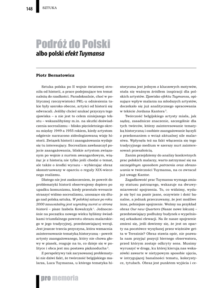 148 SZTUKA Podróż do Polski albo polski efekt Tuymansa Piotr Bernatowicz Sztuka polska po II wojnie światowej stroniła od historii, a prace podejmujące ten temat należą do rzadkości. Paradoksalnie, choć w politycznej rzeczywistości PRL-u odniesienia takie były szeroko obecne, artyści od historii się odwracali. Jeśliby chcieć szukać przyczyn tego zjawiska – a nie jest to celem niniejszego tekstu – wskazalibyśmy m.in. na skutki doświadczenia socrealizmu – blisko pięcioletniego okresu między 1949 a 1955 rokiem, kiedy artystom odgórnie narzucono zideologizowaną wizję historii. Związek historii i zaangażowania wydaje się tu interesujący. Socrealizm zawłaszczył pojęcie zaangażowania, bliskie artystom związanym po wojnie z nurtem awangardowym, wiążąc je z historią nie tylko jeśli chodzi o temat, ale także o środki wyrazu – wybierając obraz skonstruowany w oparciu o reguły XIX-wiecznego realizmu. Dlatego nie jest zaskoczeniem, że powrót do problematyki historii obserwujemy dopiero po upadku komunizmu, kiedy przestało wreszcie straszyć widmo socrealizmu, unoszące się długo nad polską sztuką. W polskiej sztuce po roku 2000 zauważalny jest wyraźny zwrot w stronę historii – pisze Izabela Kowalczyk 1. Jednocześnie na początku nowego wieku byliśmy świadkami triumfalnego powrotu obrazu malarskiego w jego tradycyjnej, przedstawiającej wersji. Jest jeszcze trzecia przyczyna, która wzmacnia zainteresowanie tematyką historyczną – powrót artysty zaangażowanego, który nie chowa głowy w piasek, reaguje na to, co dzieje się w polityce i obca jest mu postawa pięknoducha 2. Z perspektywy tak zarysowanej problematyki nie dziwi fakt, że twórczość belgijskiego malarza, Luca Tuymansa, u którego tematyka hi- pro memoria storyczna jest jednym z kluczowych motywów, stała się ważnym źródłem inspiracji dla polskich artystów. Zjawisko efektu Tuymansa, opisujące wpływ malarza na młodszych artystów, doczekało się już analitycznego opracowania w tekście Jordana Kantora 3. Twórczość belgijskiego artysty miała, jak sądzę, zasadnicze znaczenie, szczególnie dla tych twórców, którzy zainteresowanie tematyką historyczną i osobiste zaangażowanie łączyli z przekonaniem o wciąż aktualnej sile malarstwa. Wpłynęła też na fakt włączenia się tego tradycyjnego medium w szerszy nurt zainteresowań przeszłością. Zanim przejdziemy do analizy konkretnych prac polskich malarzy, warto zatrzymać się na szczególnym sposobem patrzenia oraz obrazowania w twórczości Tuymansa, na co zwracał już uwagę Kantor. Zagadkowość prac Tuymansa wymaga zmiany statusu patrzącego, wskazuje na dwuwymiarowość spojrzenia. To, co widzimy, wydaje się być na pozór jasne, oczywiste i dość banalne, a jednak przeczuwamy, że jest możliwe inne, pełniejsze spojrzenie. Weźmy na przykład obraz Our new Quarters (Nasze nowe lokum) – przedstawiający podłużny budynek o wypełnionej arkadami elewacji. Na ile nasze spojrzenie zmieni się, jeśli dowiemy się, że jest on oparty na pocztówce wysyłanej przez więźniów getta w Terezinie? Obraz stawia opór, nie pozwala nam przyjąć pozycji biernego obserwatora, przed którym zostaje odkryty sens. Musimy wyruszyć w drogę, ku której kierują nas wskazówki zawarte w nietypowym sposobie ujęcia, w intrygującej banalności tematu, kolorystyce, tytułach. Obraz jest punktem wyjścia i ce- Piotr Bernatowicz, Podróż do Polski… lem. Jego znaczenie zawiera się pomiędzy tymi dwoma punktami. By to wyjaśnić, posłużymy się literackim odniesieniem. Ostatnia książka niemieckiego pisarza W.G. Sebalda, zmarłego tragicznie w 2001 roku, opowiada niezwykłą historię Żyda o nazwisku Austerlitz. Podczas II wojny światowej pięcioletni Jacques Austerlitz trafia do Wielkiej Brytanii, gdzie adoptuje go rodzina walijskiego pastora. O swoim żydowskim pochodzeniu dowiaduje się późno, powoli zaczyna je rozumieć. Odbywa podróż w dwóch wymiarach: jest to fizyczna podróż do domu dzieciństwa, do Pragi, i jednocześnie w przeszłość. Pojmuje swoją fascynację architekturą dworców – obrazy, wizualne fragmenty i detale zawsze wydawały mu się znaczące, teraz to przeczute znaczenie się potwierdza. To niemi świadkowie tragicznej historii, która stała się udziałem Austerlitza. Sebald podąża jego śladem, staje się powiernikiem narracji Austerlitza, którą ilustrują liczne zdjęcia: kopuła Pałacu Sprawiedliwości w Brukseli, wnętrze biblioteki Austerlitza, stary plecak, dymiące fabryczne kominy, czarna i biała kula bilardowa, ukwiecona łąka, fragment podłużnego budynku w Terezinie o podzielonej arkadami elewacji. Czemu służą te ilustracje? Czy zmieniają one beletrystyczną opowieść w rodzaj biograficznej rozprawy udokumentowanej materiałem wizualnym? Czy jest to do końca fikcja? I kim jest tak naprawdę ów Austerlitz? Jednym z nielicznych ocalonych, który poniósł ogromną cenę za ocalenie – amputowanie przeszłości? A jednocześnie ta przeszłość go naznacza, każe cierpieć, wyzwala fantomowy ból. Dlaczego autor książki kończy narrację w tym miejscu, w którym ją rozpoczął i jednocześnie, po pożegnaniu się z Austerlitzem, sam kontynuuje jego podróż, która prowadzi teraz w przeszłość? Czyżby dawał nam do zrozumienia, że Austerlitz to nie realna postać fikcyjnej opowieści, ale część osoby autora? Postać ukryta w każdym z nas, którą musimy obudzić, jeśli chcemy odzyskać przeszłość, ożywić martwe obrazy. Dzięki temu zbudujemy narrację, odzyskamy opowieść, choć może nas ona przerazić. Pojednanie Pamiętam początek dyskusji o Jedwabnem. Byłem poirytowany, że ktoś psuje mi spokój. Przecież po 1989 roku nastąpiło jakieś pojednanie. I co mnie to właściwie obchodzi, co to za temat, o co ten krzyk? Mnie to nie dotyczy, bo to jest coś z pokolenia moich dziadków. Dopiero później doszło do mnie